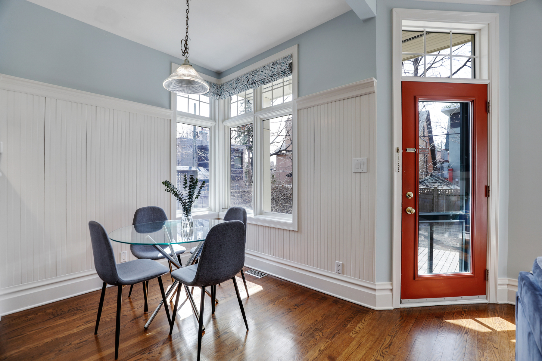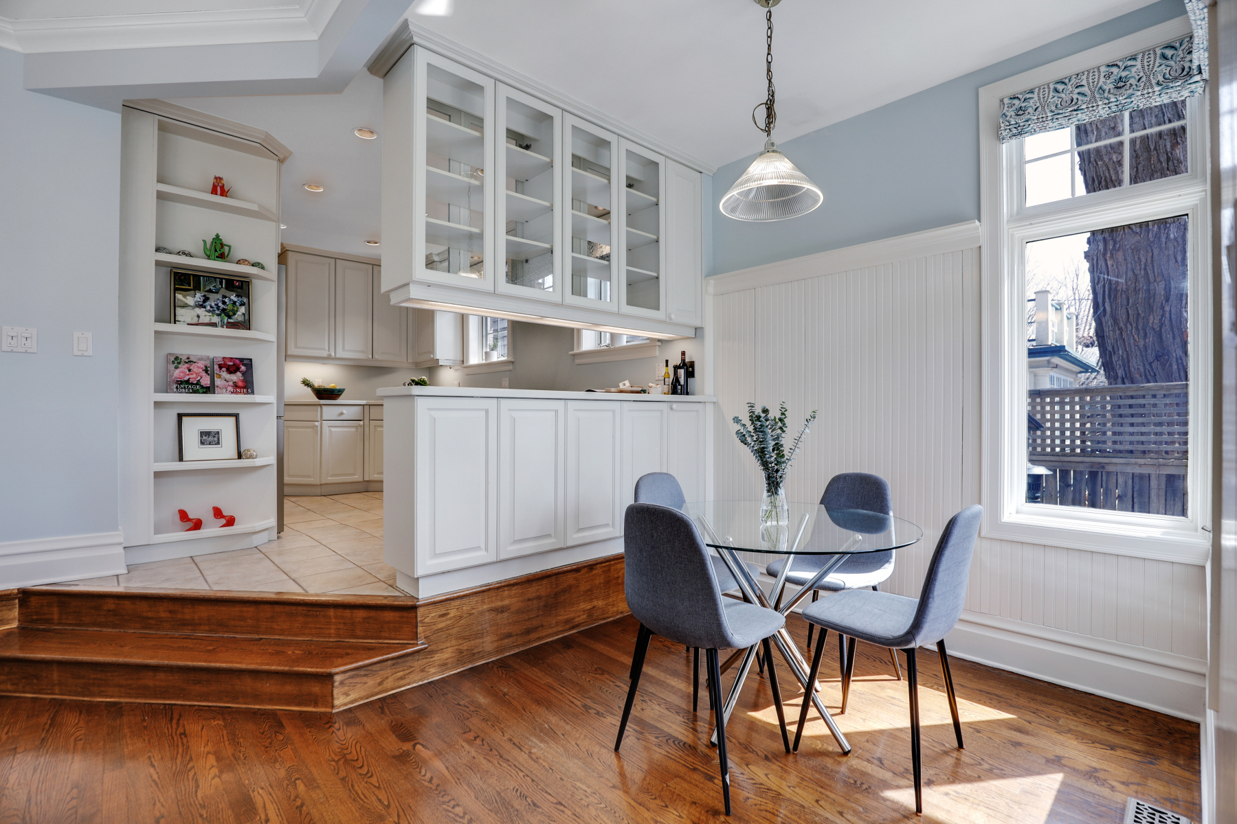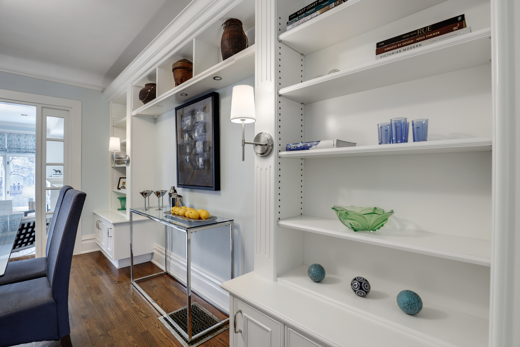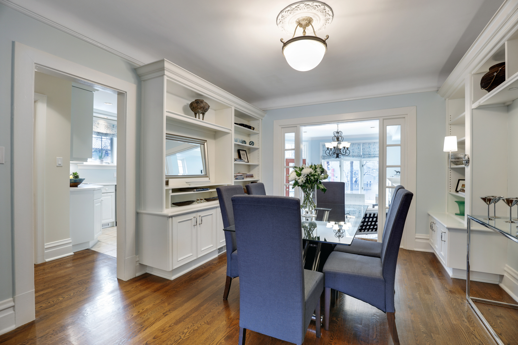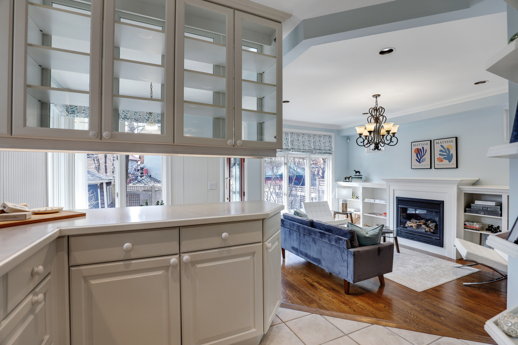 Designed with both entertaining and family living in mind, the floor plan effortlessly flows with two distinct main living areas divided by a refined formal dining room, accentuated by floor-to-ceiling display cases. An inviting sense of openness permeates the home, with sightlines extending seamlessly from the main living room through the dining area and family room, offering a seamless connection to the rear yard. The well-appointed kitchen, overlooking the rear addition, transitions gracefully into the charming breakfast room and family room, suffusing the space with natural light and providing a picturesque backdrop for morning gatherings. The breakfast room exudes charm with crisp white wainscoting complementing soft palette wall colors, creating an atmosphere of warmth.