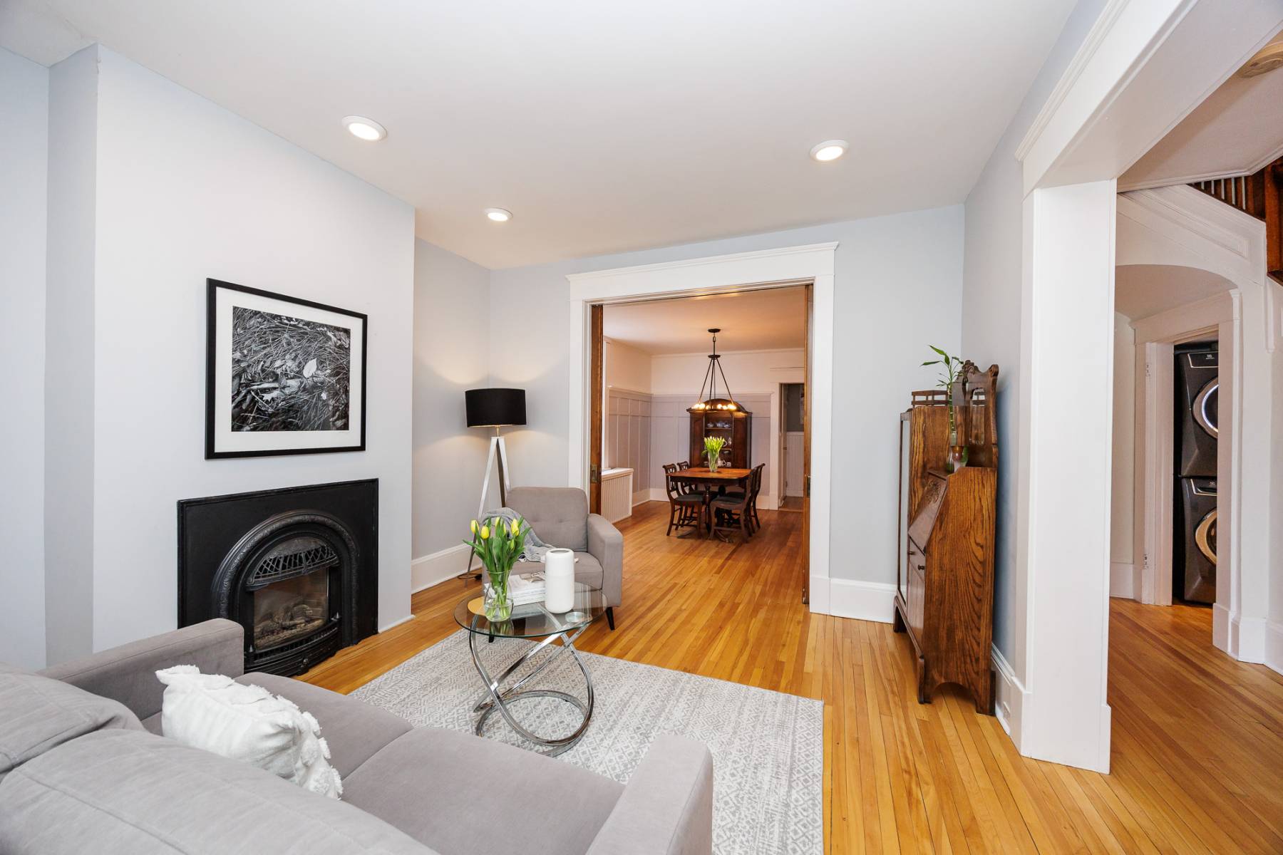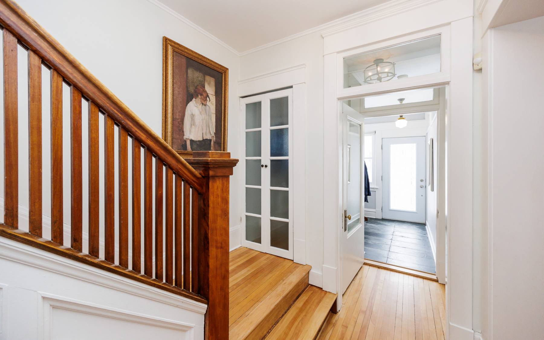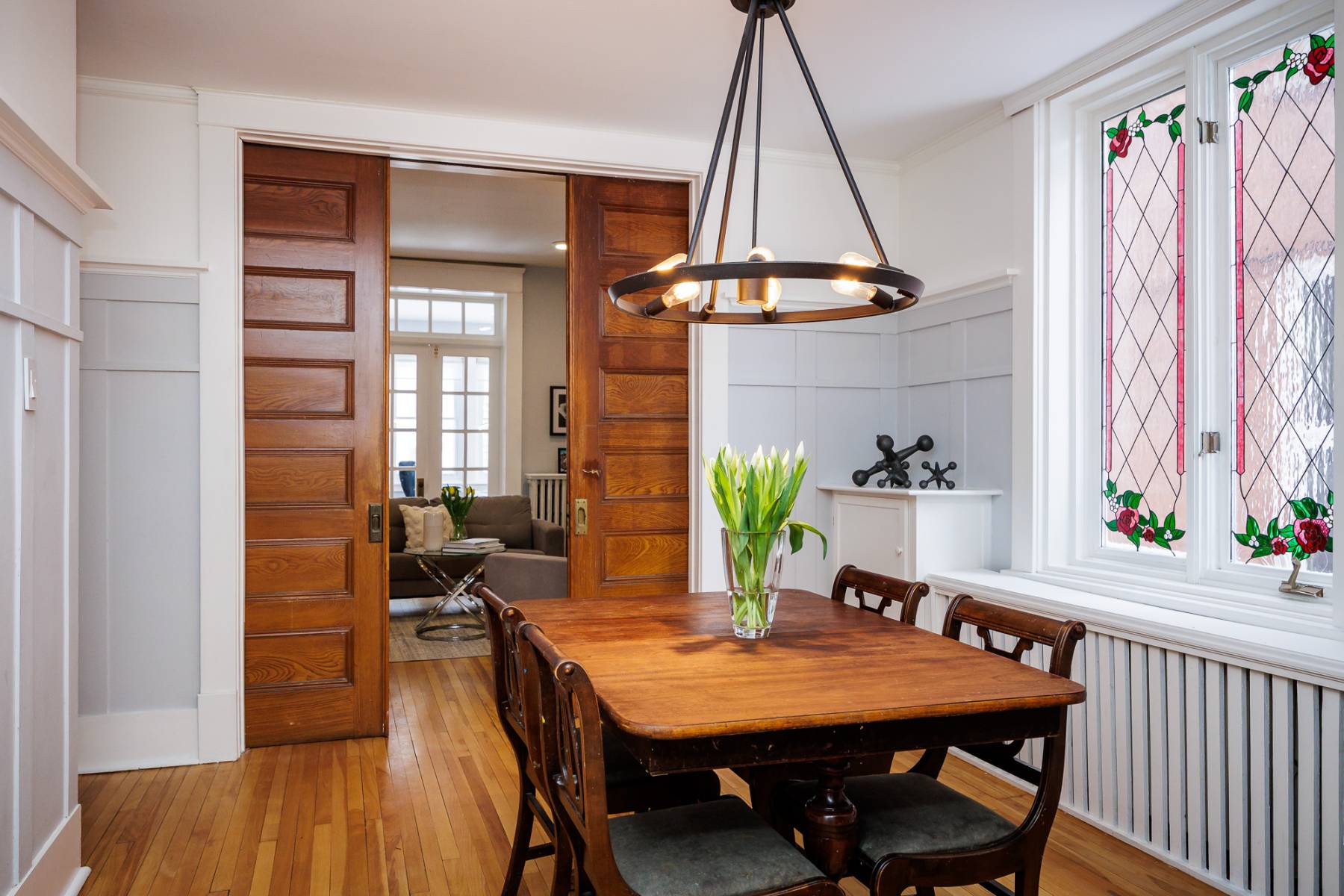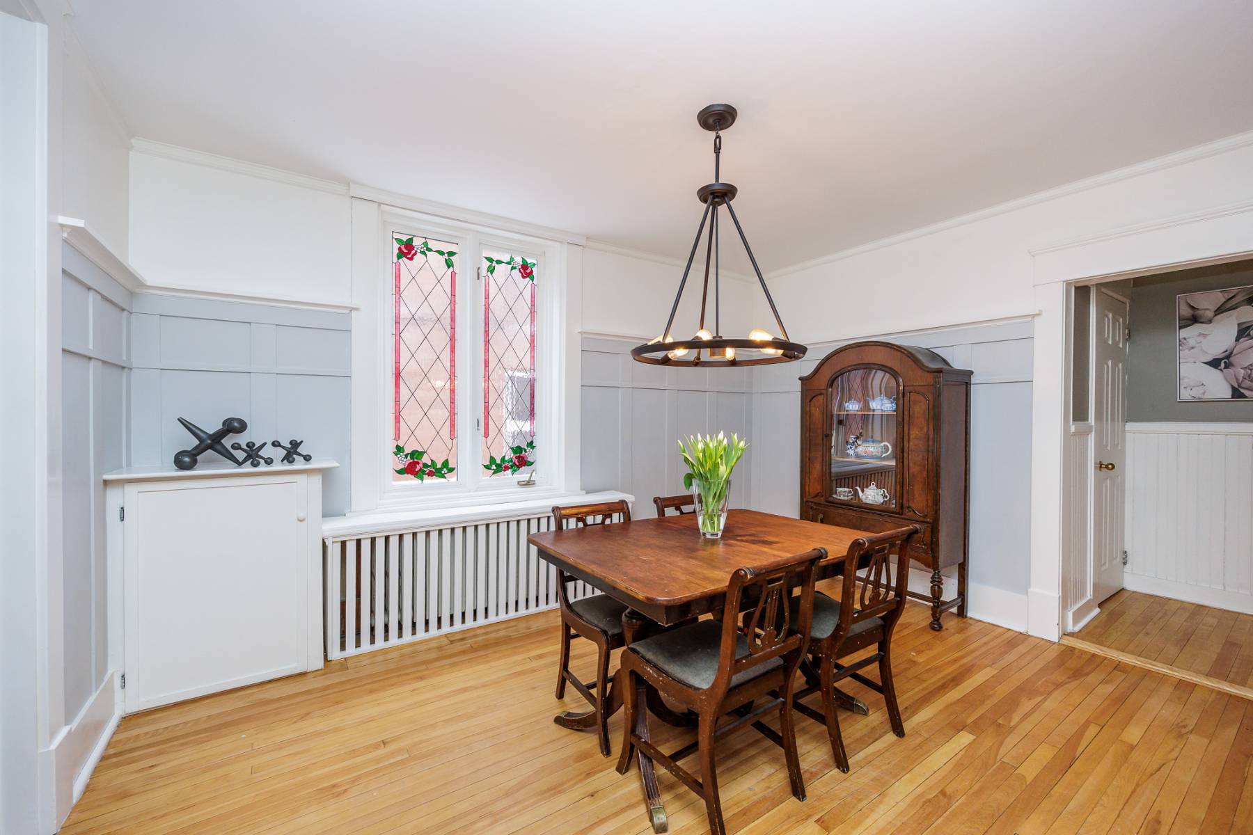 Step inside and immediately feel the warmth of this inviting space, where rich hardwood floors, high ceilings, and natural light flow throughout. The main floor boasts a spacious living room that opens into a charming front sunroom—ideal as a cozy sitting room or home office. The formal dining room is a ?so inviting, featuring elegant wainscoting and beautiful glass inserts that set the stage for both casual family dinners and sophisticated entertaining.