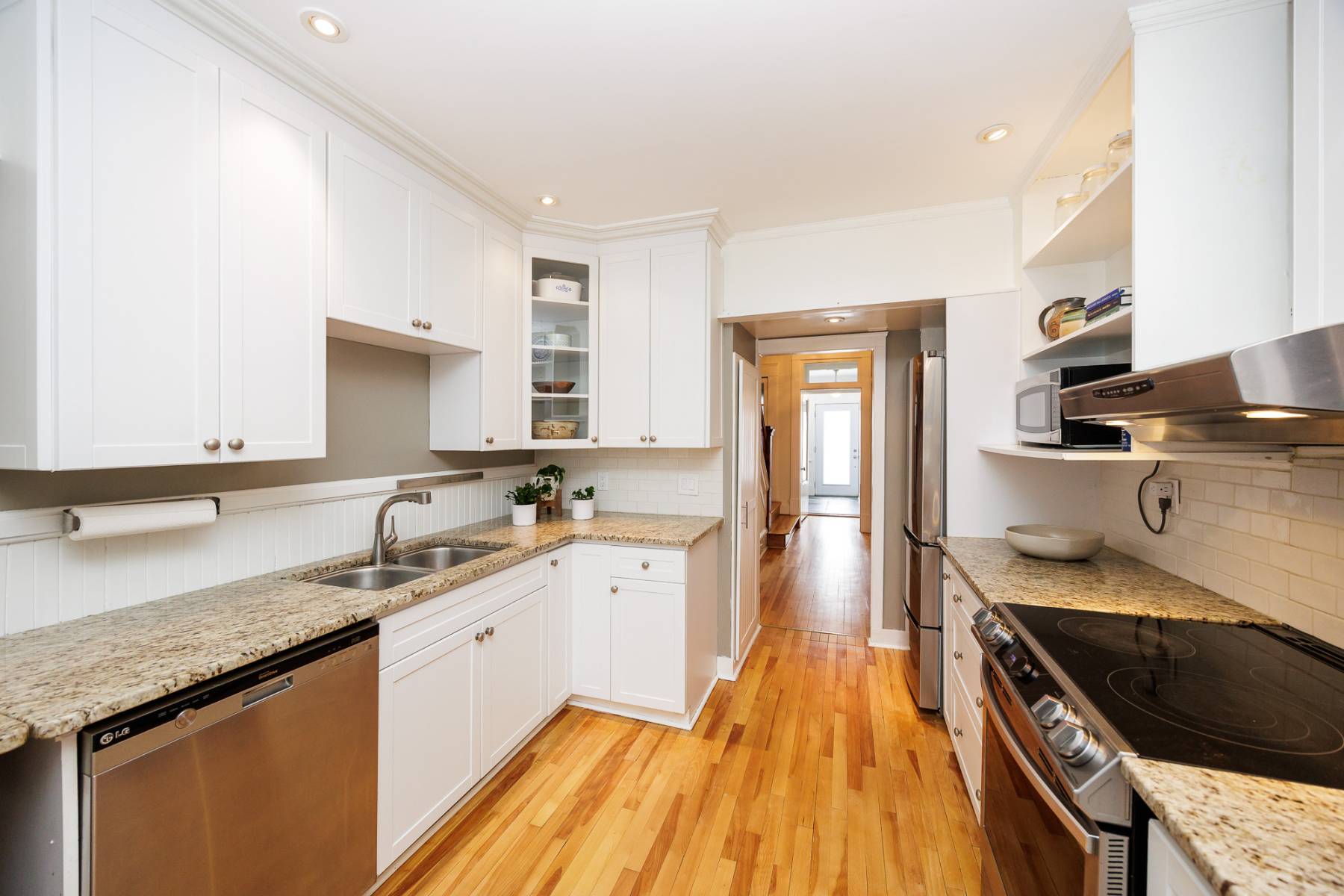 The galley-style kitchen is both efficient and stylish, with granite countertops, generous cabinet space, and everything you need just within reach. A rare, oversized foyer and convenient powder room complete the main level.