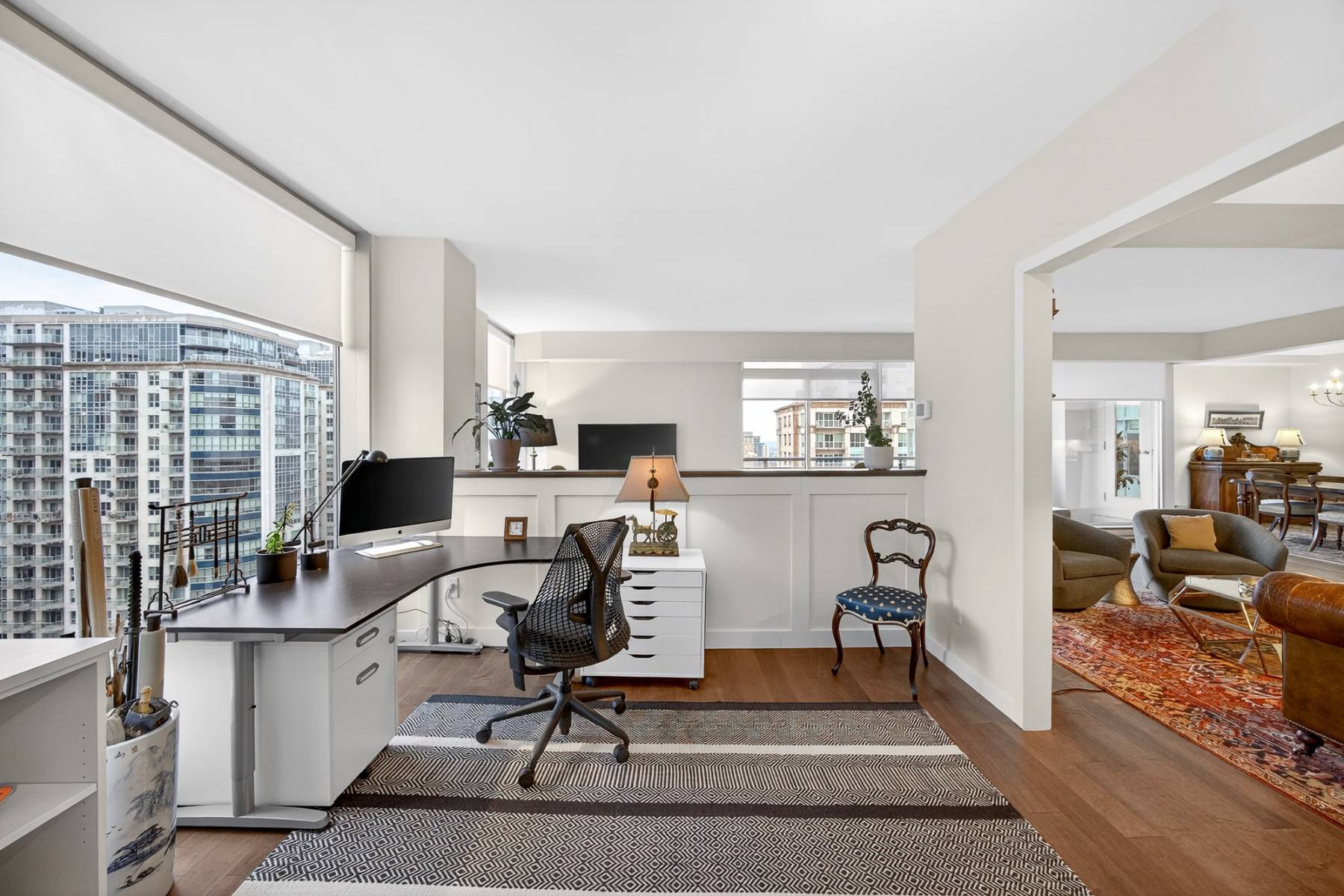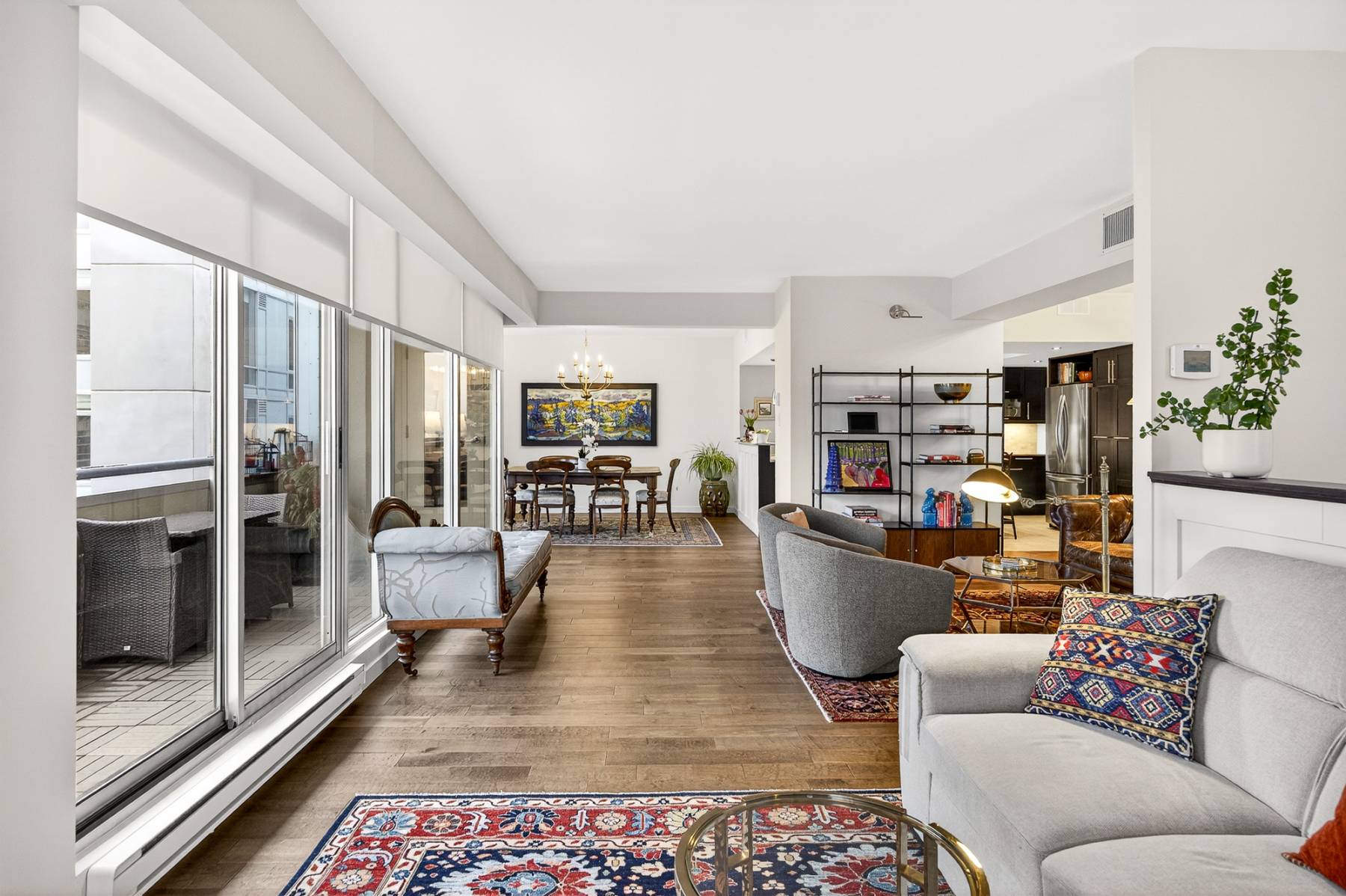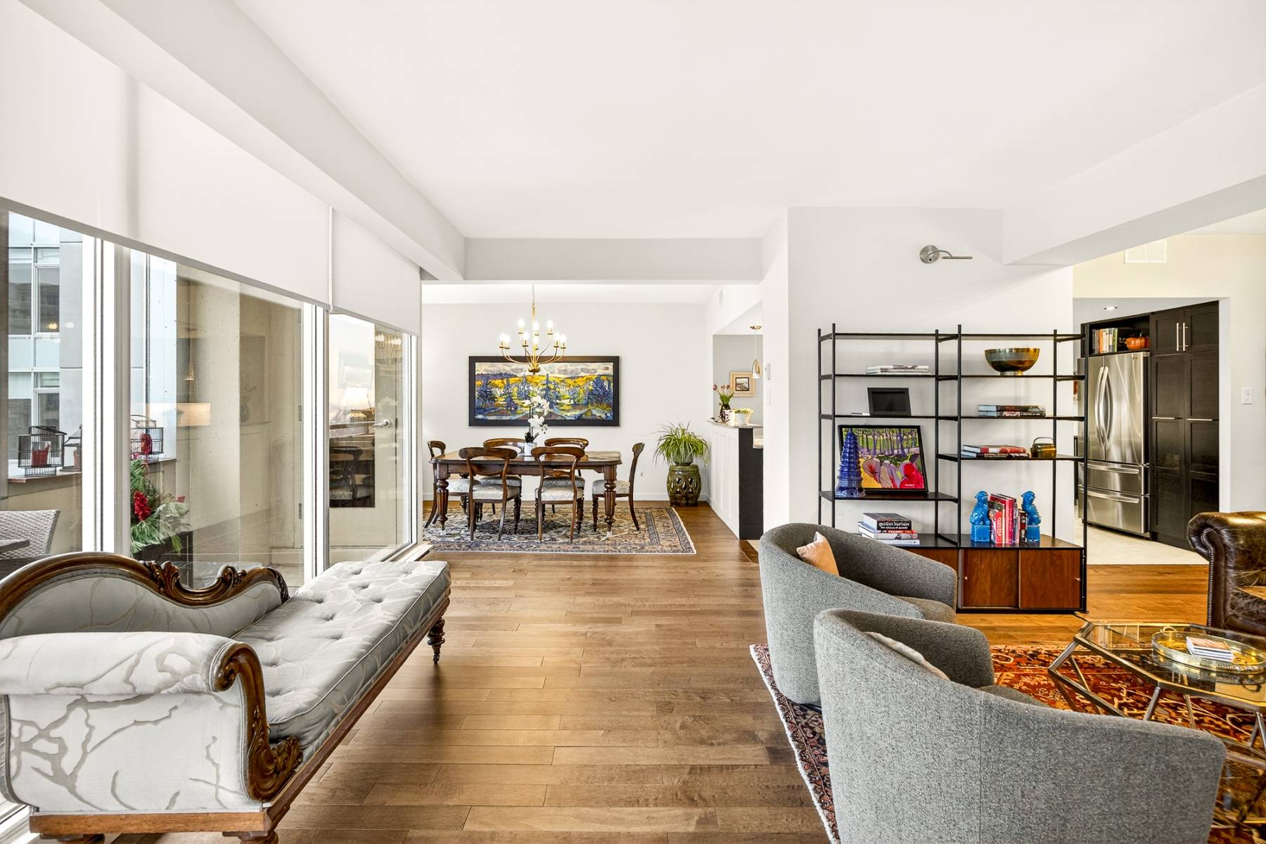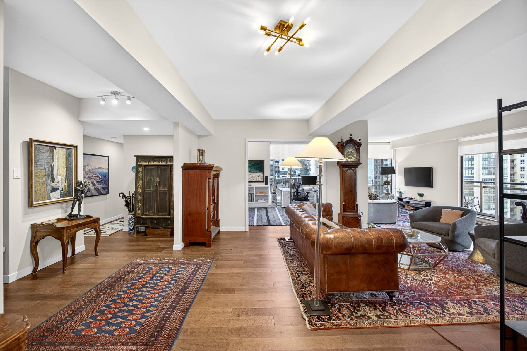 From the moment you enter, the spacious foyer sets the tone, welcoming you with natural light and an immediate connection to the surrounding cityscape. The main living areas unfold seamlessly, combining living, dining, kitchen, and family room spaces into one expansive, cohesive environment. Rich hardwood flooring grounds the interior, while oversized windows and balcony access enhance the sense of volume and flow—perfect for entertaining or simply enjoying everyday urban life.