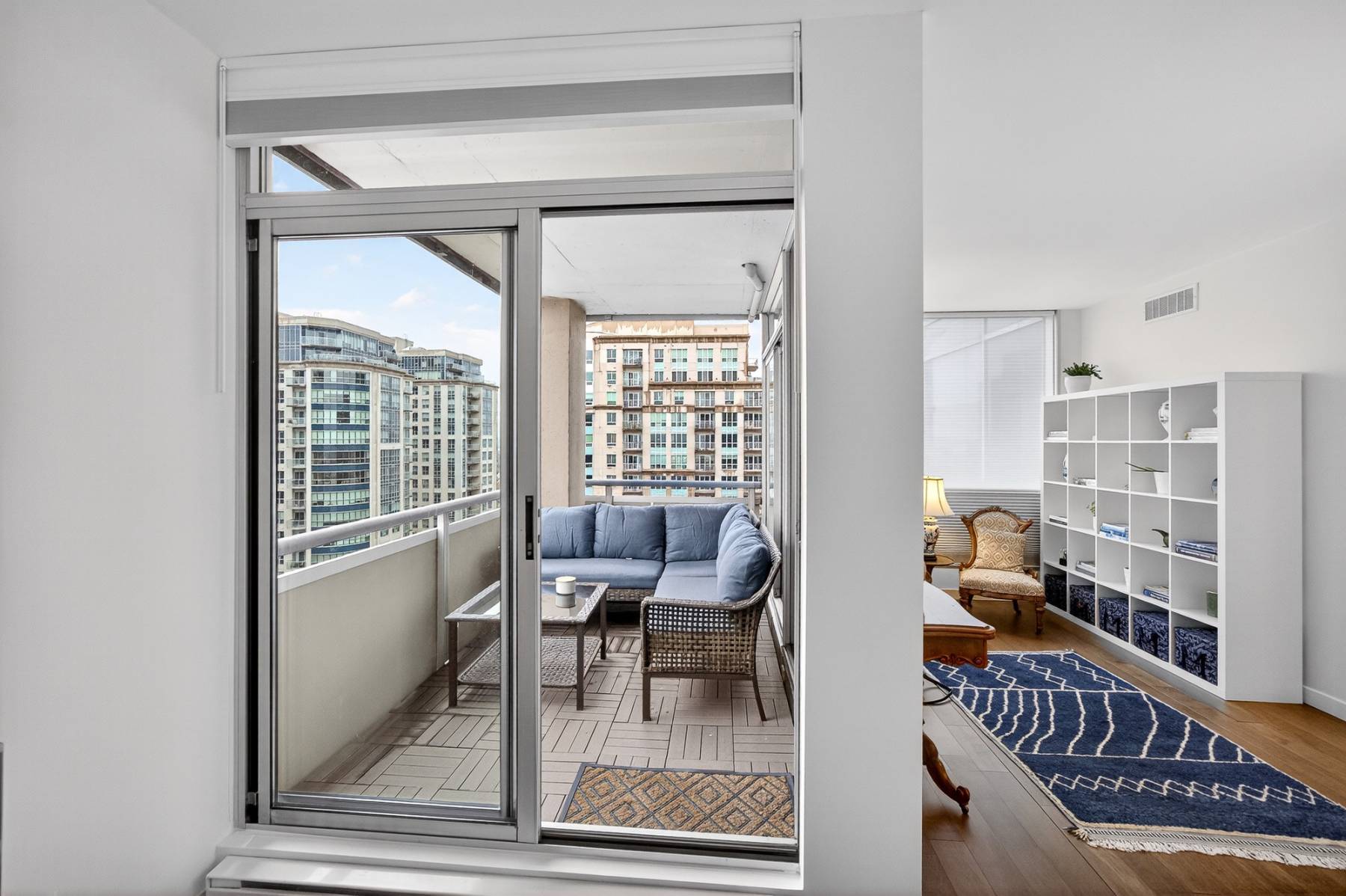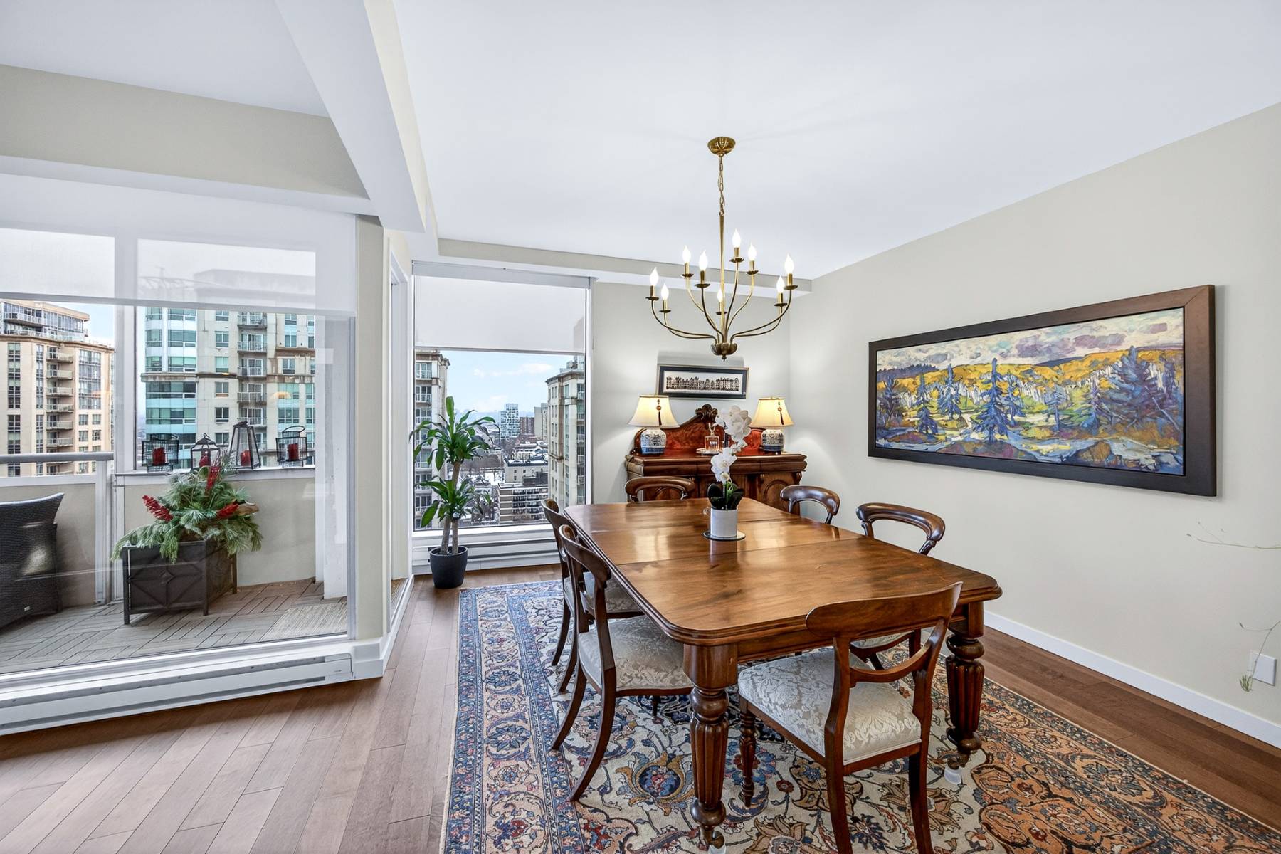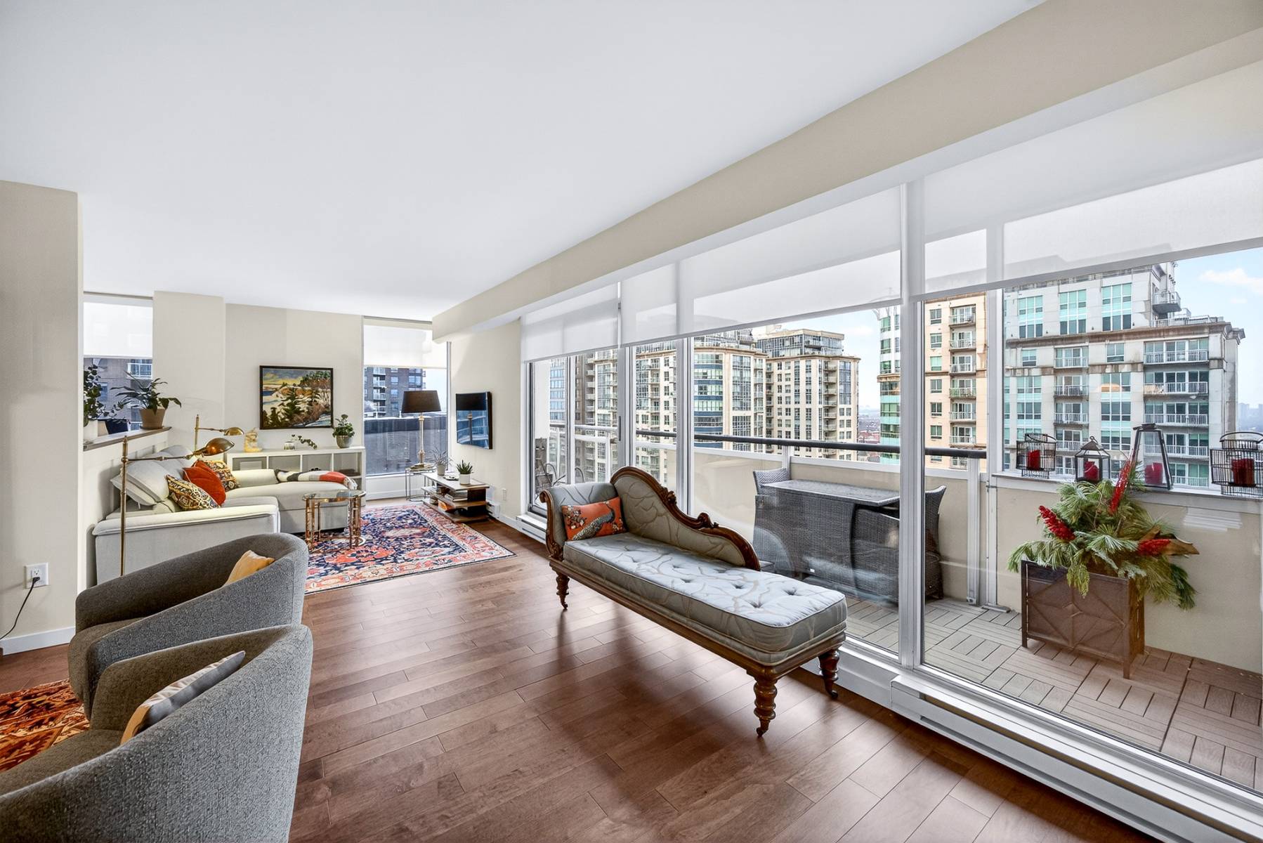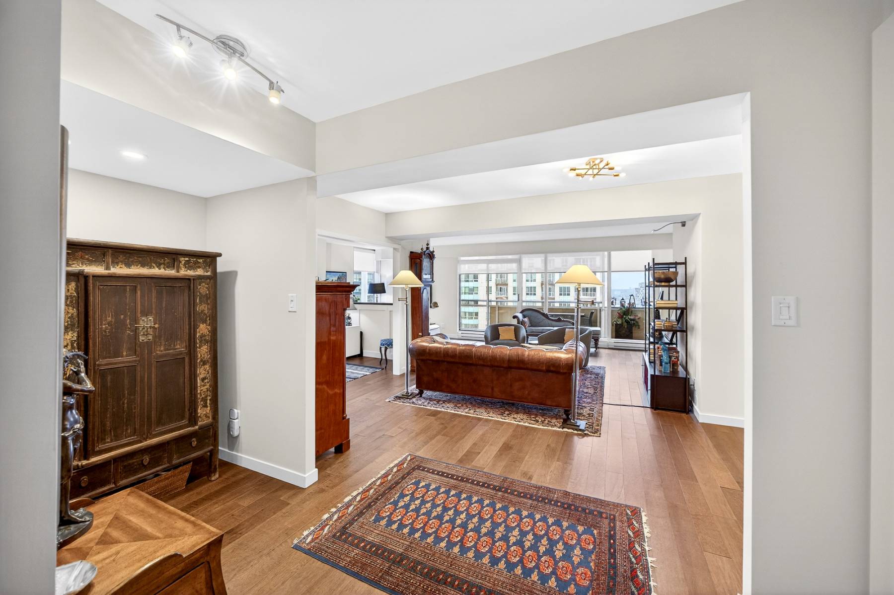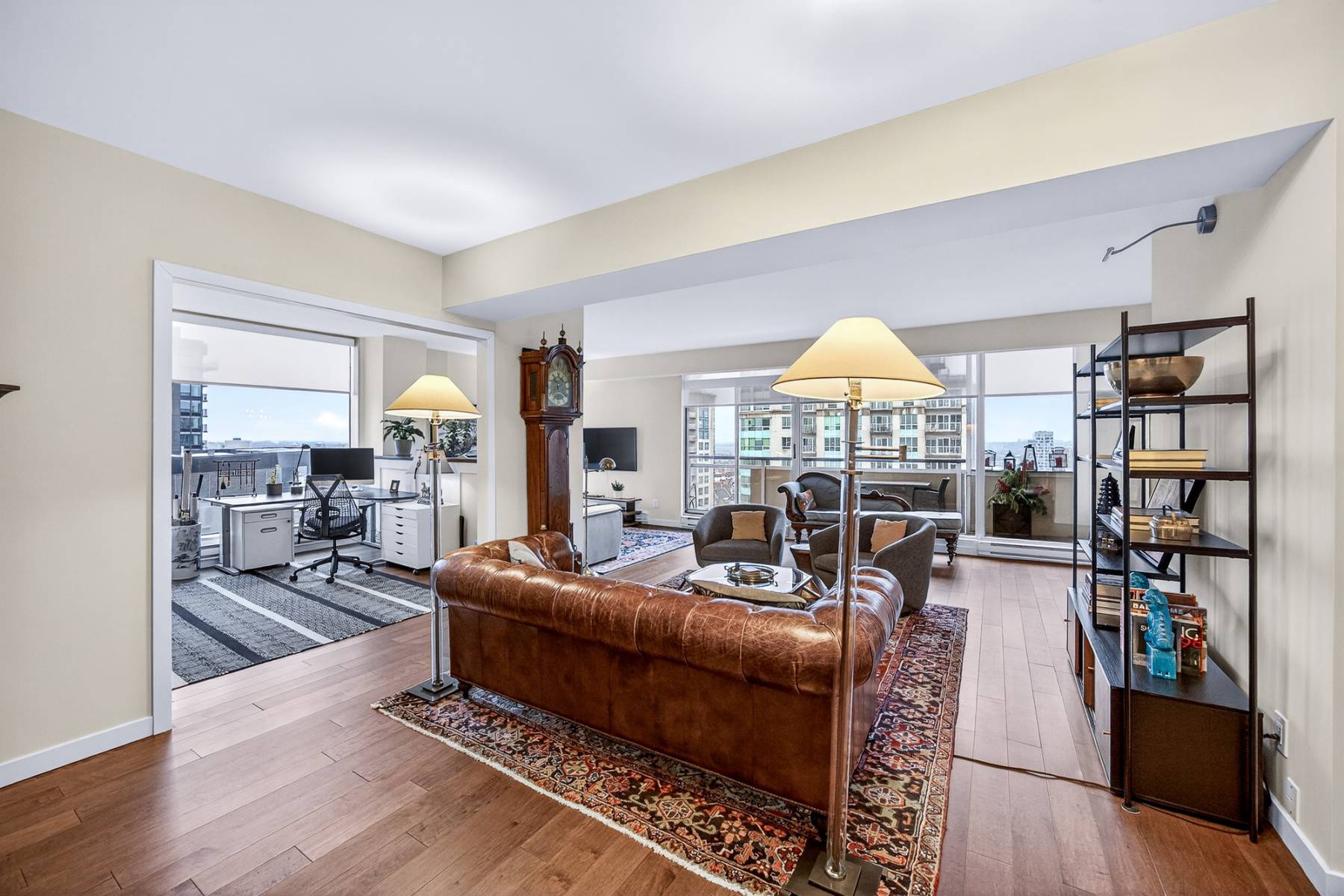From the moment you enter, the spacious foyer sets the tone, welcoming you with natural light and an immediate connection to the surrounding cityscape. The main living areas unfold seamlessly, combining living, dining, kitchen, and family room spaces into one expansive, cohesive environment. Rich hardwood flooring grounds the interior, while oversized windows and balcony access enhance the sense of volume and flow—perfect for entertaining or simply enjoying everyday urban life.