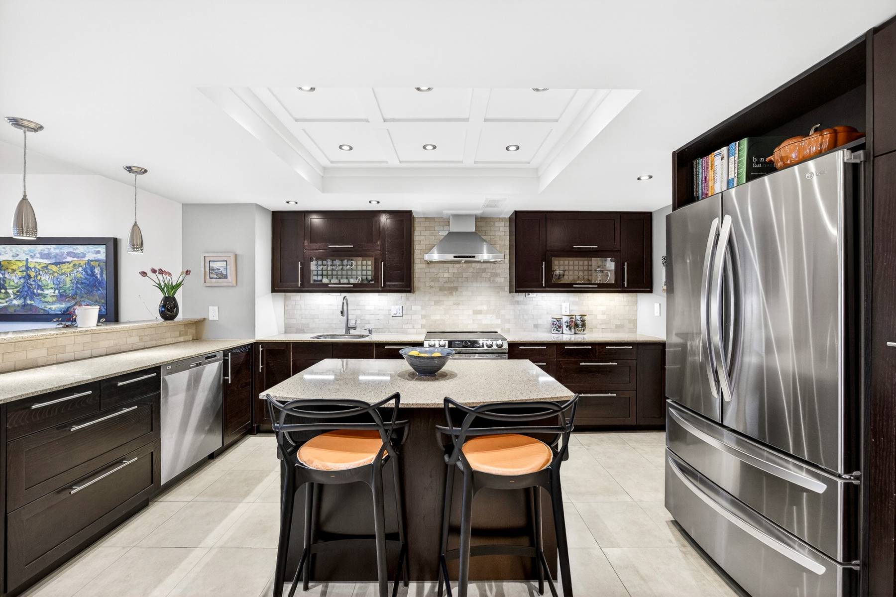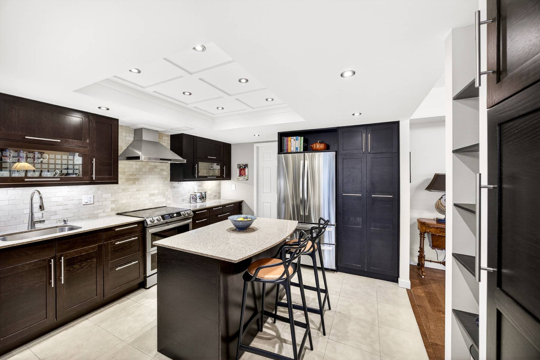 The gourmet kitchen is both stylish and highly functional, featuring sleek stone countertops, abundant cabinetry, and a perfect casual dining island. Thoughtfully integrated into the open-concept layout, it allows the cook to remain connected to guests and conversation, whether hosting intimate dinners or larger gatherings.
