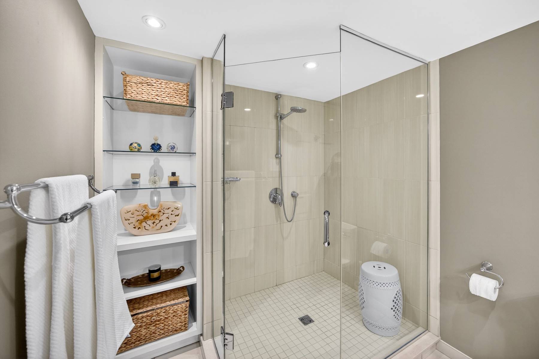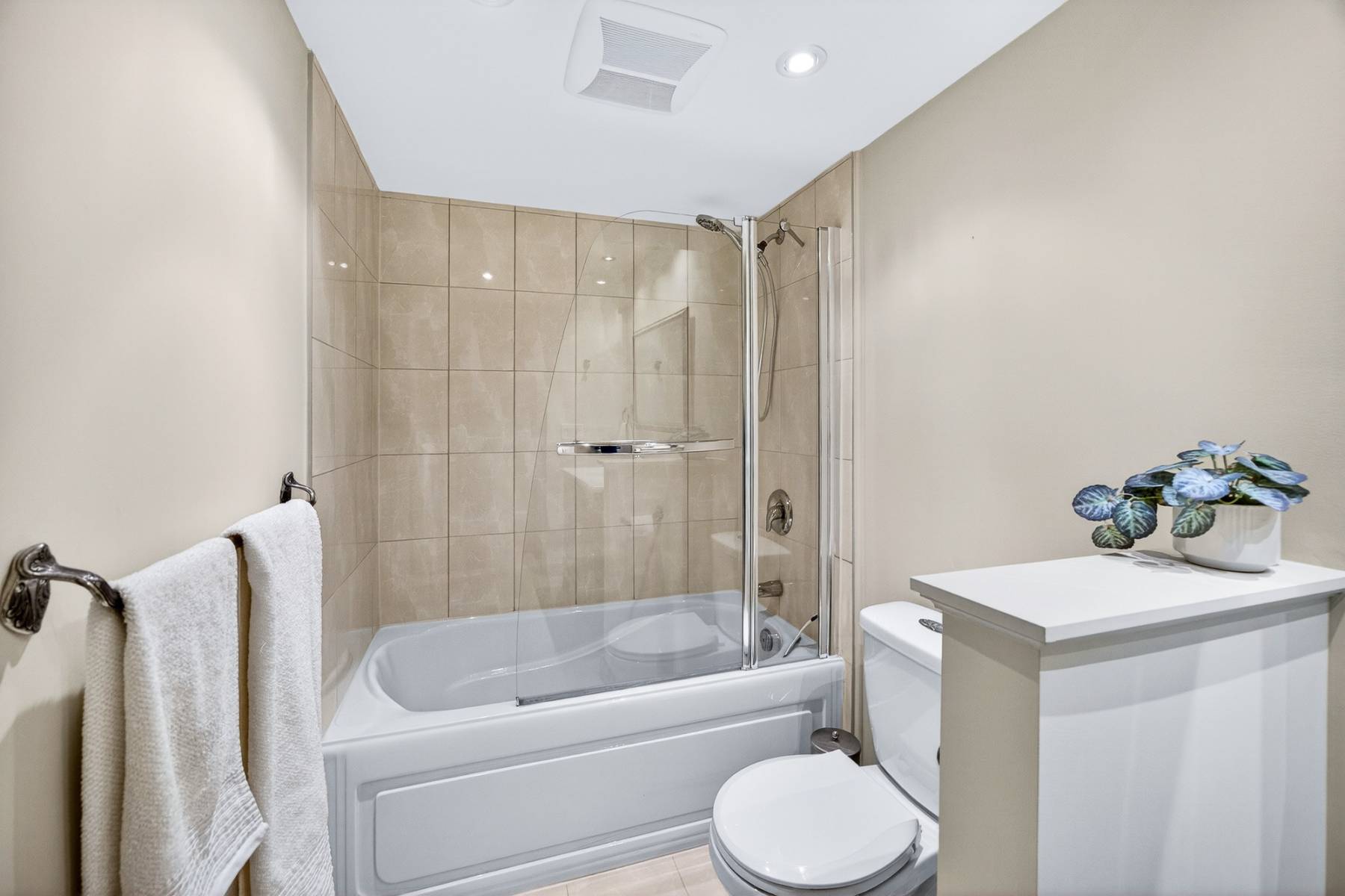 The original two-bedroom configuration offers exceptional flexibility. Currently arranged to provide a den, office, or library space, the layout can easily be converted back to a traditional second bedroom if desired. A thoughtfully designed Murphy bed and custom built-ins ensure versatility without compromising style, making the space equally well-suited for guests, remote work, or creative pursuits. A full secondary bathroom and in-suite laundry complete the functional side of the plan.
