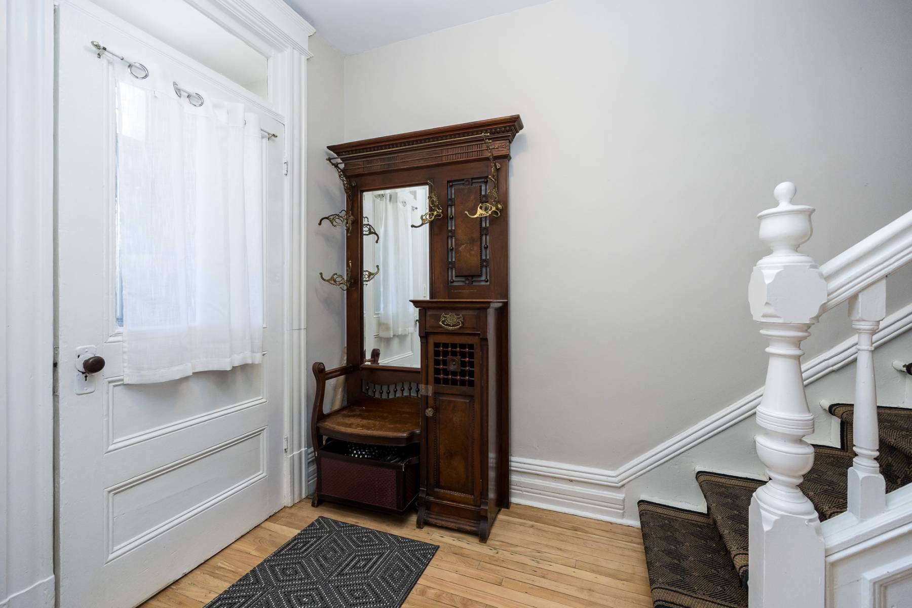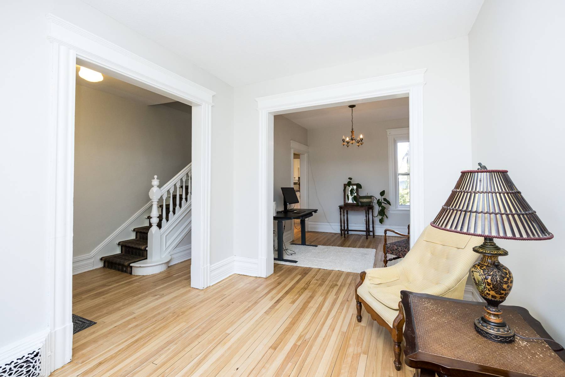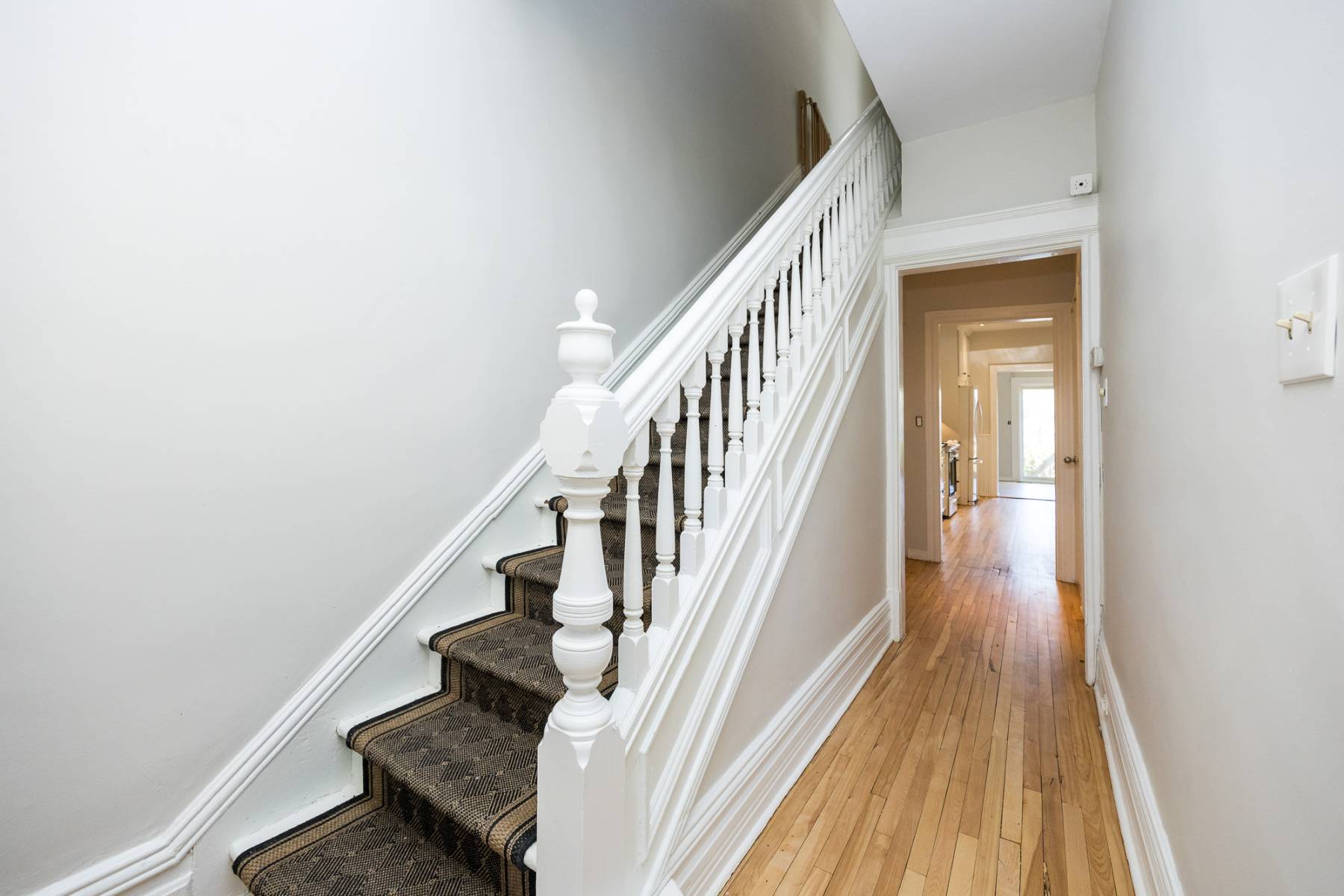 Upon entering through the front door, you're greeted by a foyer and hallway adorned with the original staircase, serving as a captivating focal point.