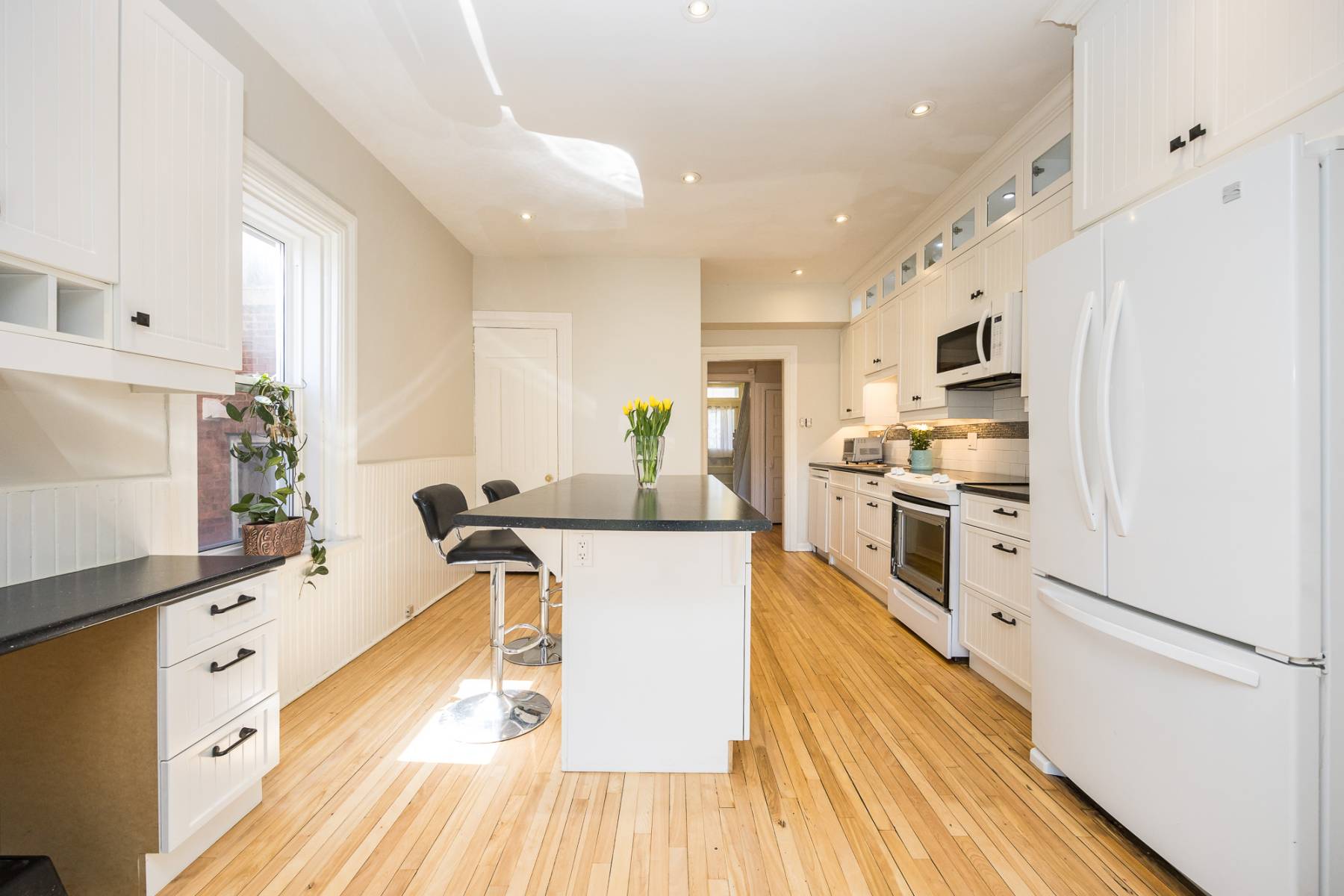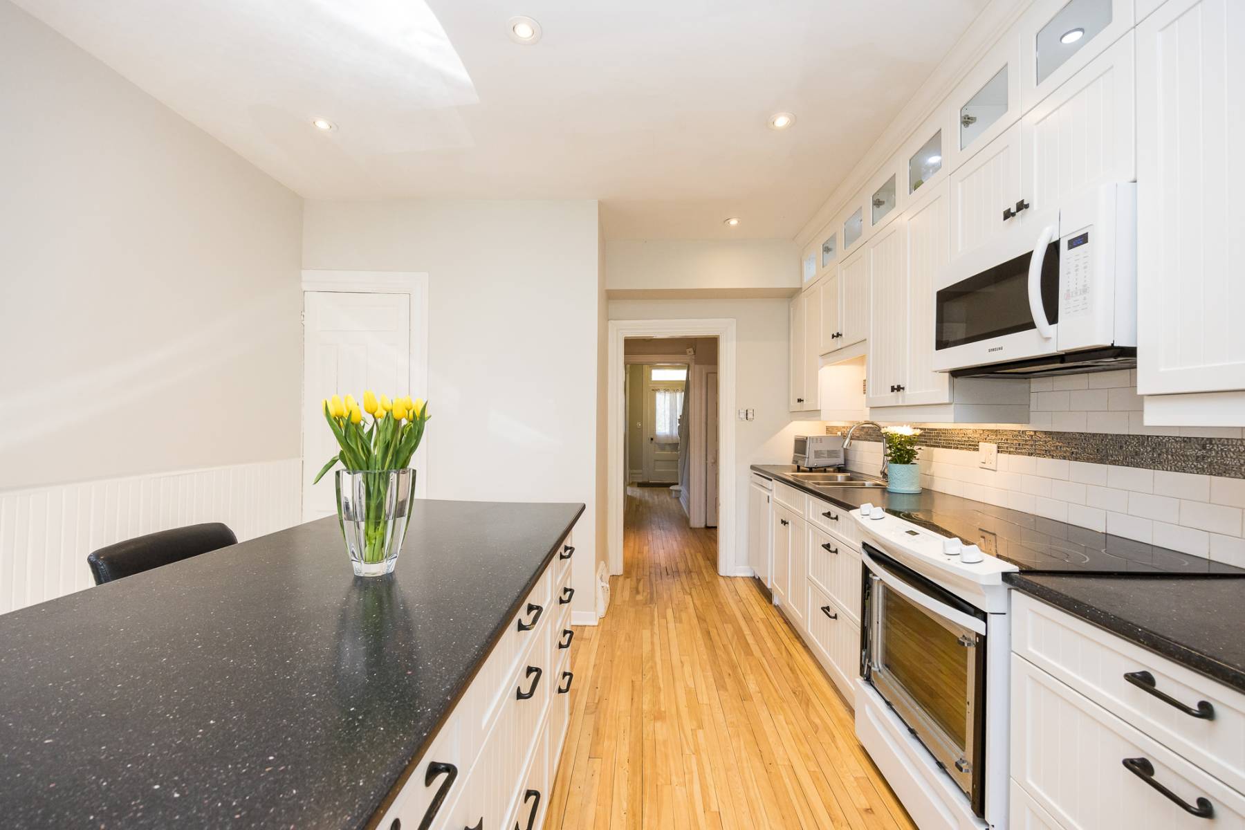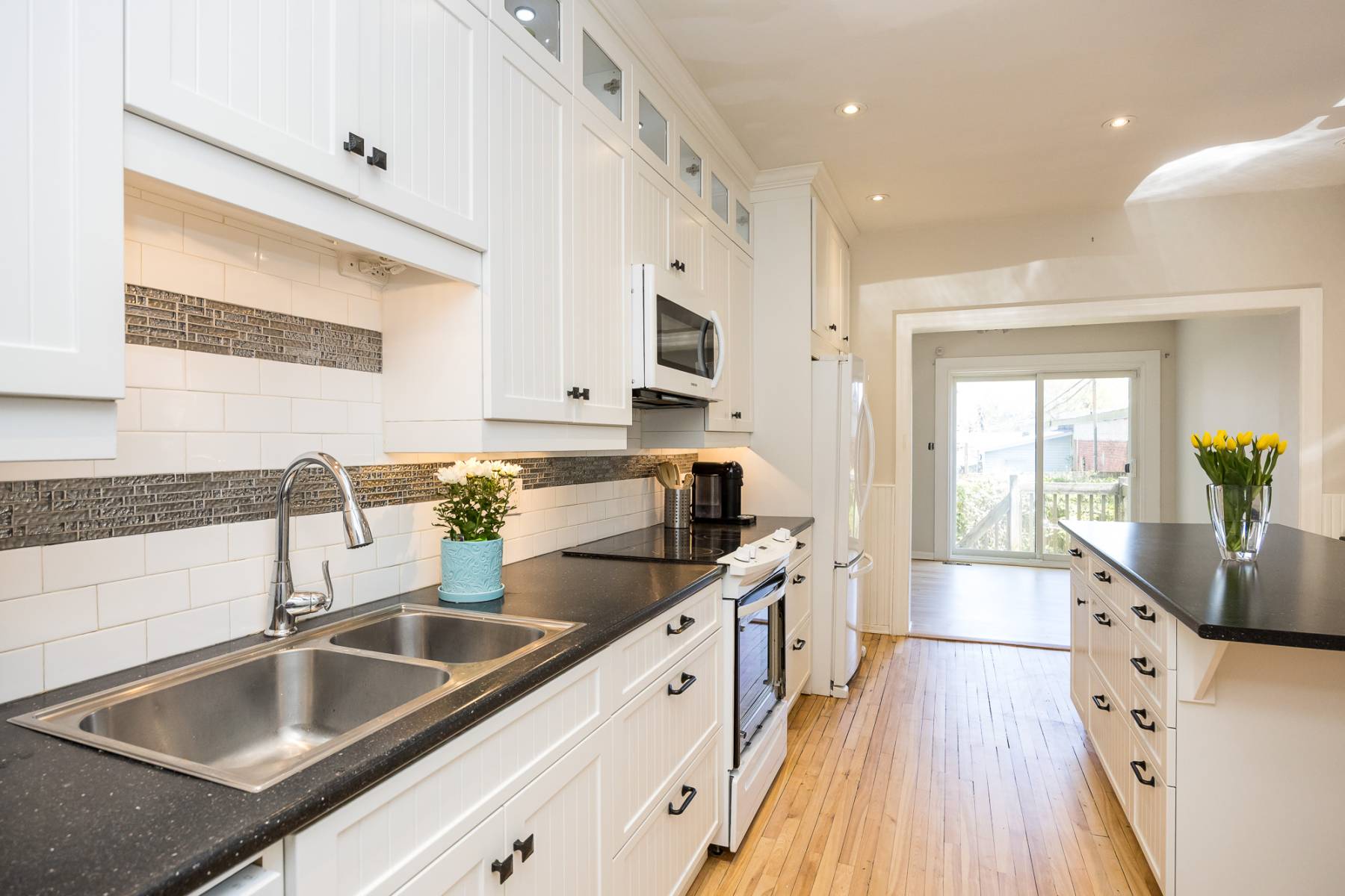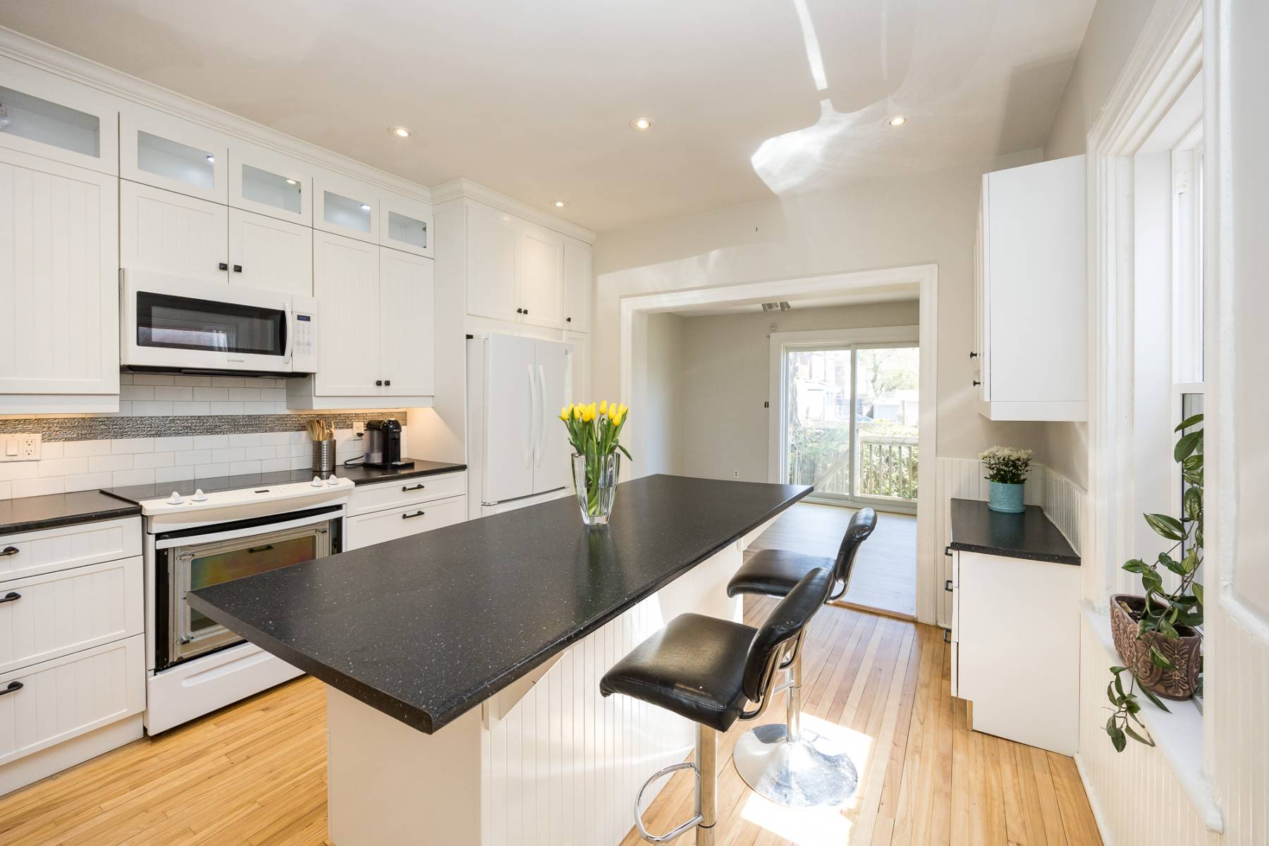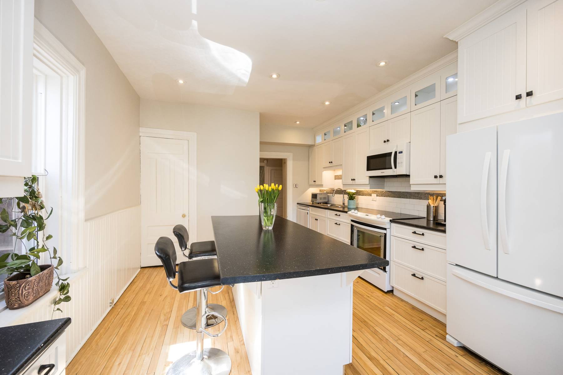 The heart of the main floor boasts a recently remodeled kitchen, where family and friends can gather around the inviting eating island for lively conversations or leisurely morning coffees. Floor-to-ceiling white cabinetry seamlessly integrates modern conveniences like pull-out drawers and lit display shelves, complemented by a sleek dark countertop. The kitchen flows effortlessly into the main floor family room, which opens up to the serene garden space, ideal for indoor-outdoor living.