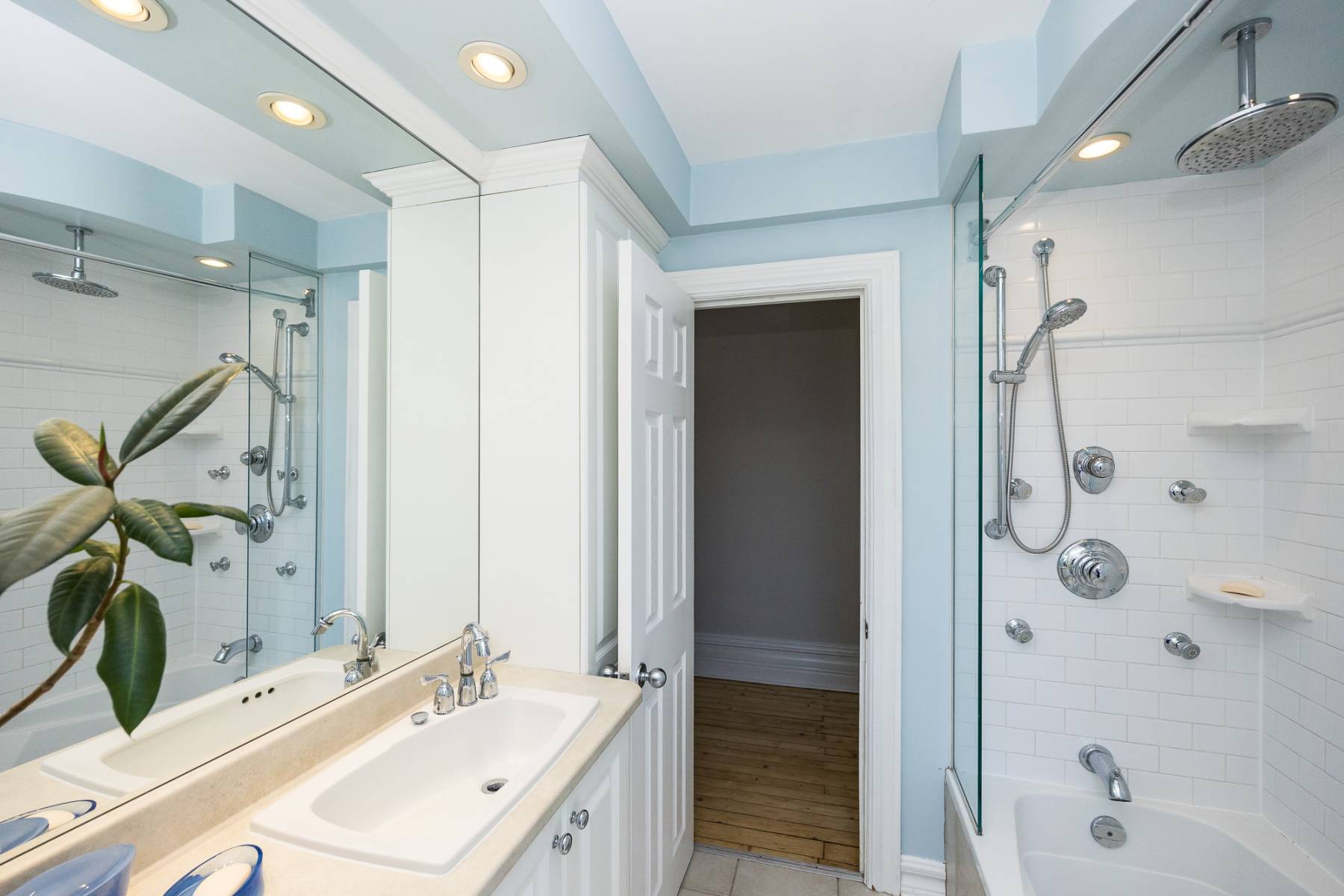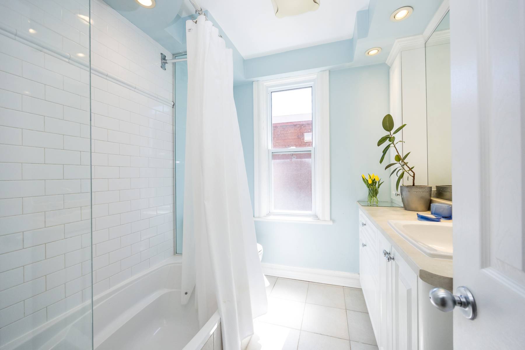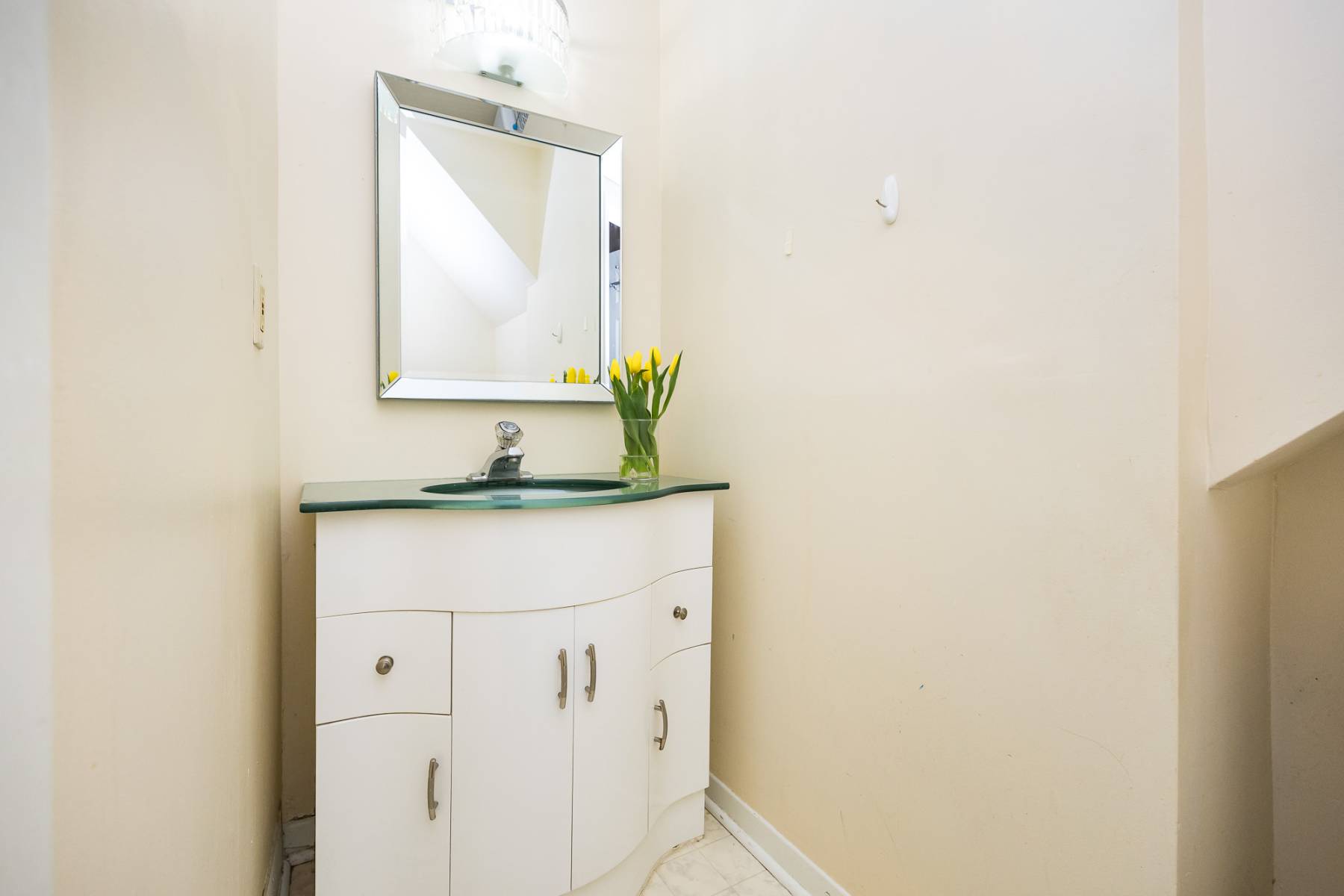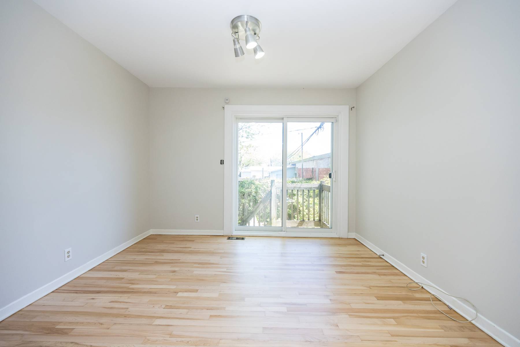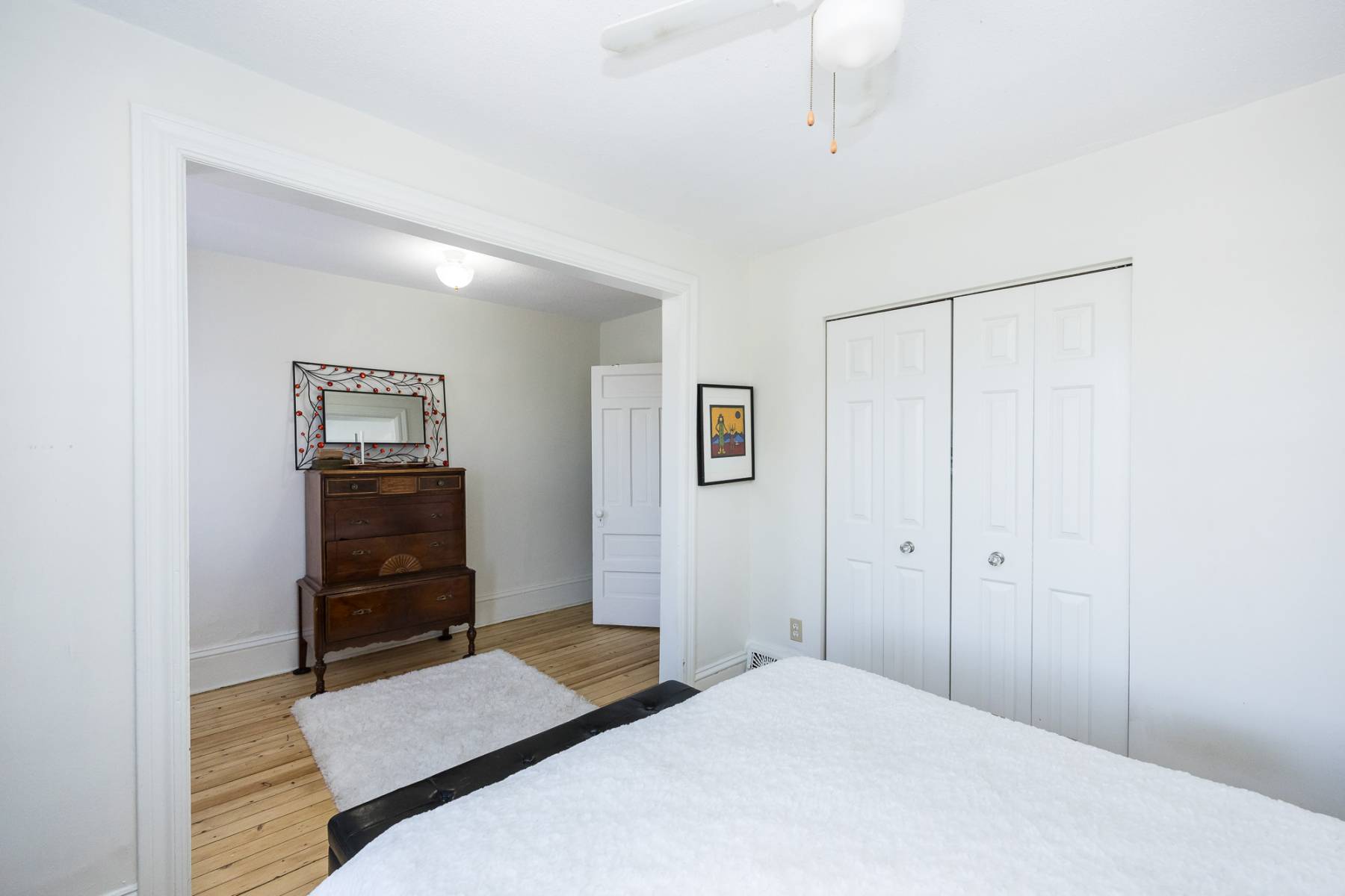 Ascending to the upper level, you'll find three bedrooms and a fully renovated bathroom. The front room basks in natural light, enhanced by the warmth of the recently refinished original wood floors. The redesigned bathroom exudes brightness and spaciousness, featuring a subway tile shower/tub surround, tiled floor, generous vanity, and a luxurious shower and tub combination complete with an oversized rain shower head and separate handheld option.