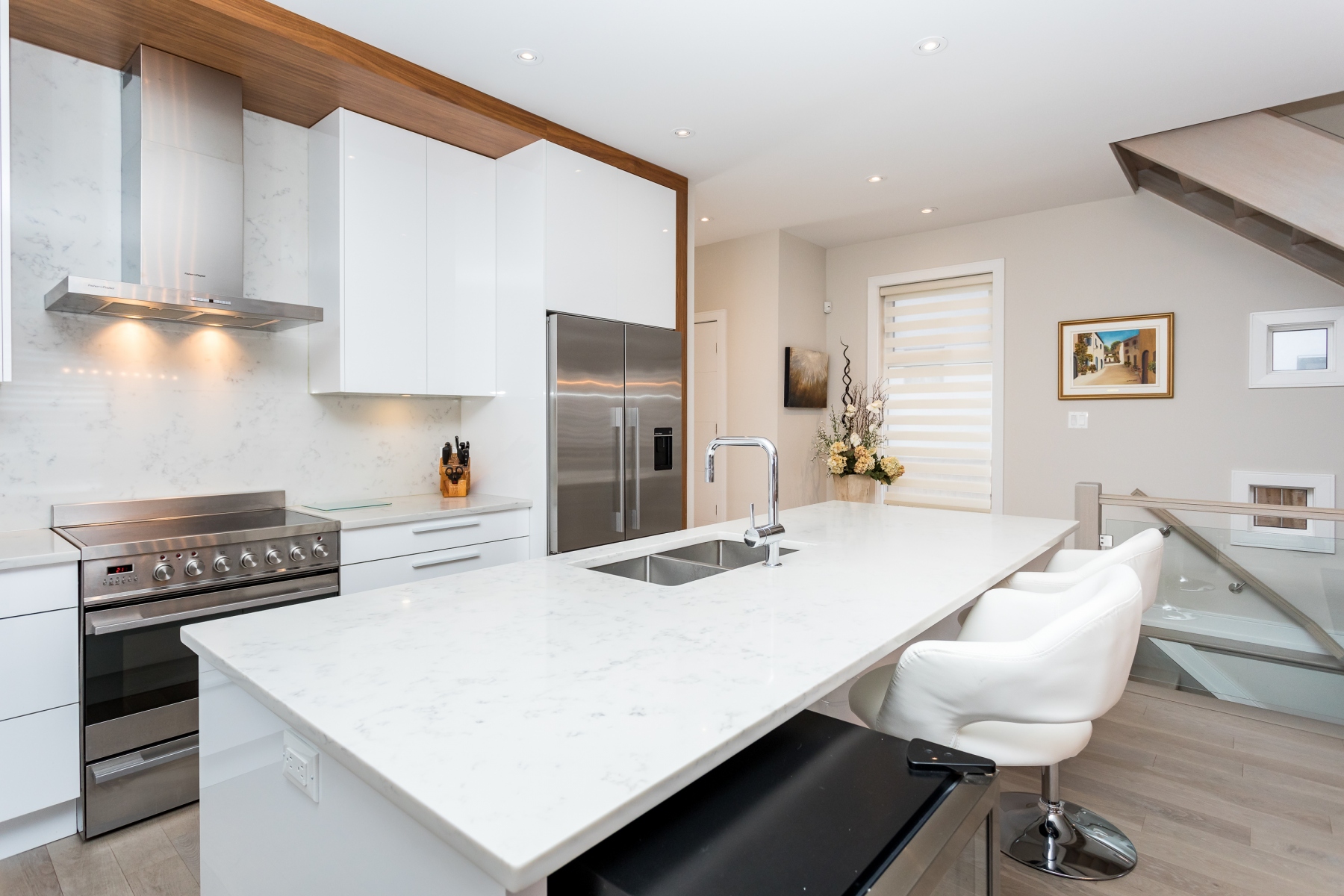 The kitchen, designed by Irpinia, boasts a modern and understated style with white cabinetry and quartz countertops. It is fully equipped with high-quality appliances, providing a sleek and functional space for cooking and meal preparation.