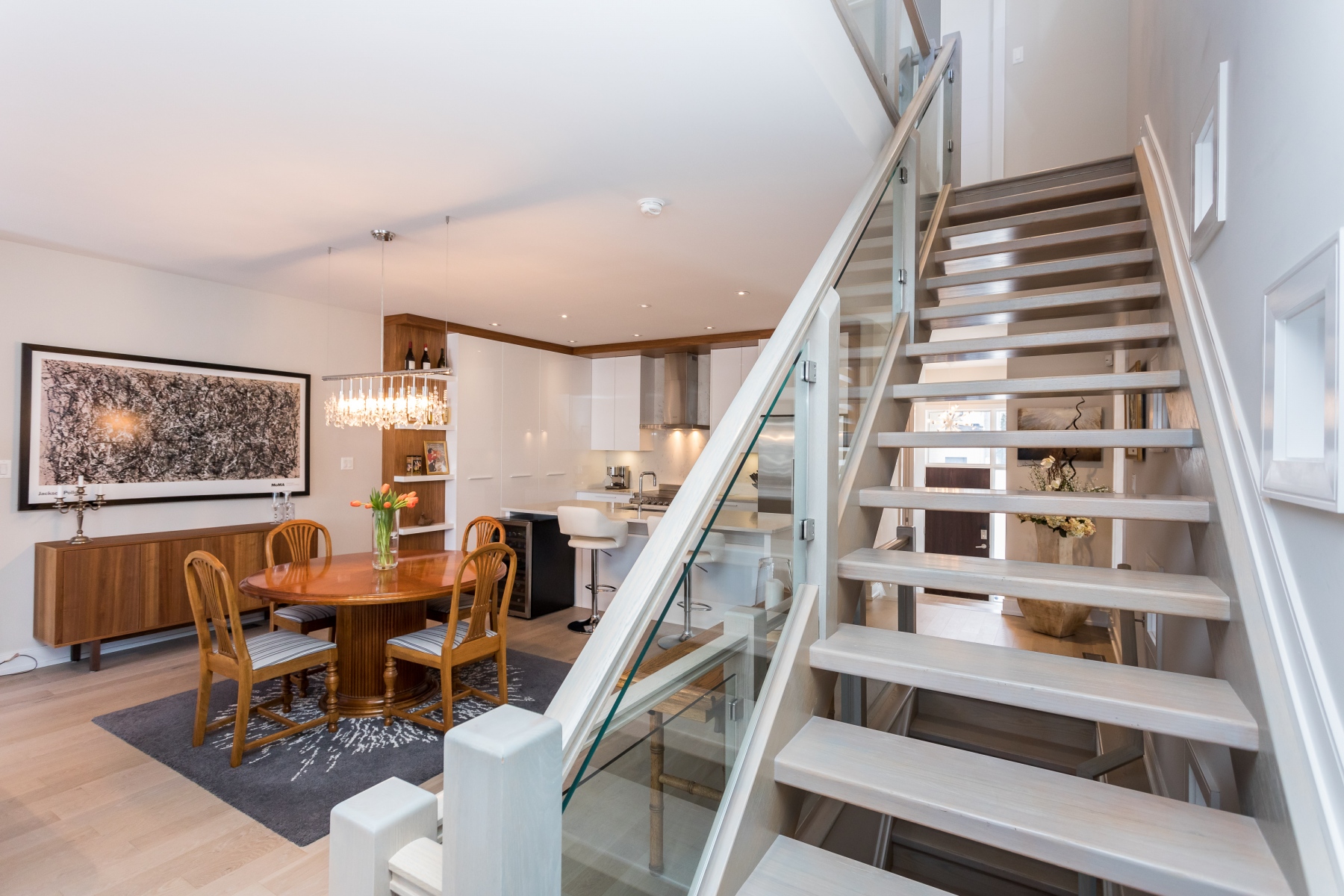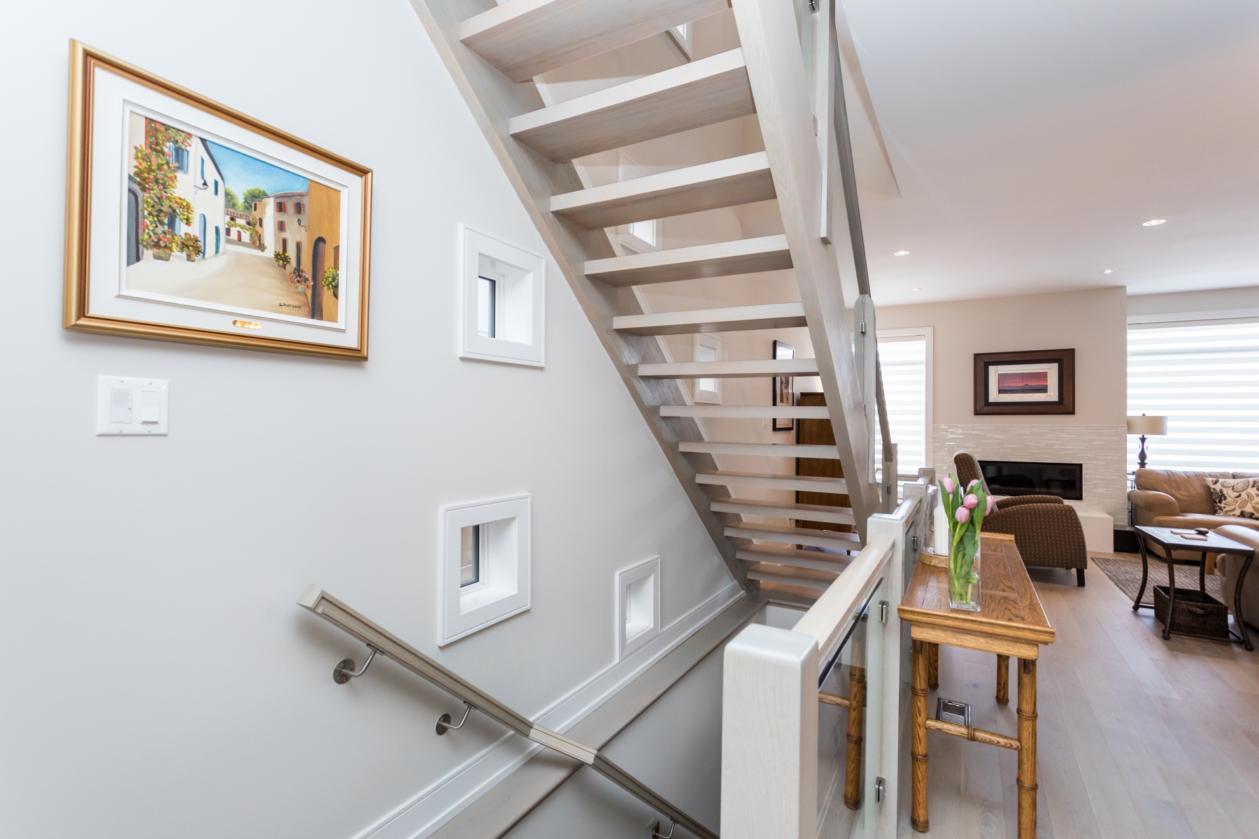The main floor of the house is open and spacious, comprising the living, dining, and kitchen areas. Hardwood floors, recessed lighting, and expansive windows enhance the rooms, creating a bright and inviting atmosphere. This layout is perfect for entertaining and family living. The glass/wood and chrome staircase adds a modern touch to the overall design, while the floor-to-ceiling windows frame the fireplace.