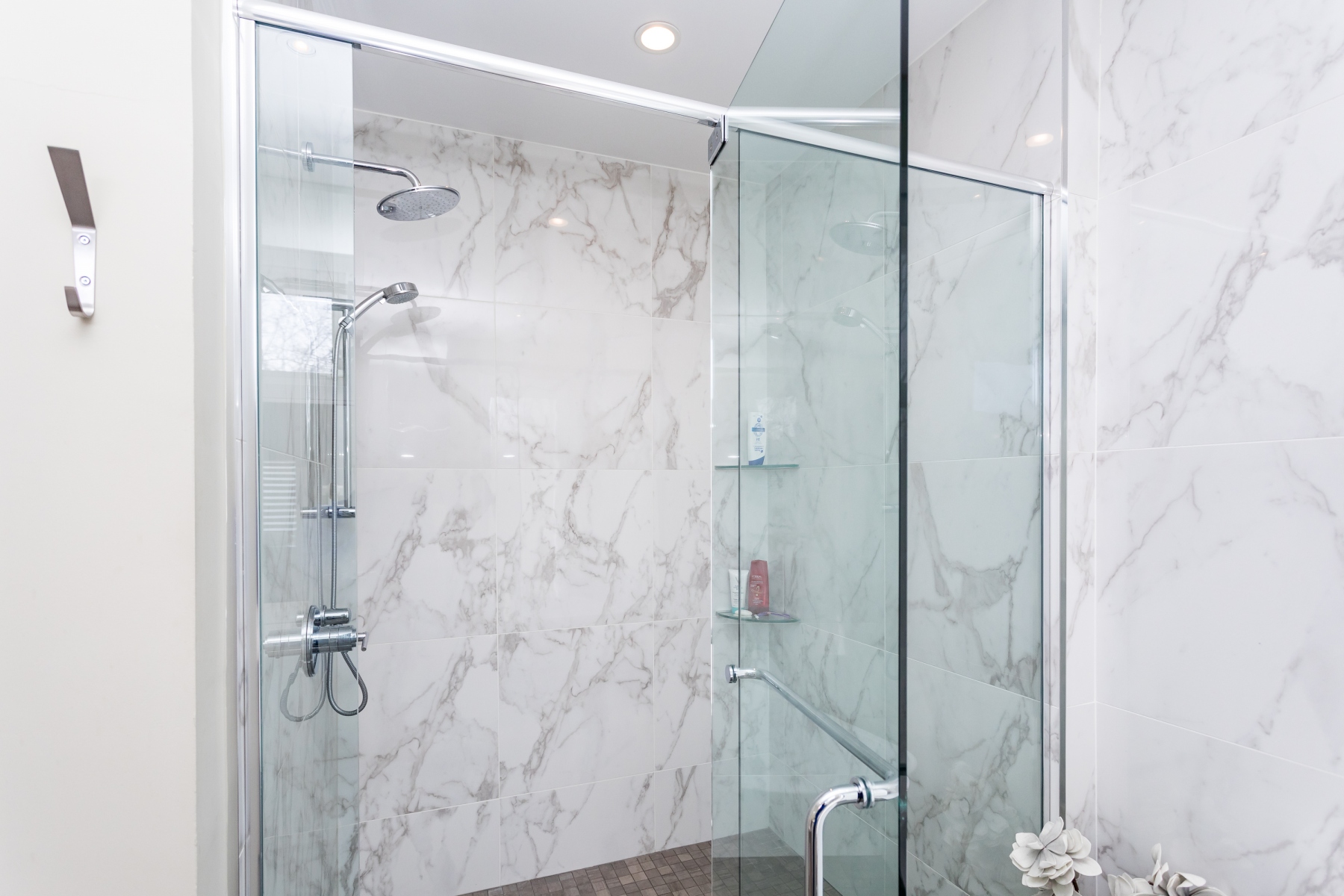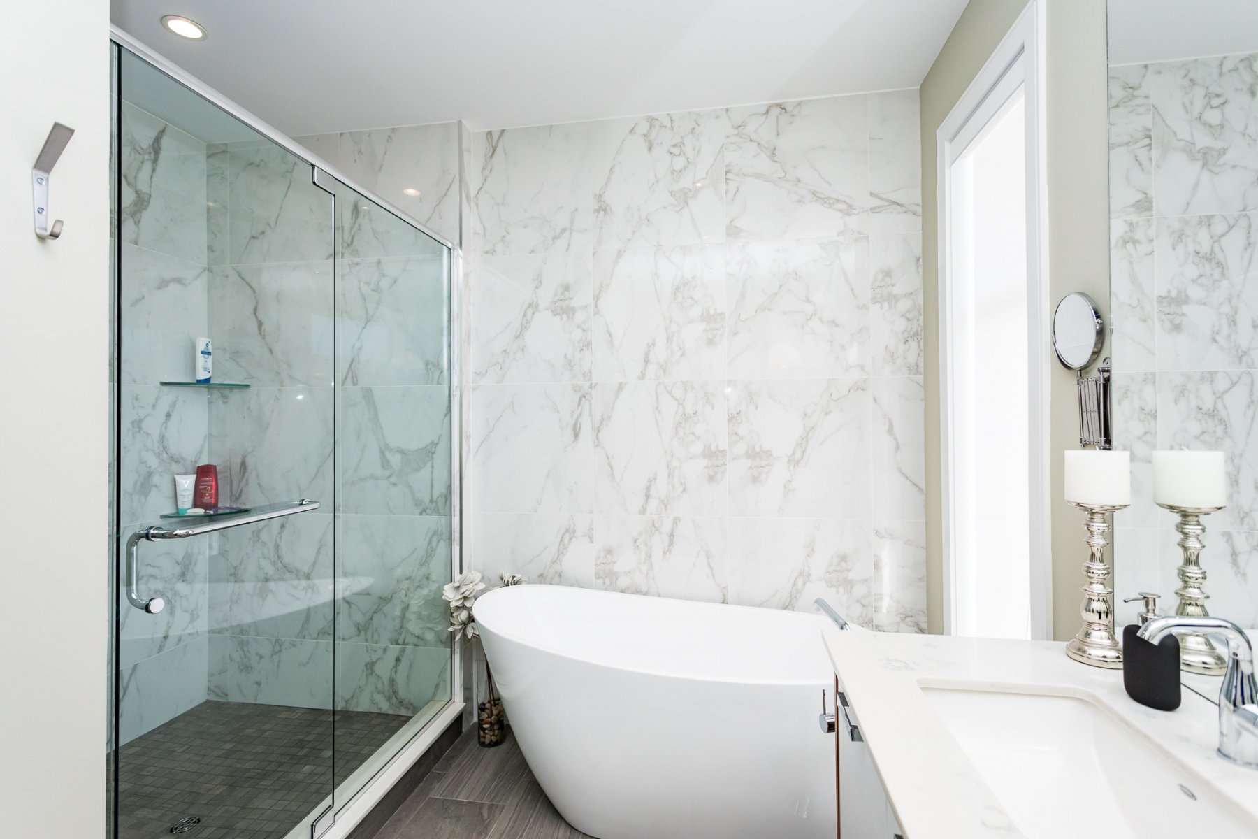 Moving to the second floor, you will find a private primary bedroom and two additional well-proportioned bedrooms. The primary bedroom offers ample space, featuring an oversized walk-in closet and a stylish ensuite bathroom. The ensuite bathroom includes a large vanity with two sinks, an oversized separate shower stall, and a spa tub with a floor-to-ceiling marble wall backdrop. The second largest bedroom also features an oversized walk-in closet. Additionally, there is a 5-piece bathroom conveniently located off the upper hall.