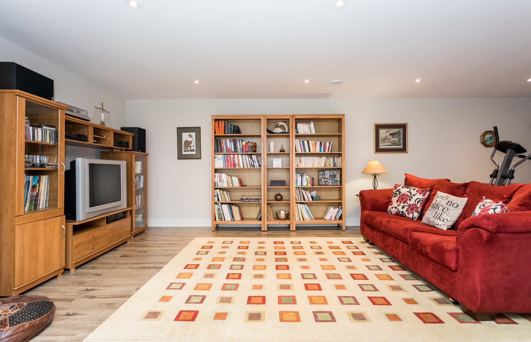 The fully finished lower level of the home is a versatile space that can be used for casual family fun, a media room, games room, gym, or even as a guest room. It features recessed lighting, high ceilings, and engineered wood floors. There is also a full bathroom on this level, making it a suitable space for teenagers or guests.