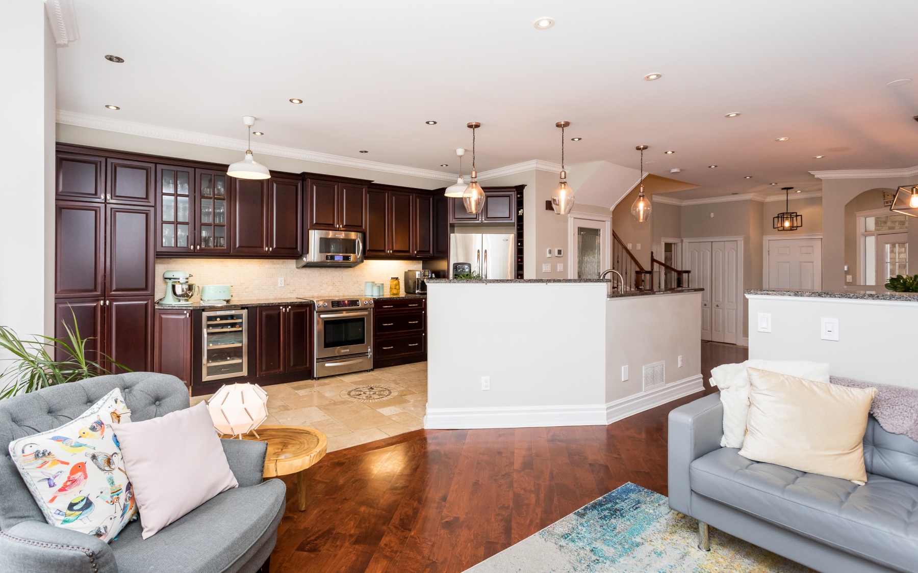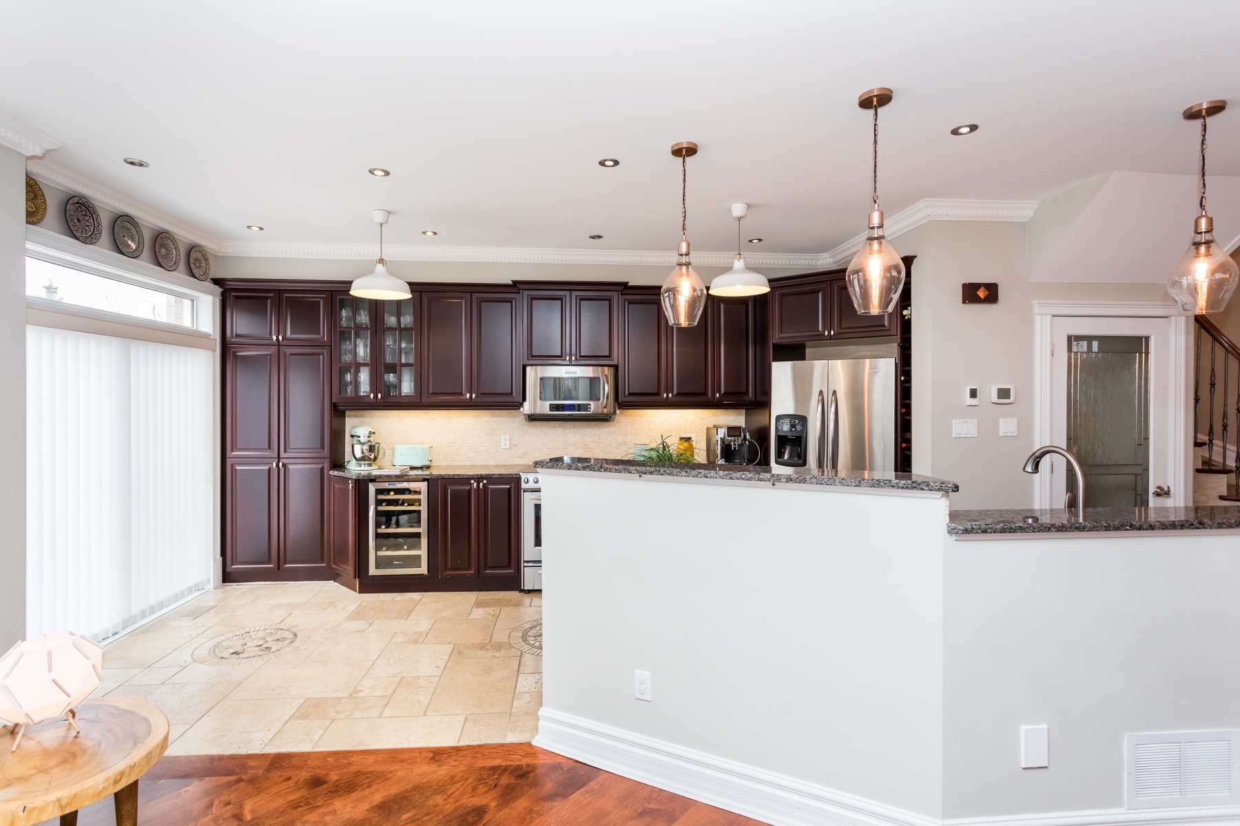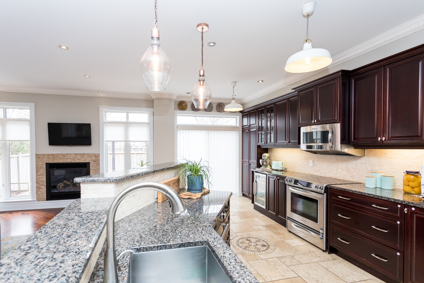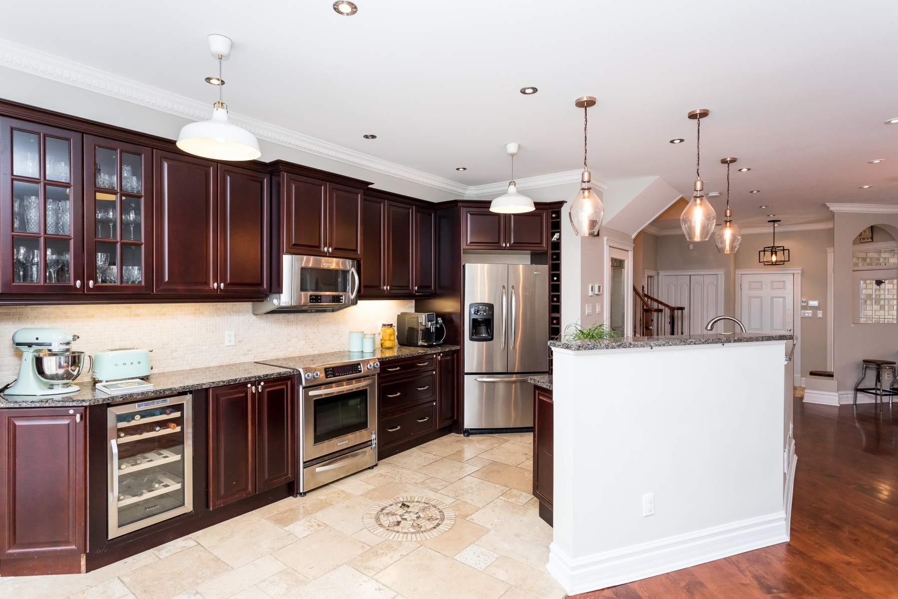 The customized kitchen has deeply rich cherry wood cabinetry with granite counters and a double stainless-steel sink. The home comes fully equipped including a wine fridge. Open to the main rooms allowing for great entertaining and family living.