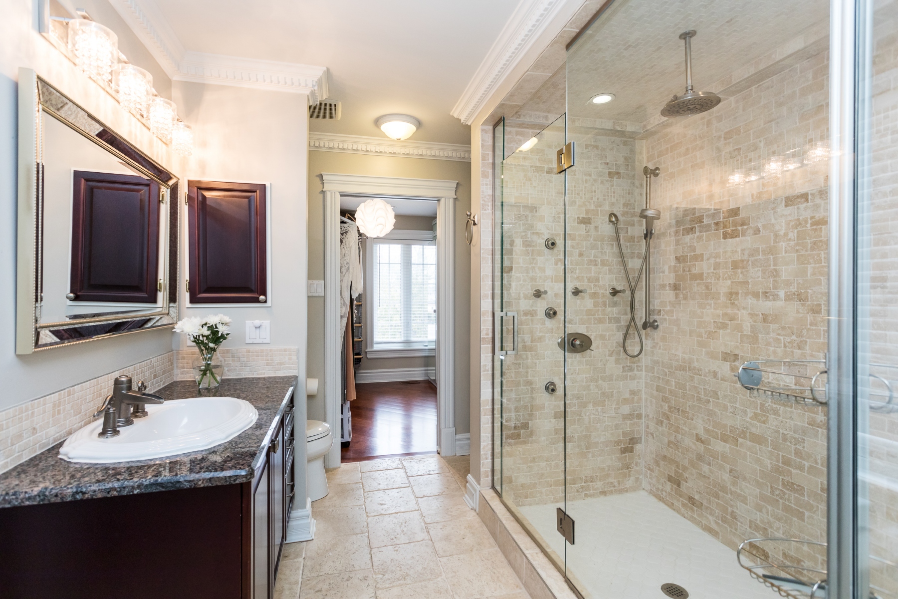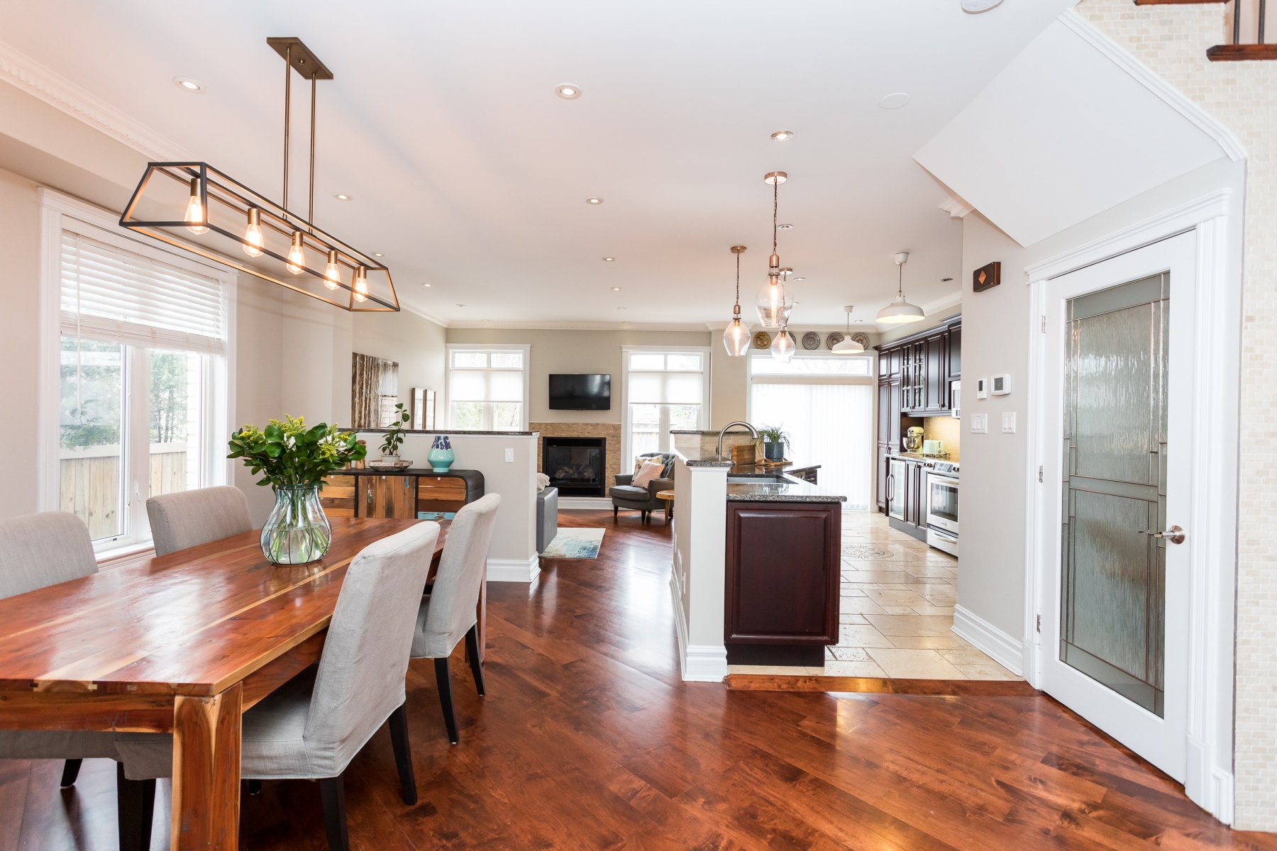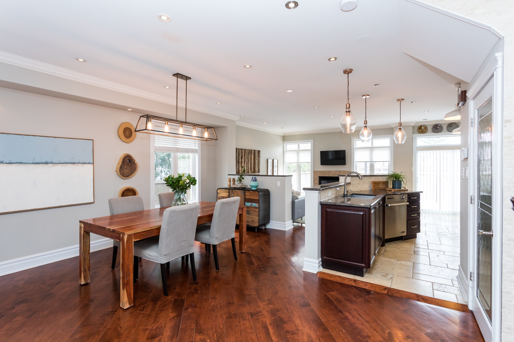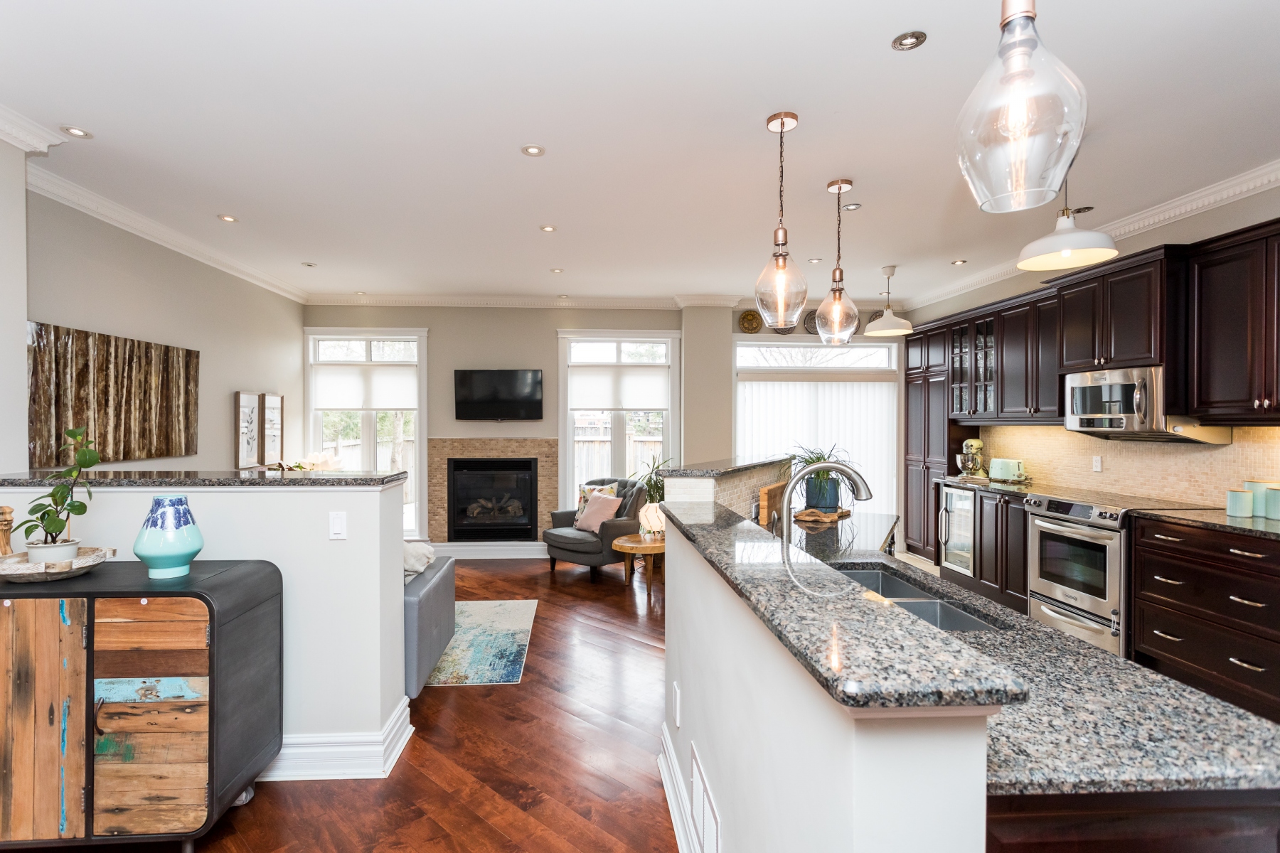 The customized kitchen has deeply rich cherry wood cabinetry with granite counters and a double stainless-steel sink. The home comes fully equipped including a wine fridge. Open to the main rooms allowing for great entertaining and family living.