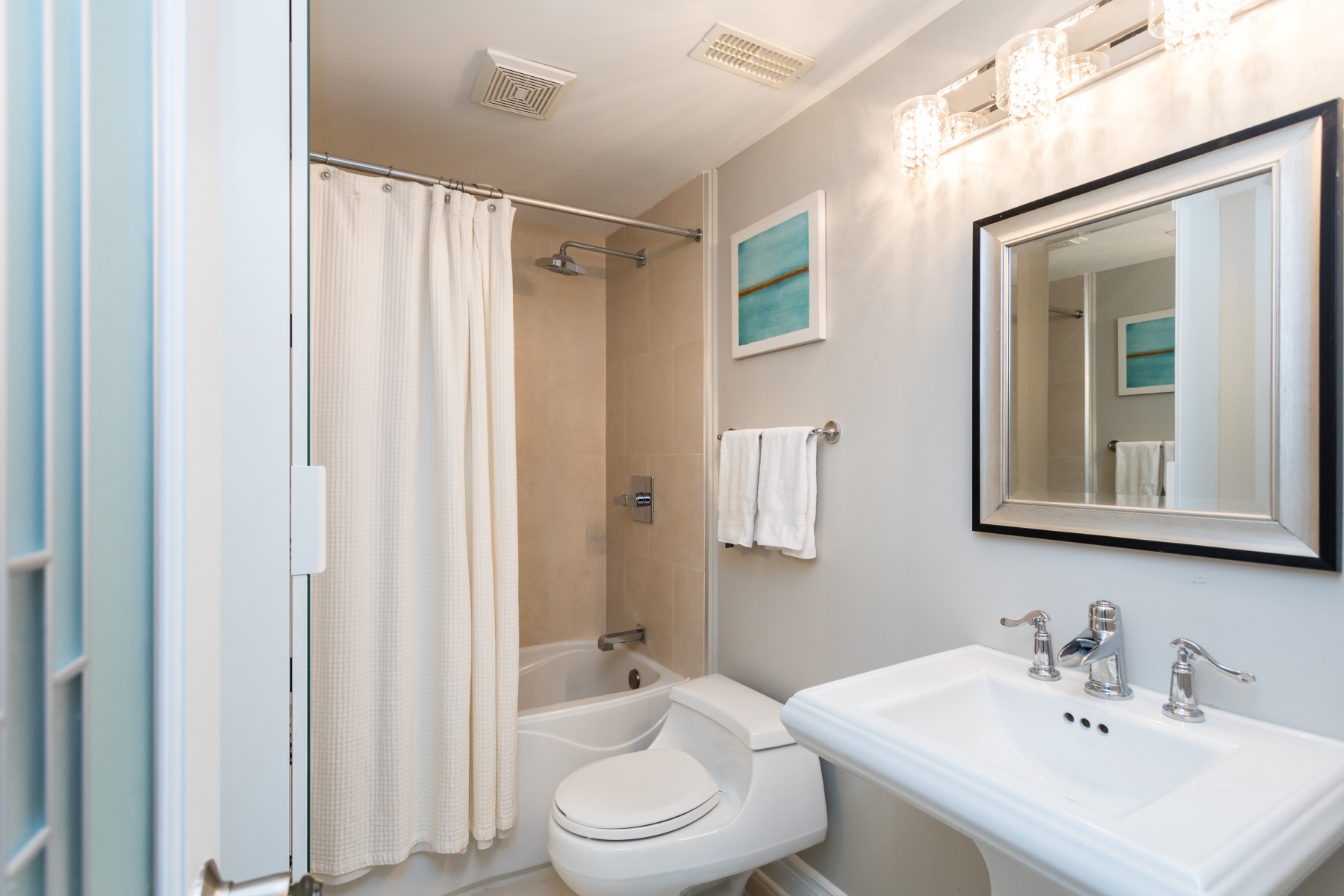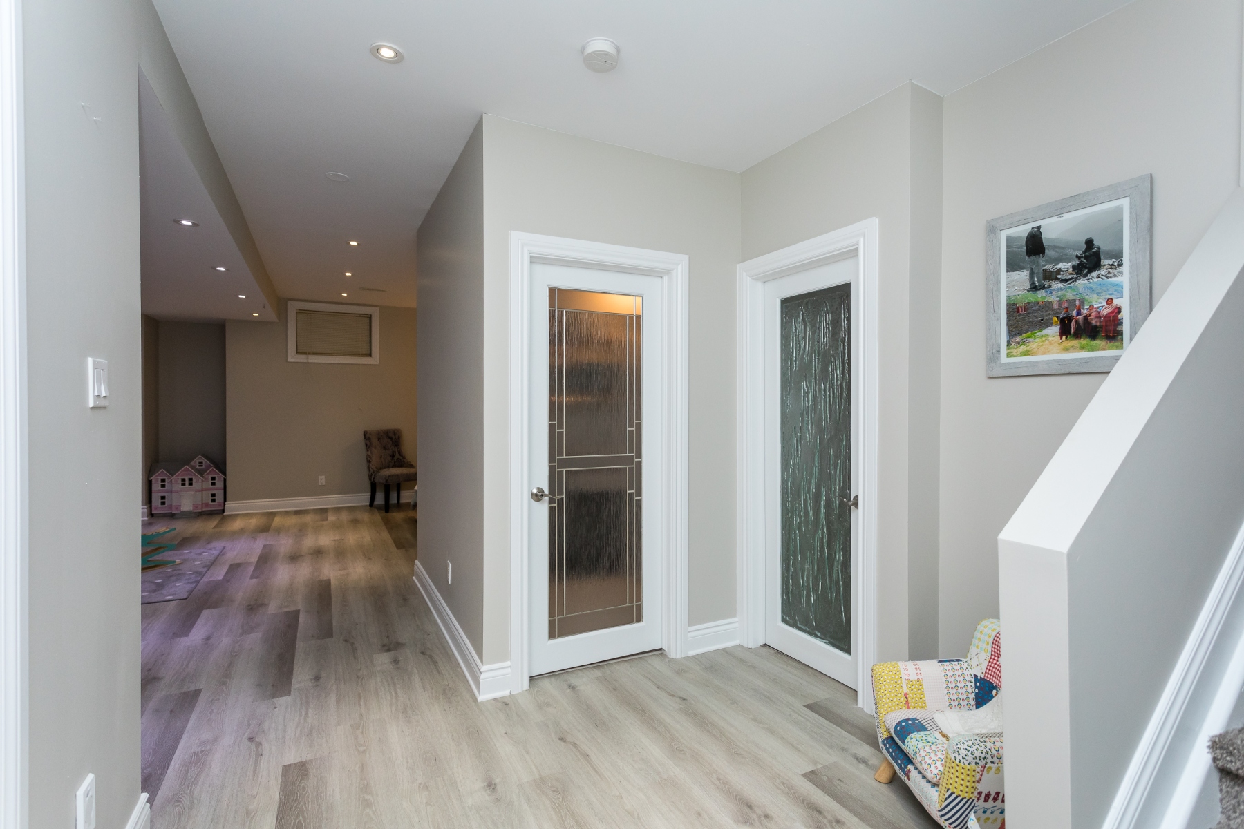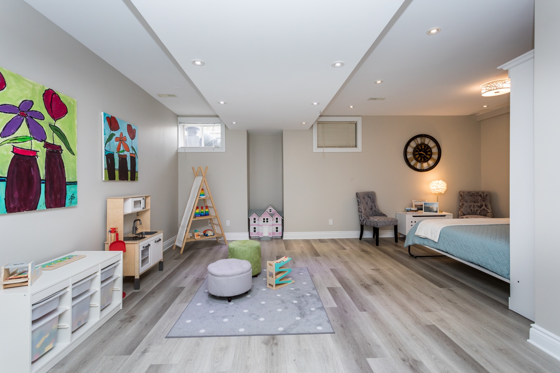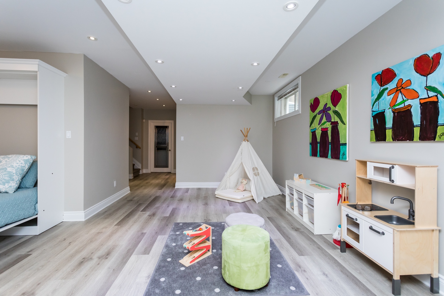 Accented by engineered wood floor, recessed lighting, and high ceilings this area will be used and enjoyed. A full bathroom and a bedroom/den allow the floor to also act as a guest room when needed or for an older teenager to take it over.
