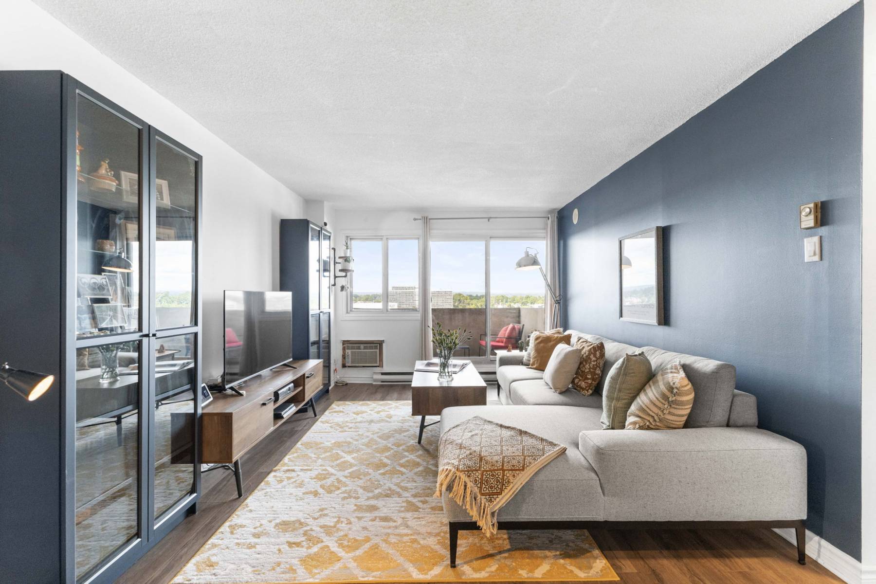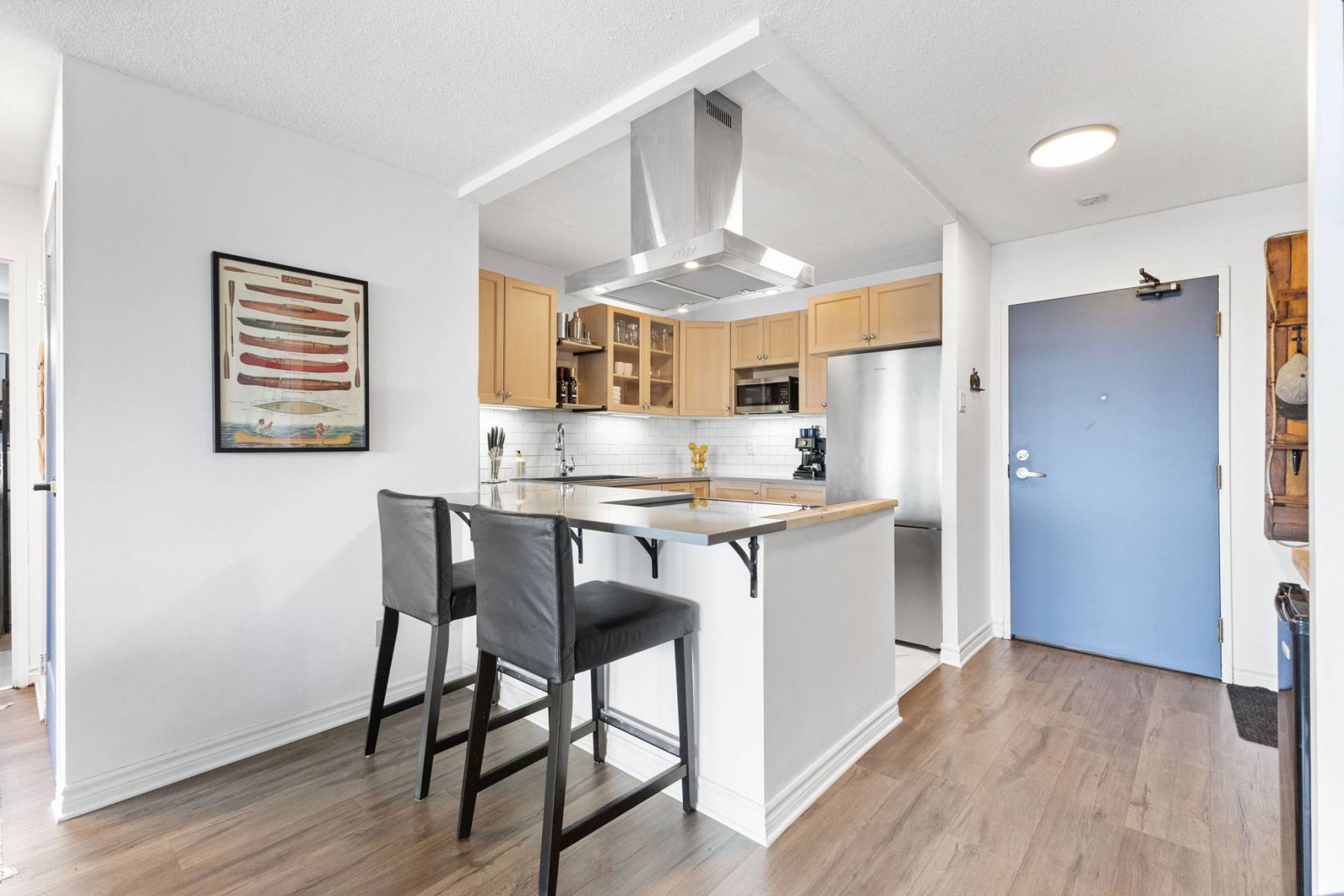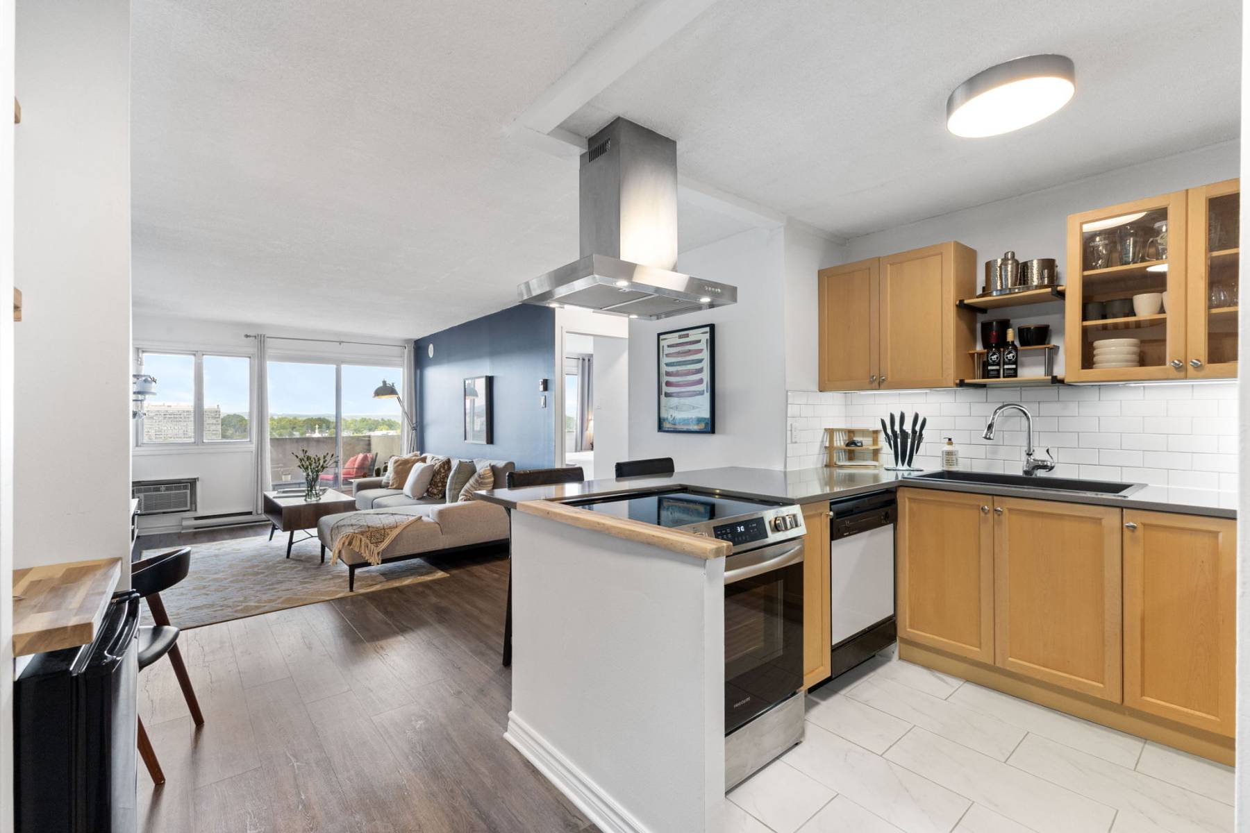 Inside, this thoughtfully designed condo offers stylish, low-maintenance comfort with views to the Gatineau Hills. The open kitchen with quartz countertops, eating bar, and ample cabinetry is perfect for cooking together or entertaining friends. Brushed steel applainces and hood fan are a sleek and modern finish.