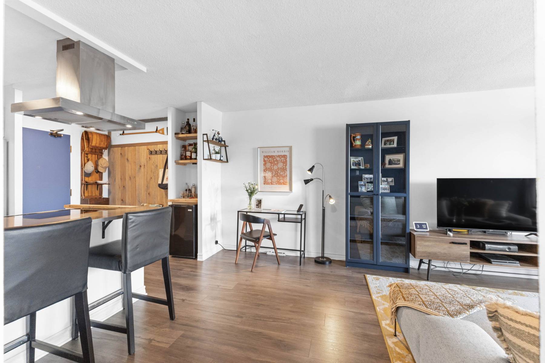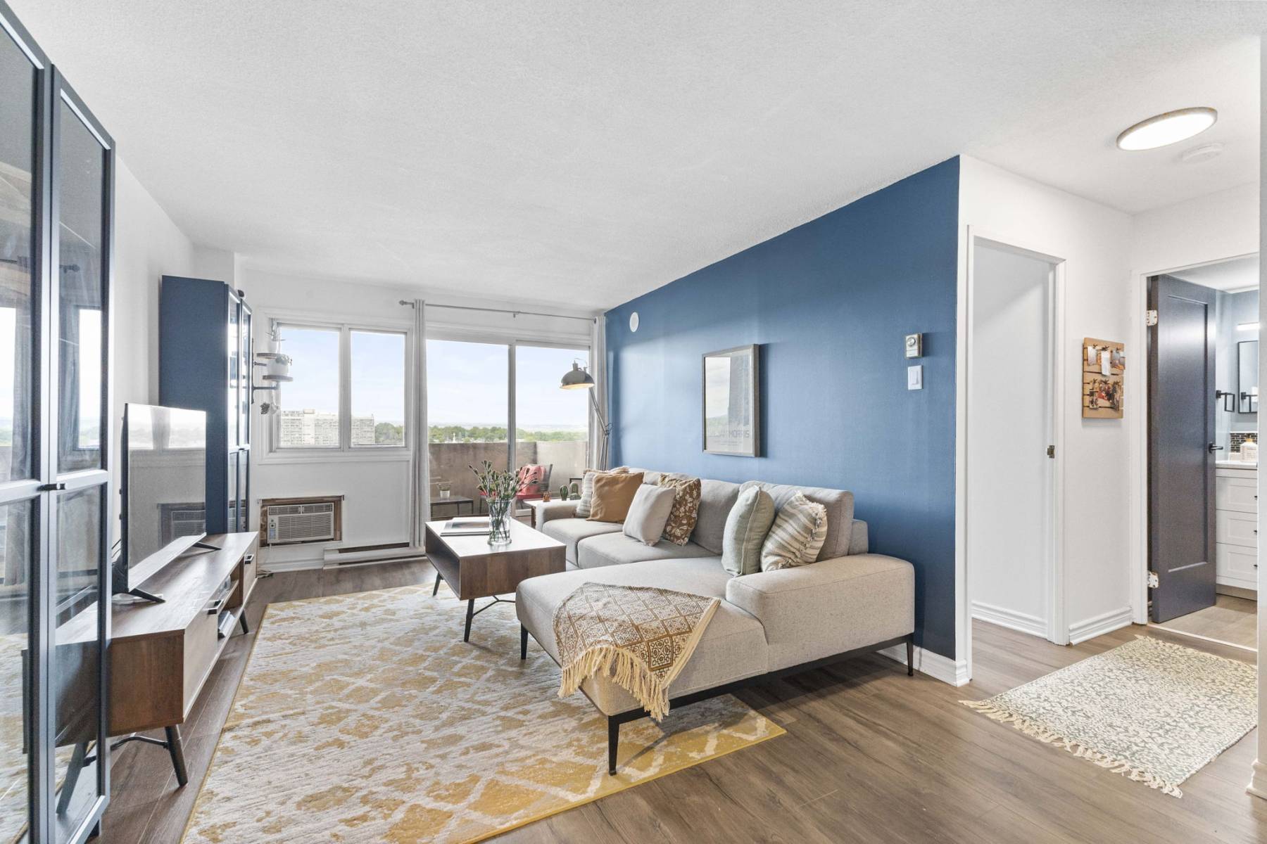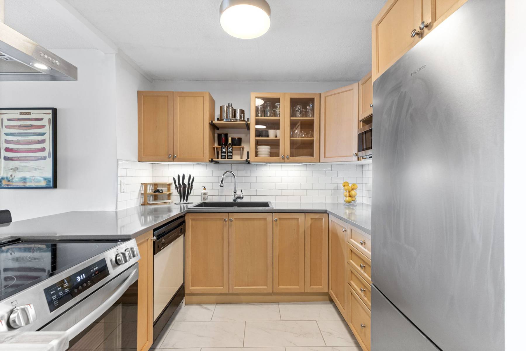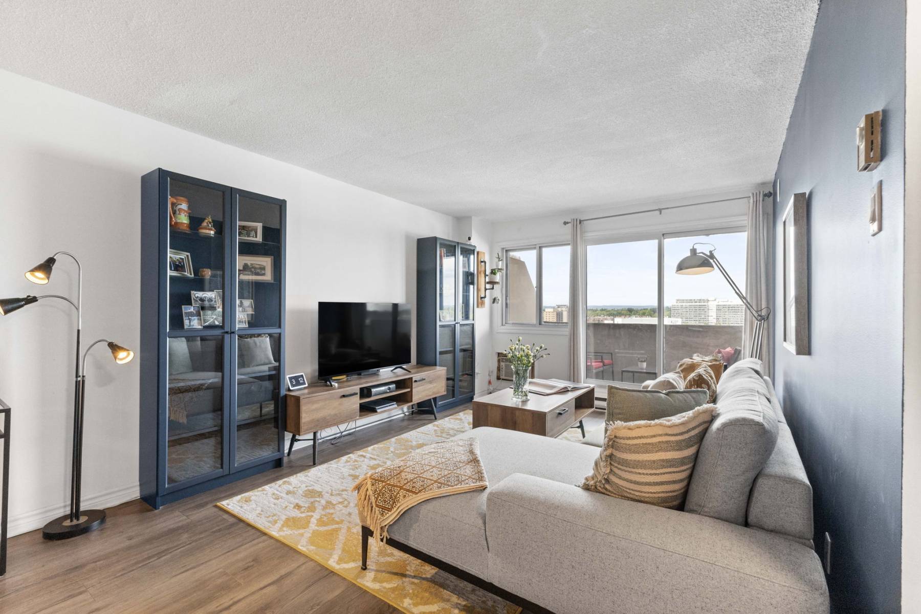 Inside, this thoughtfully designed condo offers stylish, low-maintenance comfort with views to the Gatineau Hills. The open kitchen with quartz countertops, eating bar, and ample cabinetry is perfect for cooking together or entertaining friends. Brushed steel applainces and hood fan are a sleek and modern finish.