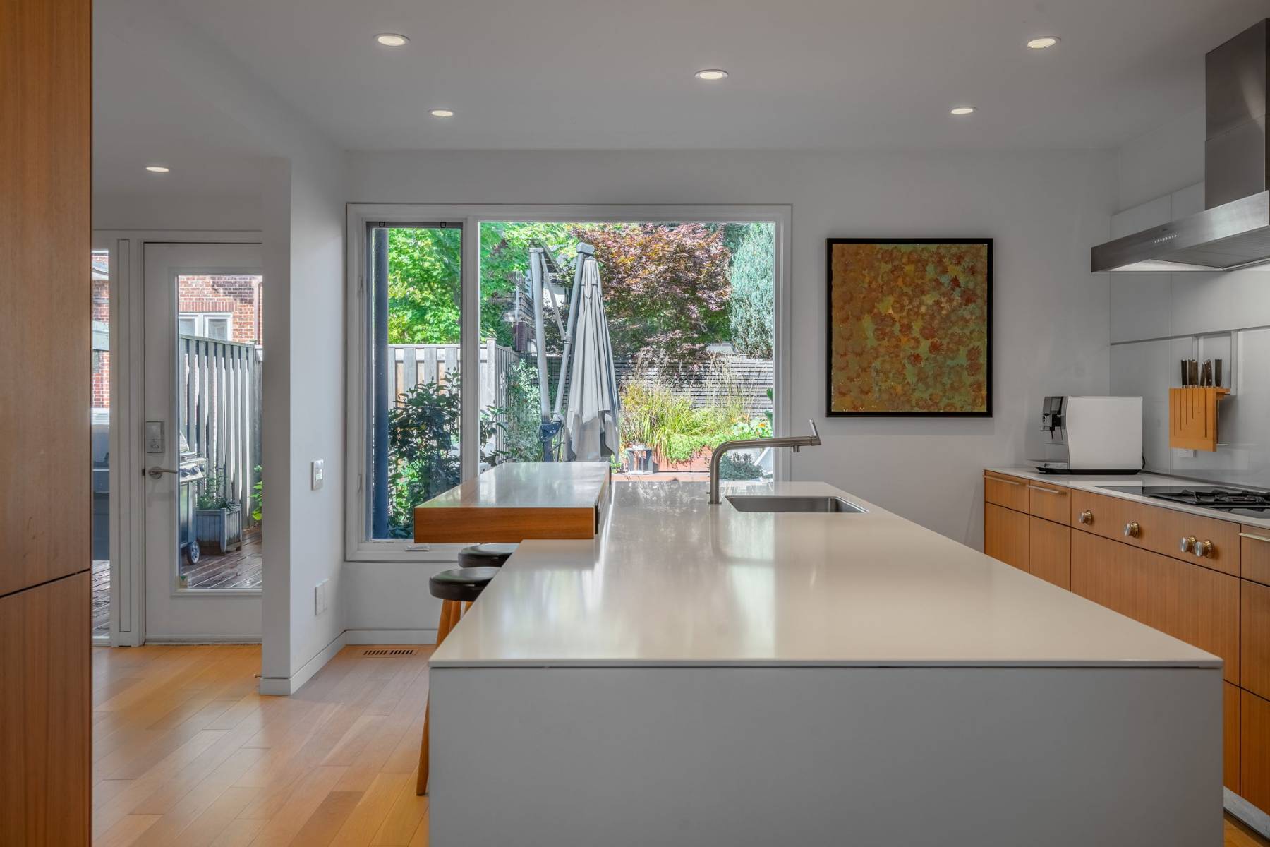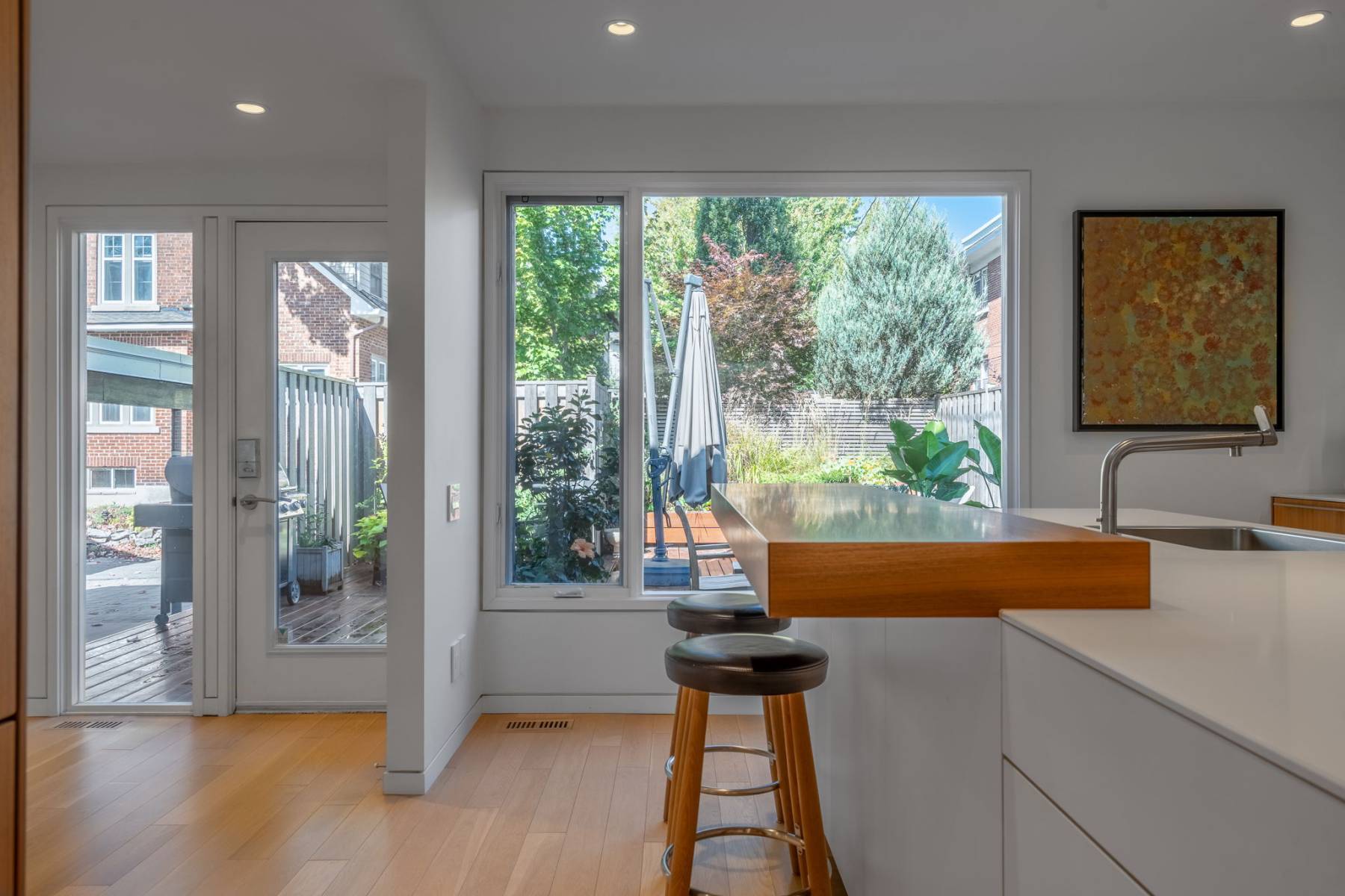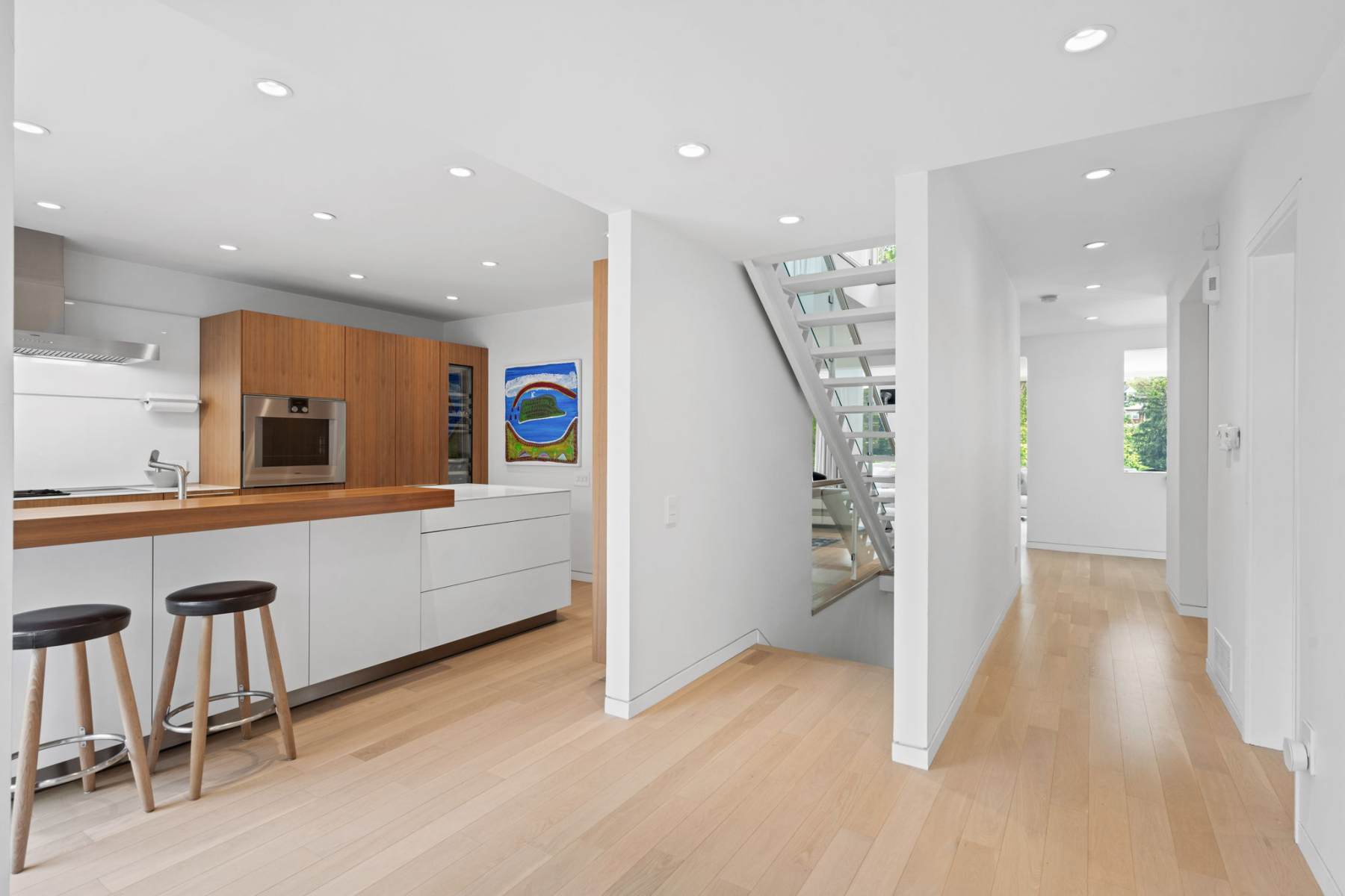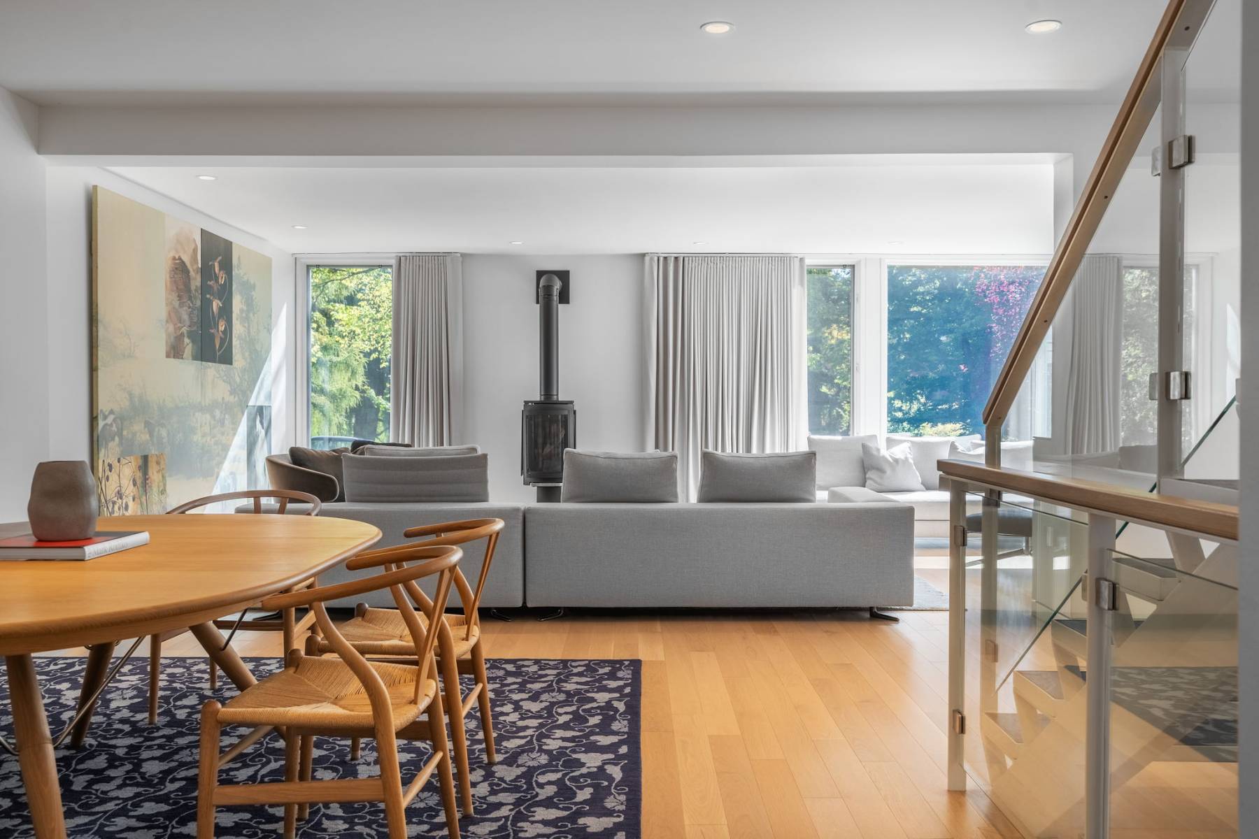 Clean lines, luminous interiors, and natural materials create a serene, gallery-like atmosphere. The sculptural steel staircase rises through three levels of light-filled space, while floor-to-ceiling windows frame ever-changing park and water views. Elegant open-concept living and dining spaces flow to a private rear terrace and enclosed cedar deck — ideal for entertaining or quiet reflection.