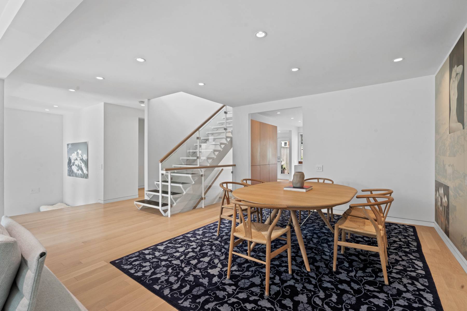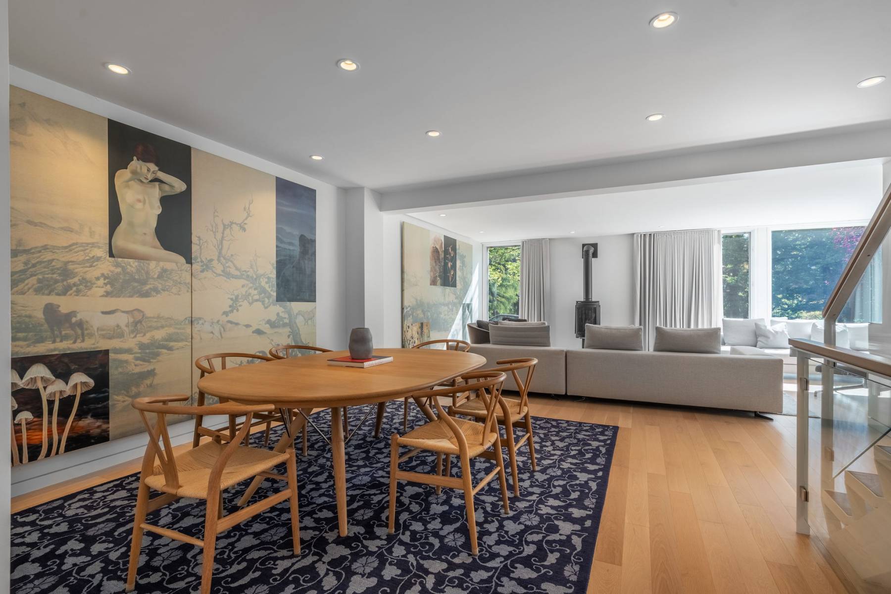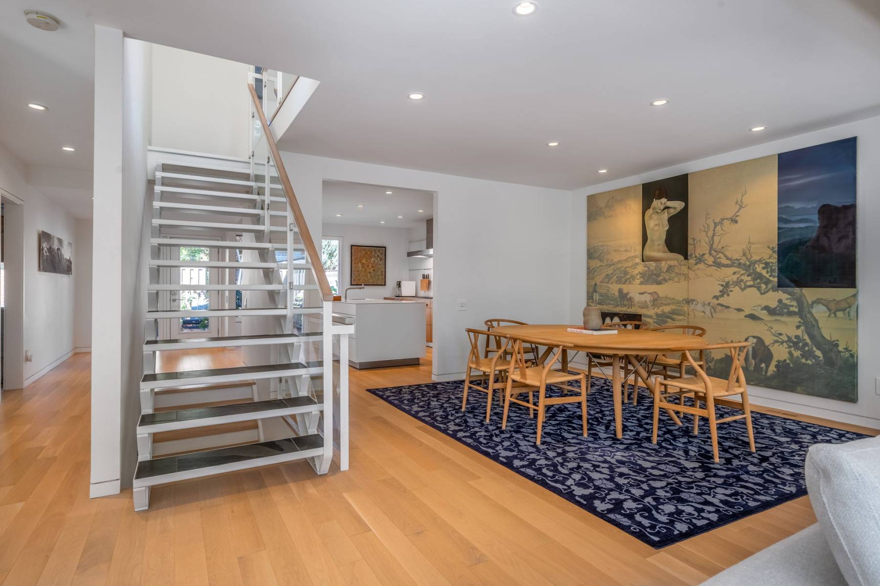 Clean lines, luminous interiors, and natural materials create a serene, gallery-like atmosphere. The sculptural steel staircase rises through three levels of light-filled space, while floor-to-ceiling windows frame ever-changing park and water views. Elegant open-concept living and dining spaces flow to a private rear terrace and enclosed cedar deck — ideal for entertaining or quiet reflection.