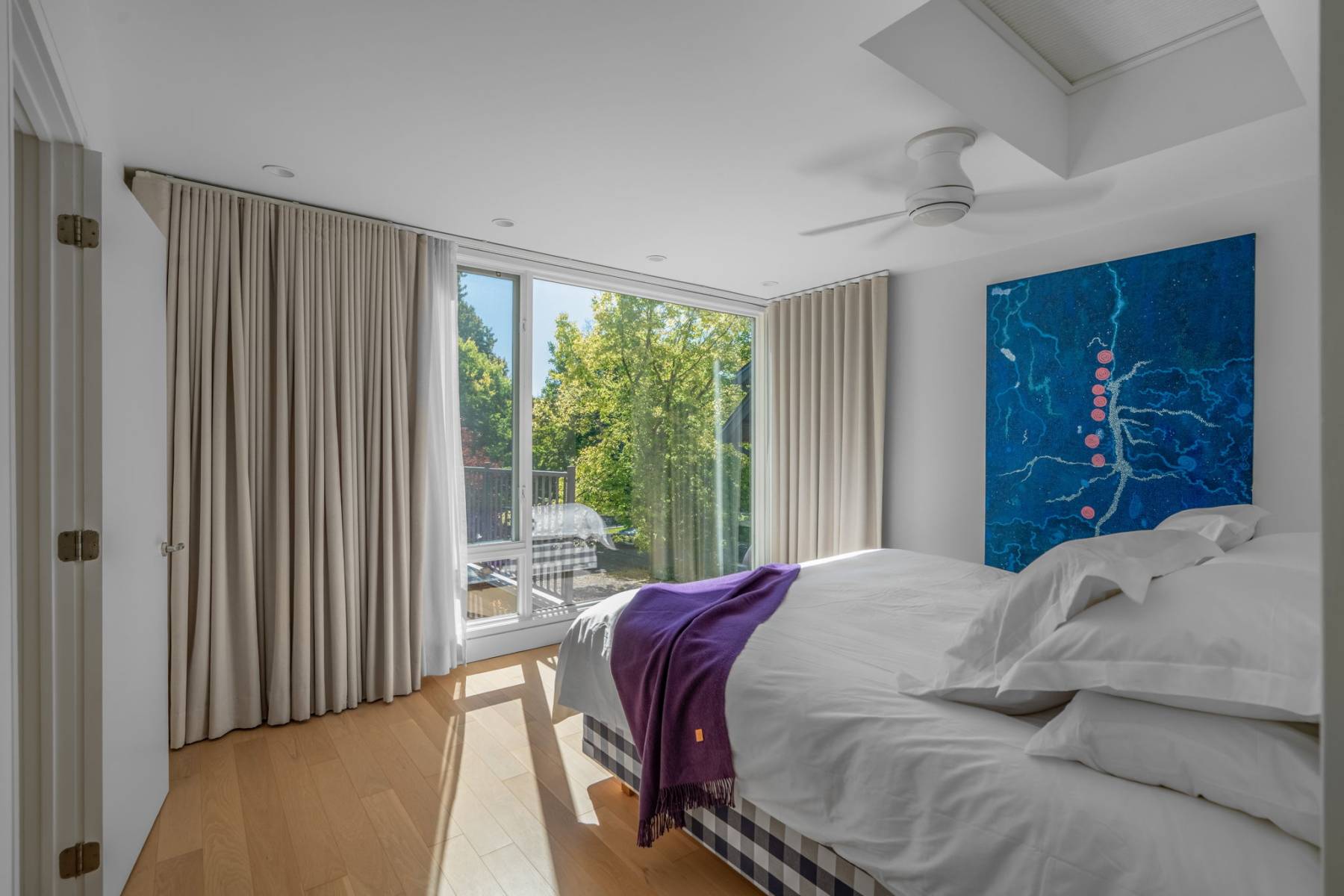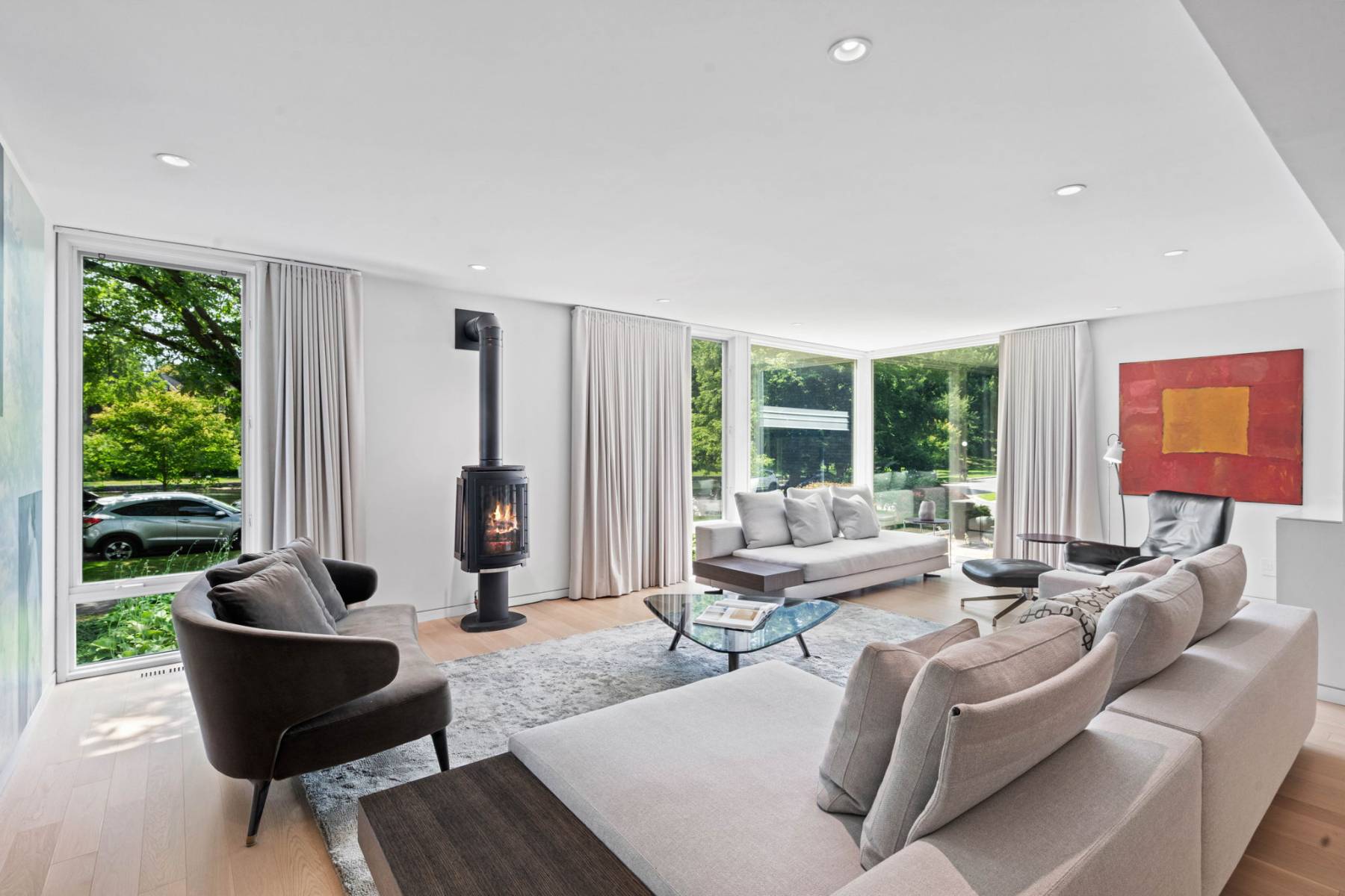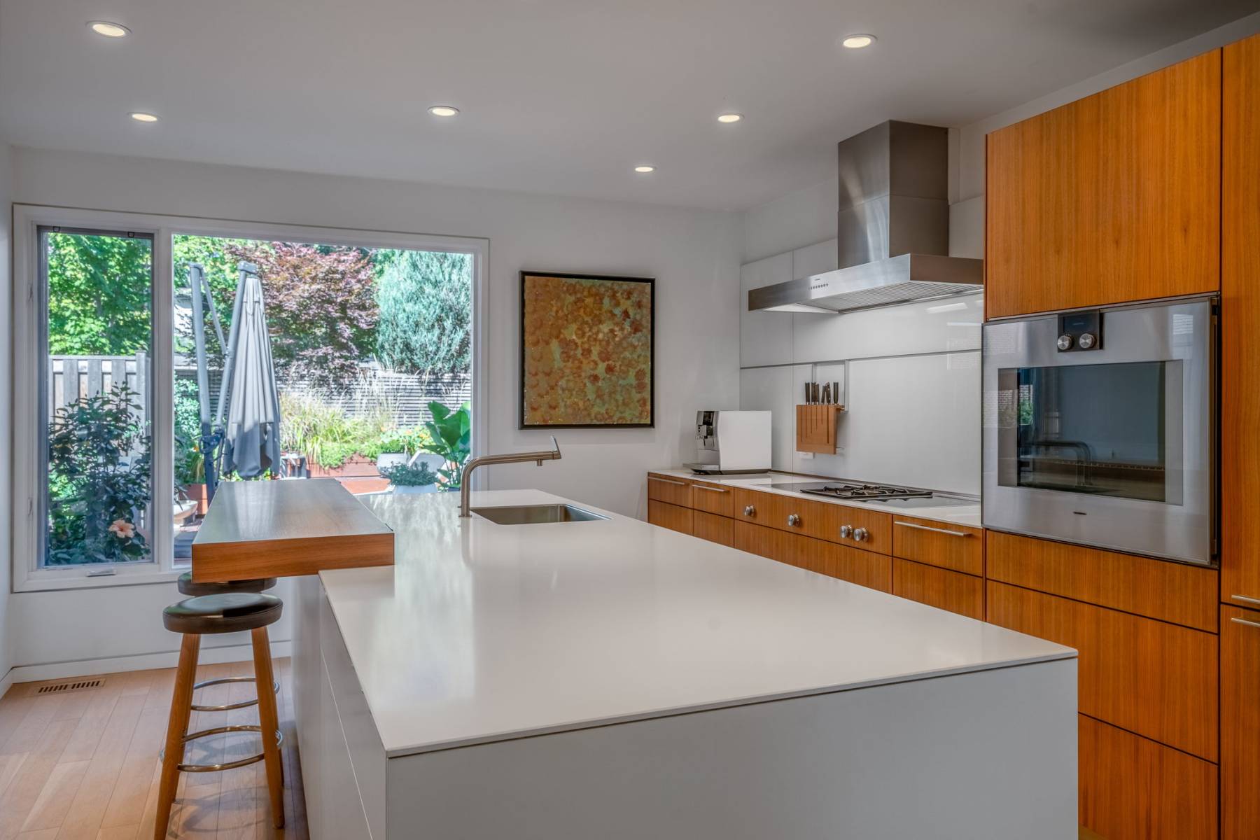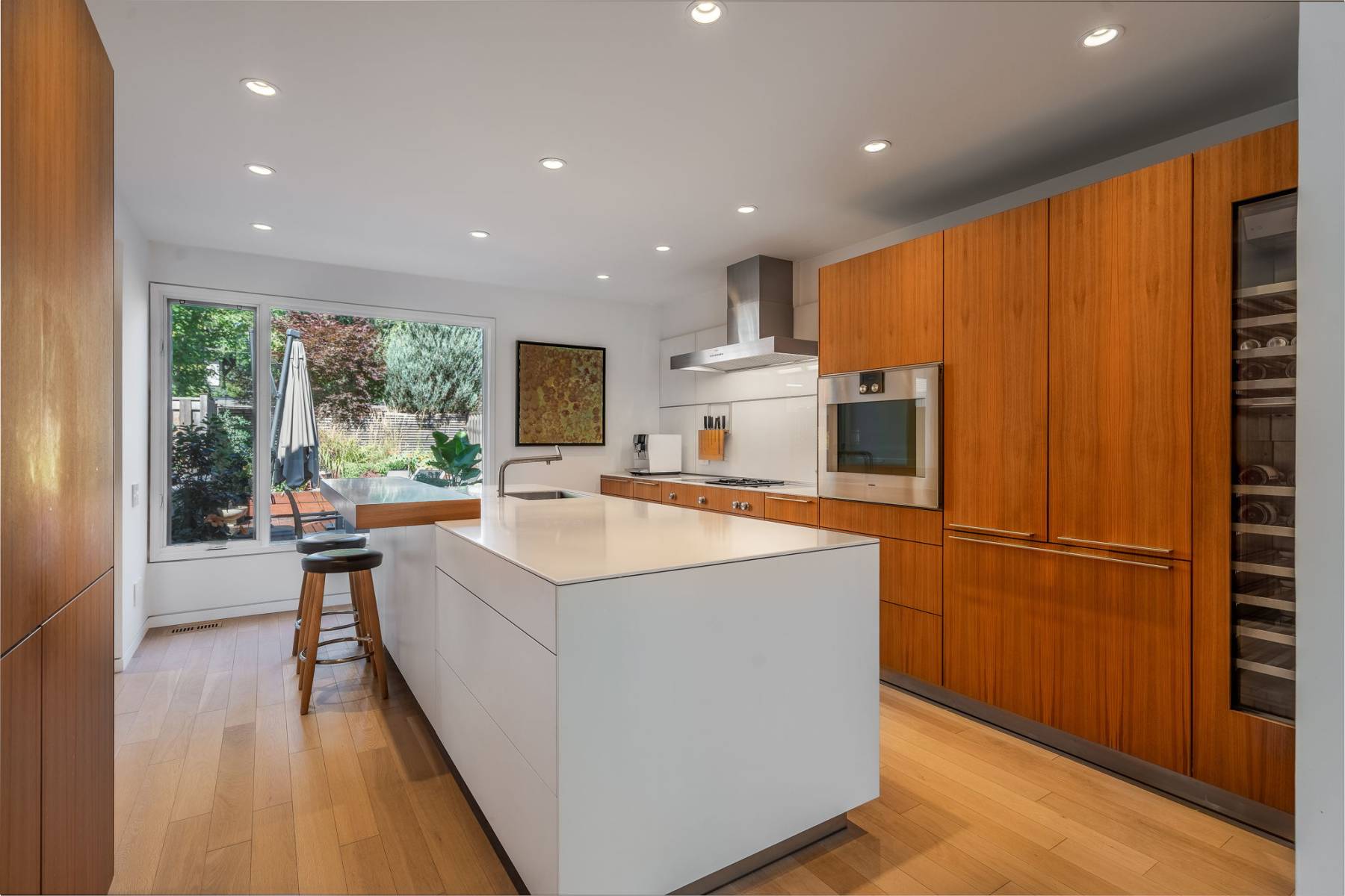 Clean lines, luminous interiors, and natural materials create a serene, gallery-like atmosphere. The sculptural steel staircase rises through three levels of light-filled space, while floor-to-ceiling windows frame ever-changing park and water views. Elegant open-concept living and dining spaces flow to a private rear terrace and enclosed cedar deck — ideal for entertaining or quiet reflection.