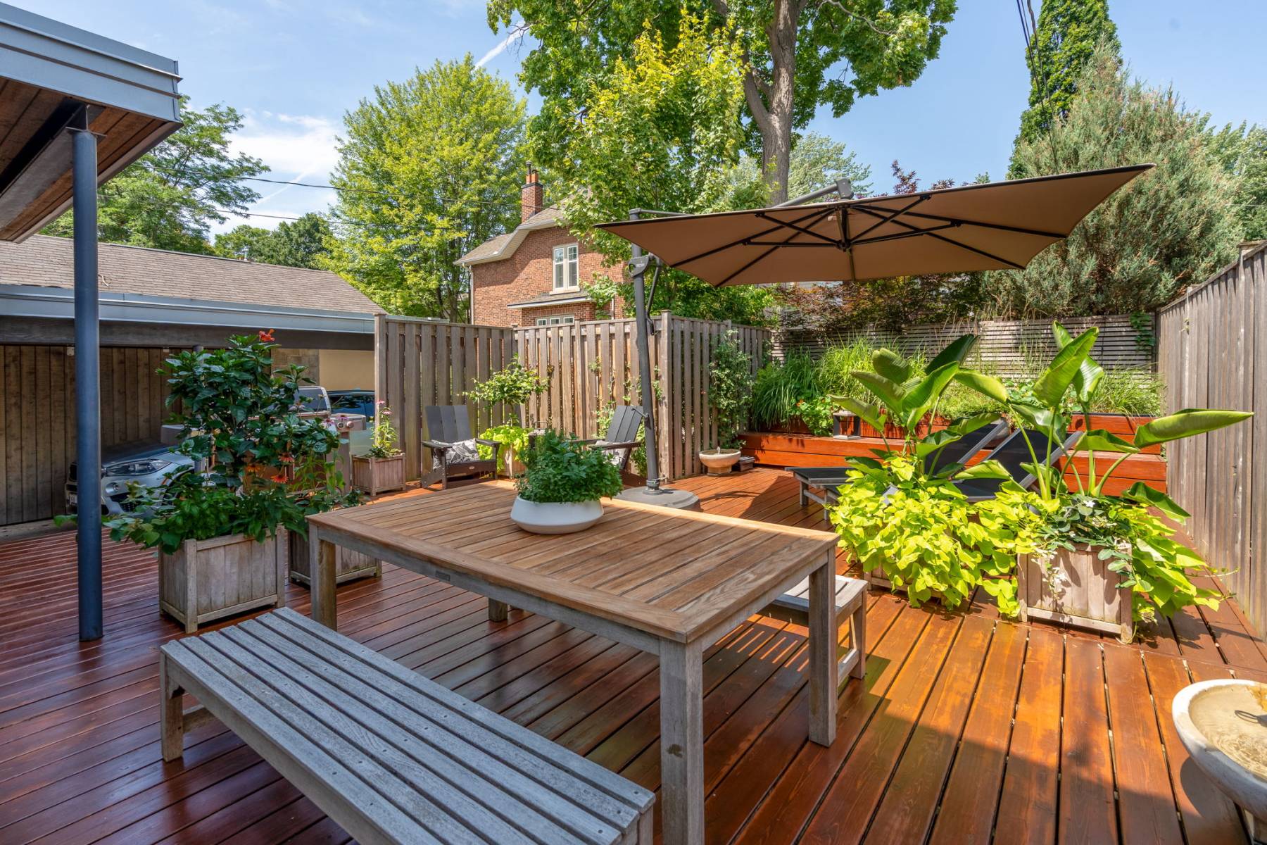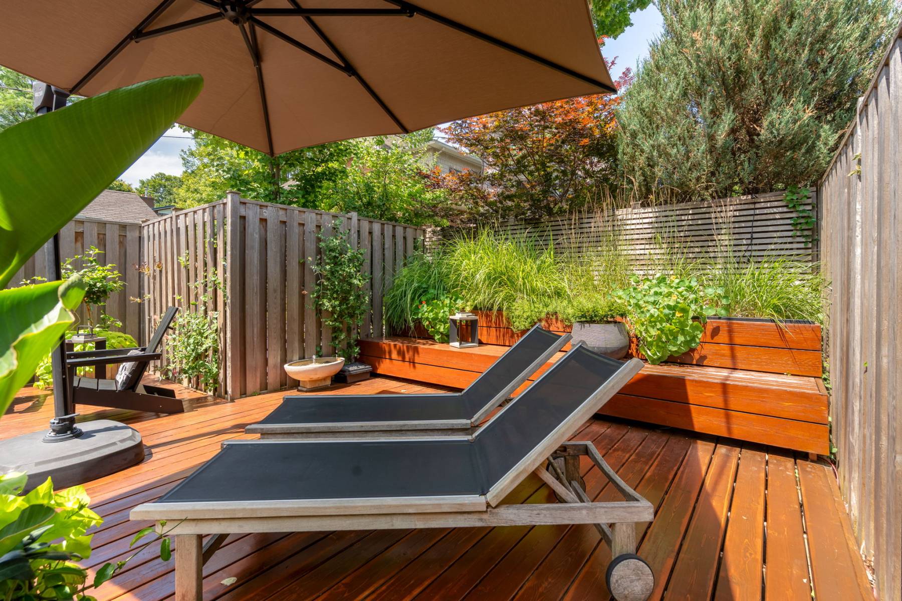 Cedar deck + integrated planter / bench, fully fenced and very private.