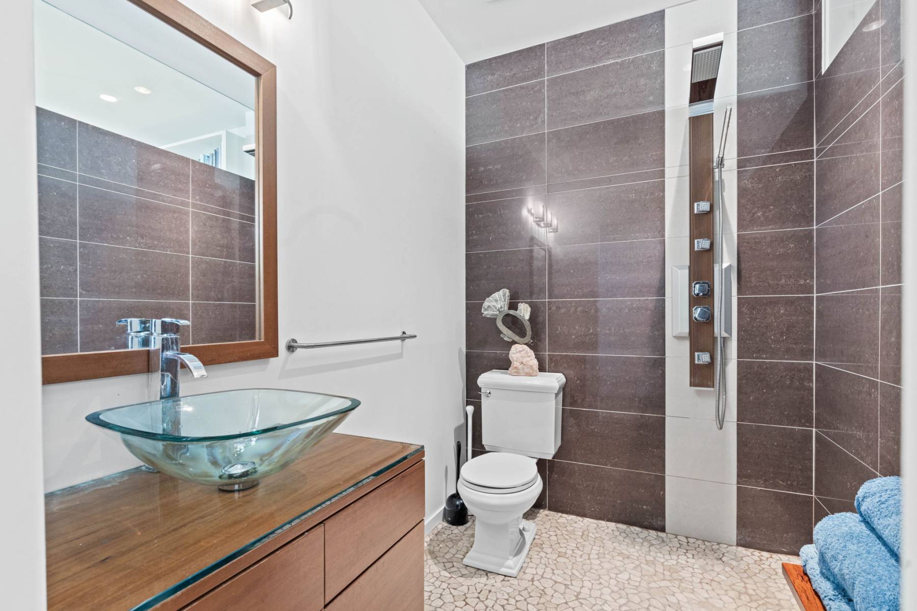 3pc ,floating vanity with glass vessel sink, large shower stall with quality fixtures. tile floor , glass transom provides natural light.