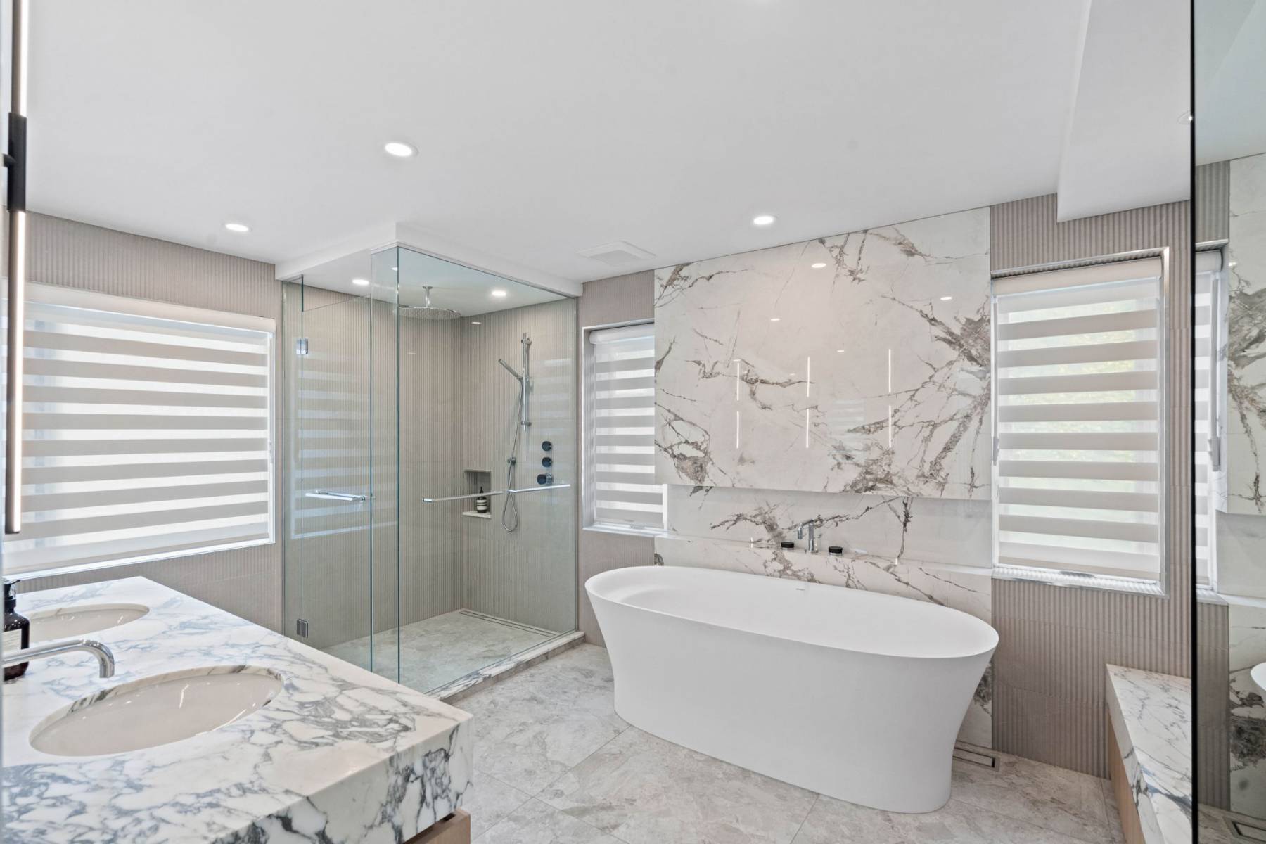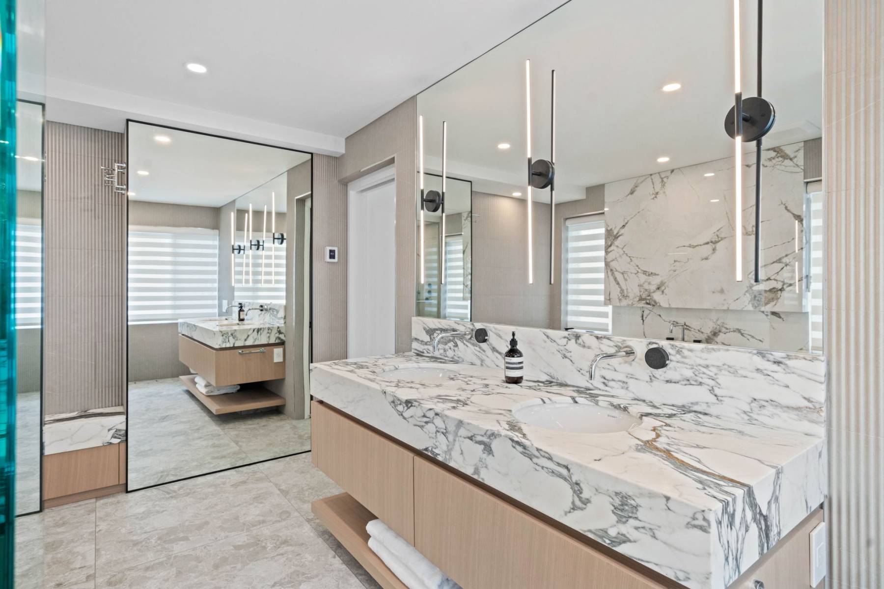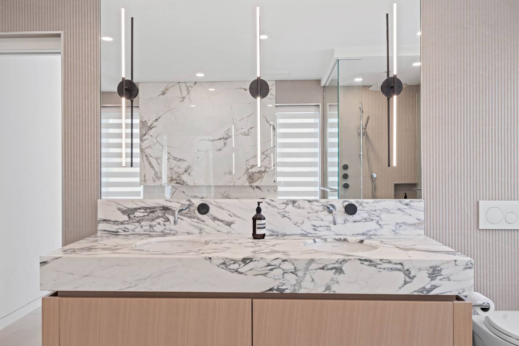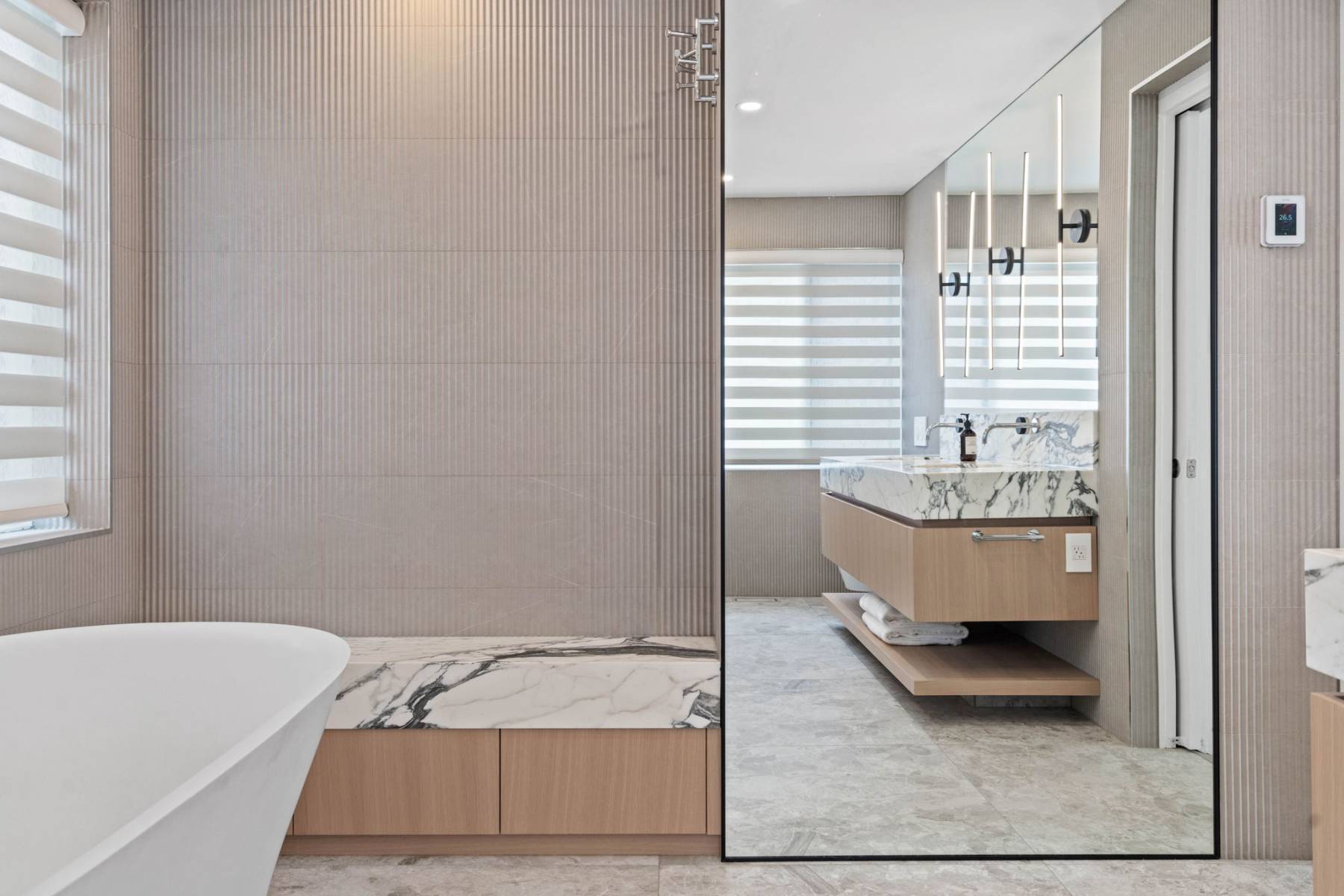 Vanity, bench + shower still - Arabescato marble Tub wall - porcelain Custom mirrors, Toto in-wall toilet, in floor heating