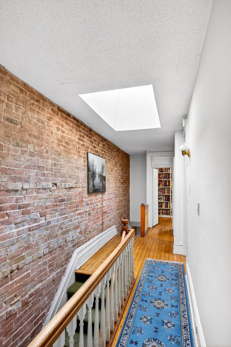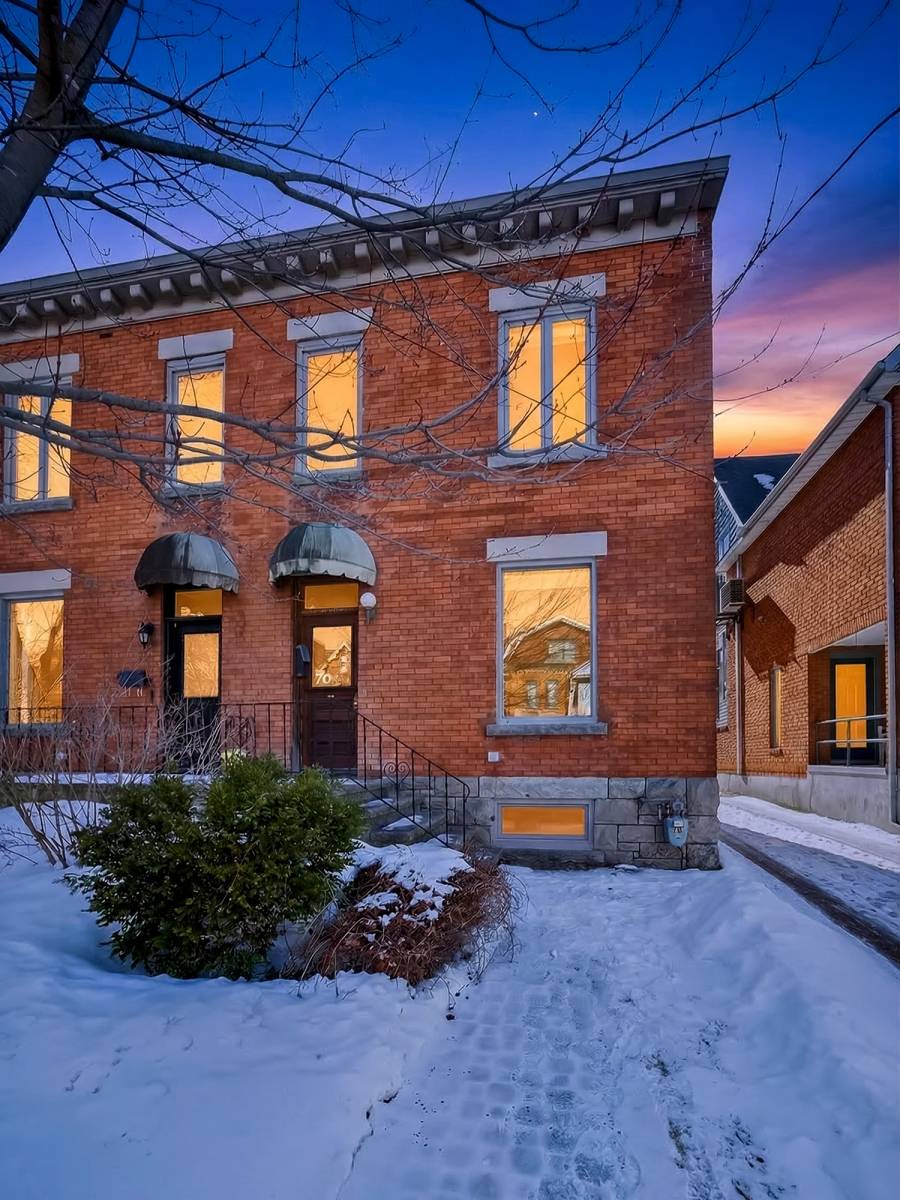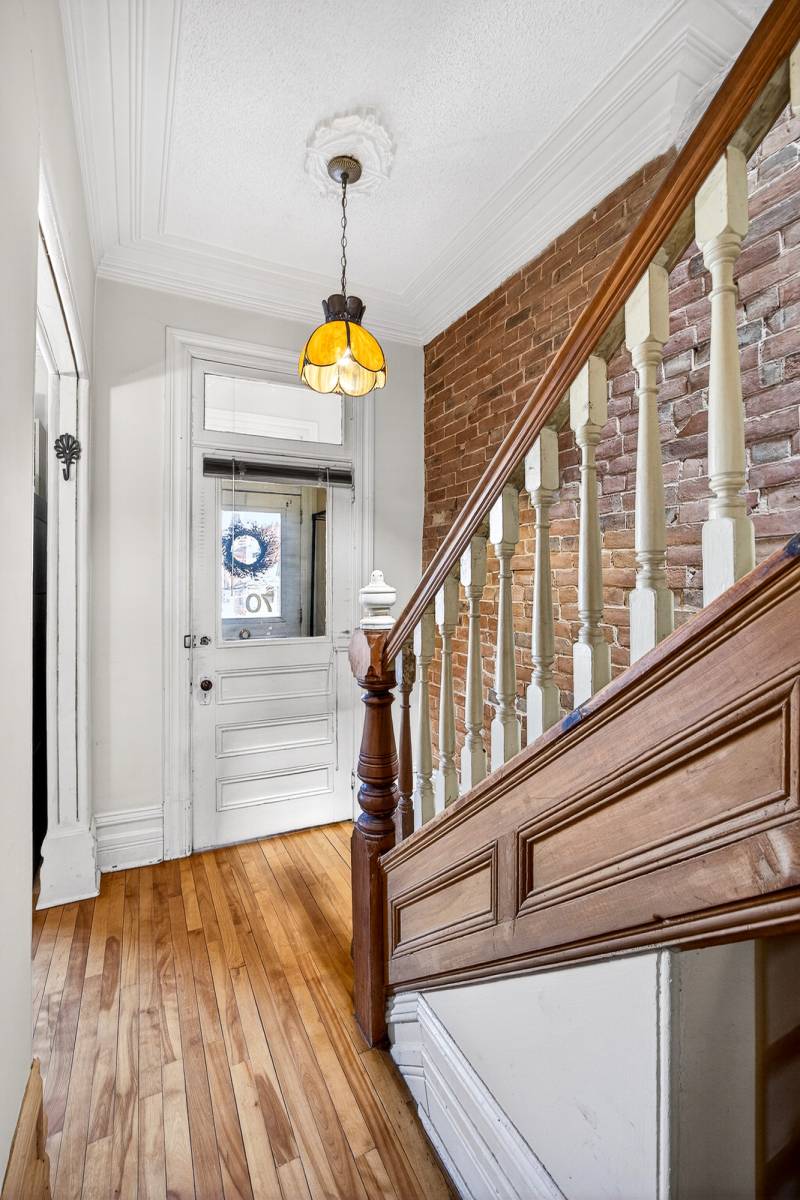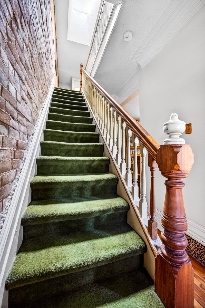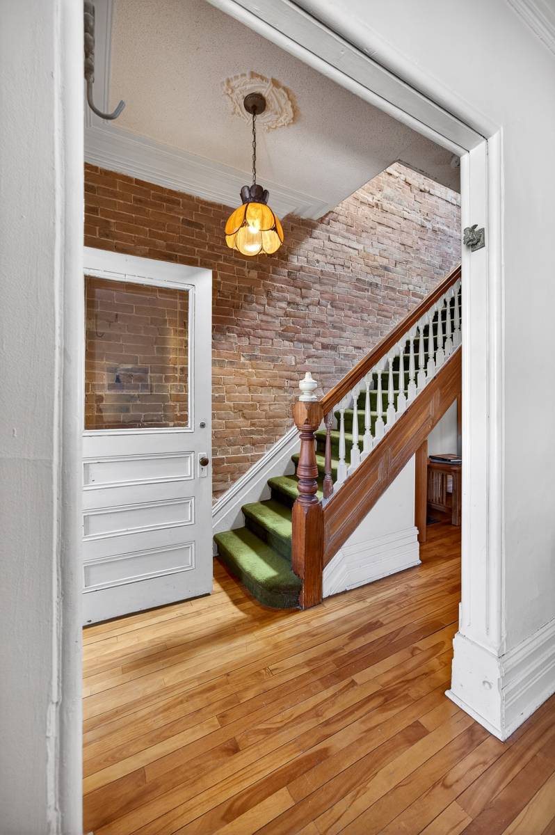 Inside, timeless details reflect the home’s original charm. An exposed brick wall anchors the main living space, while a classic spindle railing staircase, high baseboards, crown mouldings, and hardwood flooring add warmth and character throughout. A skylight (2022) fills the stairwell and upper landing with natural light, enhancing the home’s inviting atmosphere.