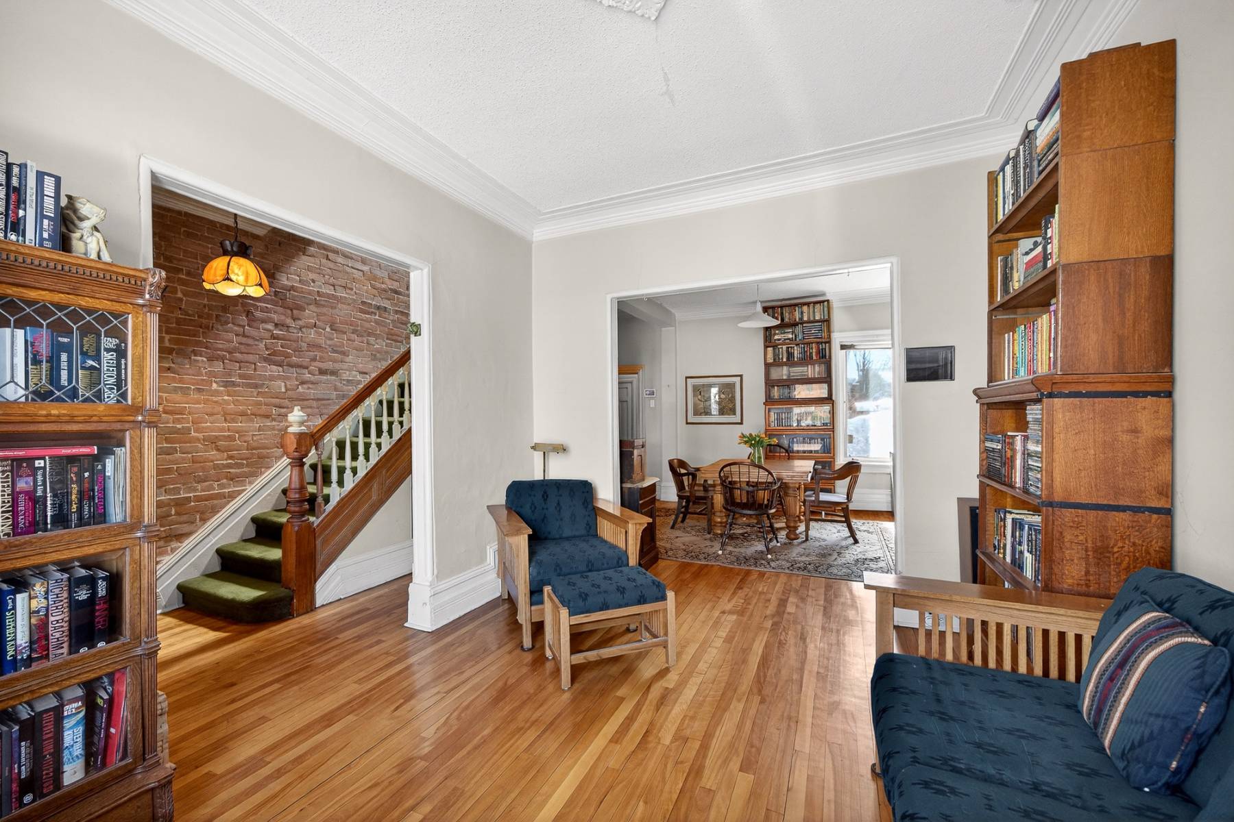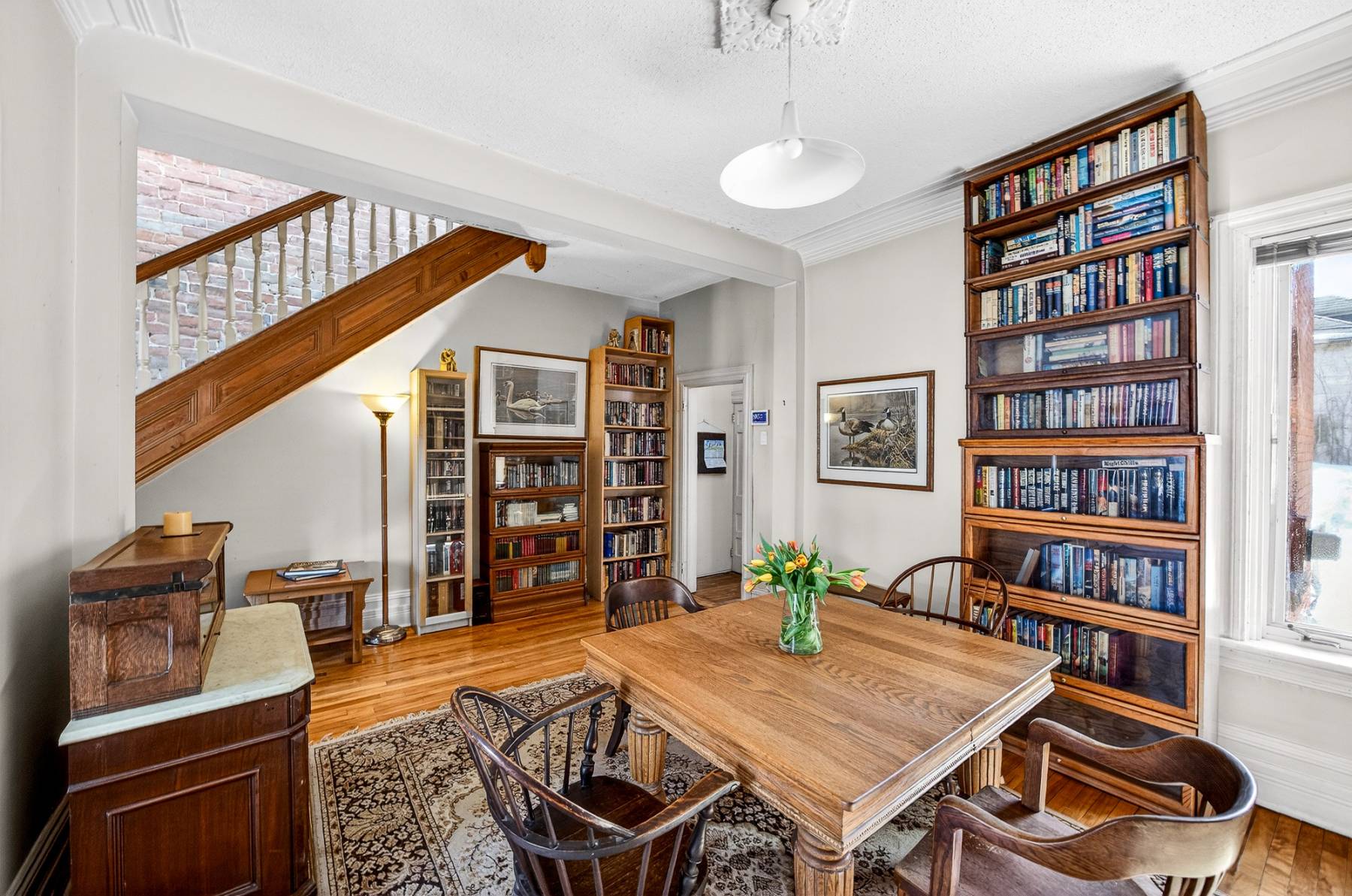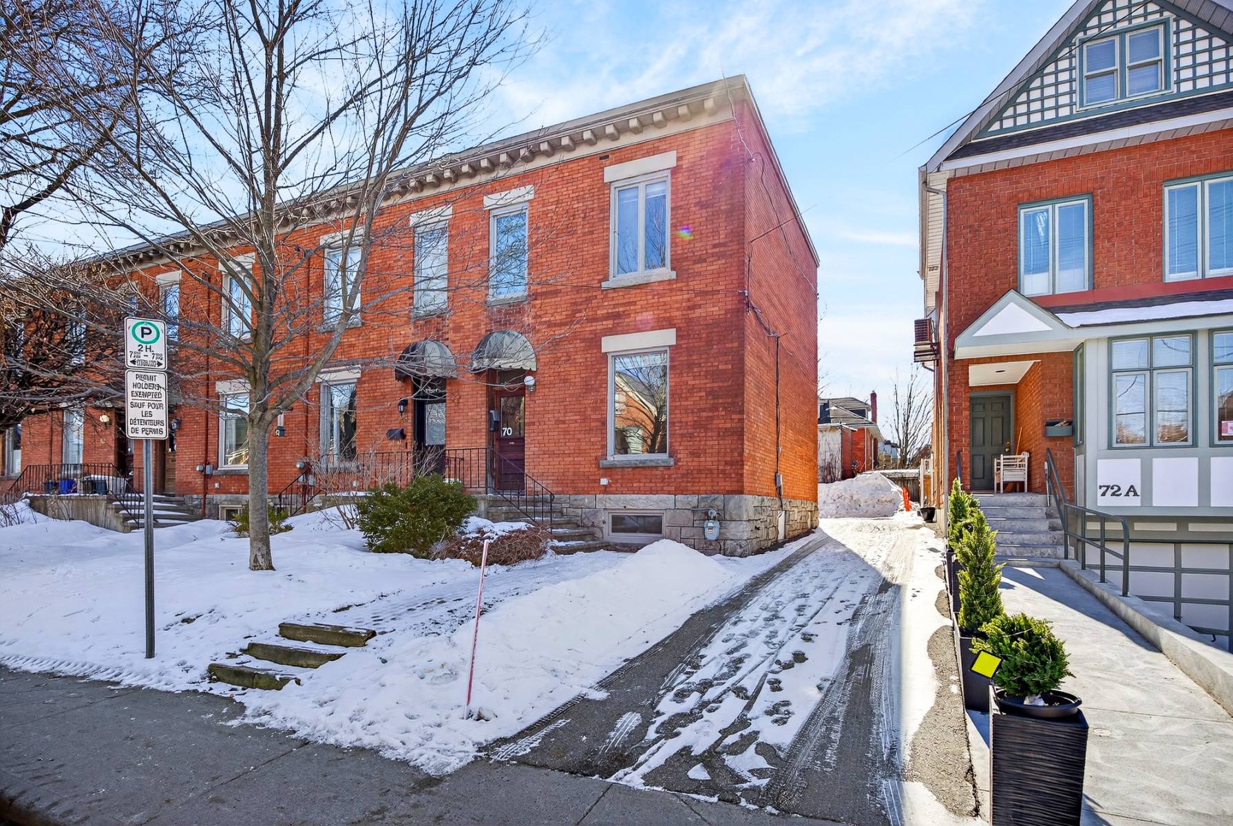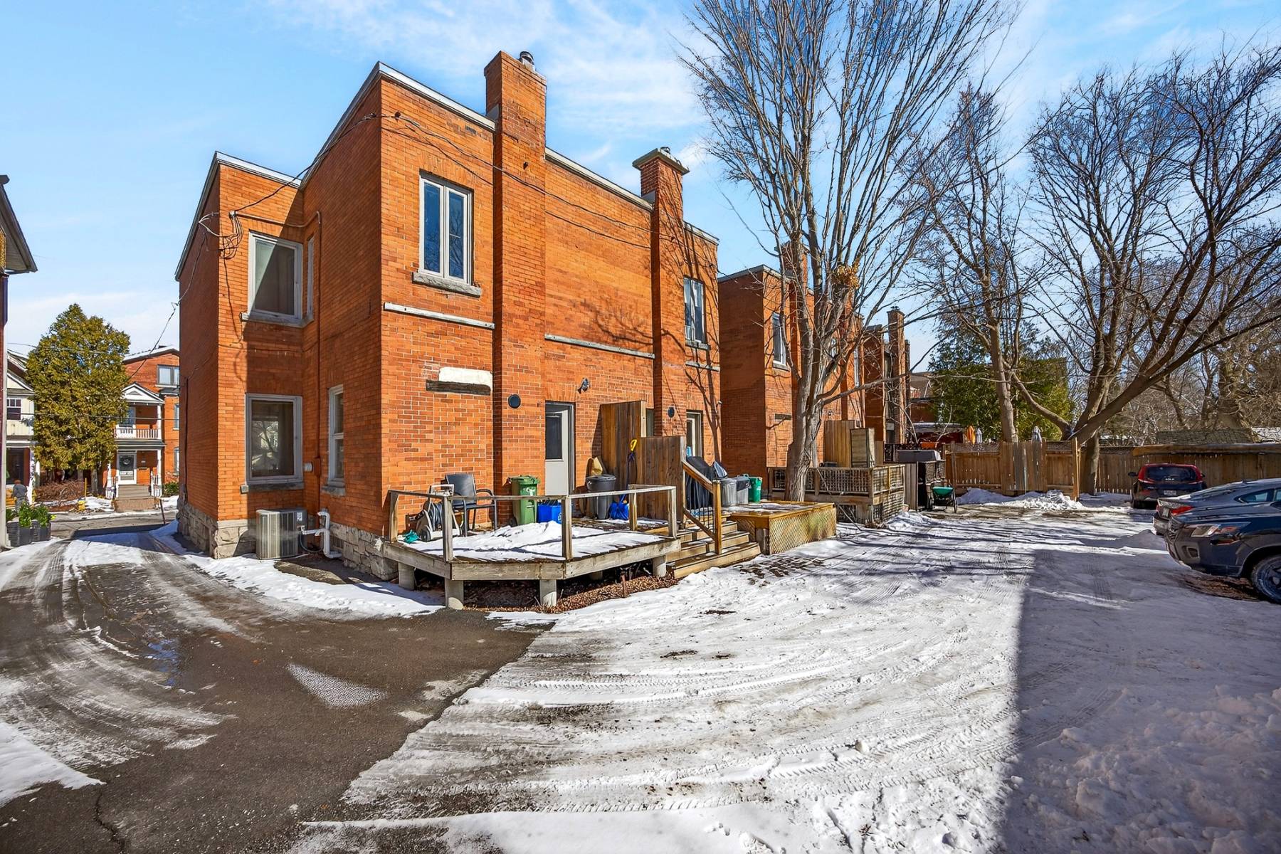 Inside, timeless details reflect the home’s original charm. An exposed brick wall anchors the main living space, while a classic spindle railing staircase, high baseboards, crown mouldings, and hardwood flooring add warmth and character throughout. A skylight (2022) fills the stairwell and upper landing with natural light, enhancing the home’s inviting atmosphere.
