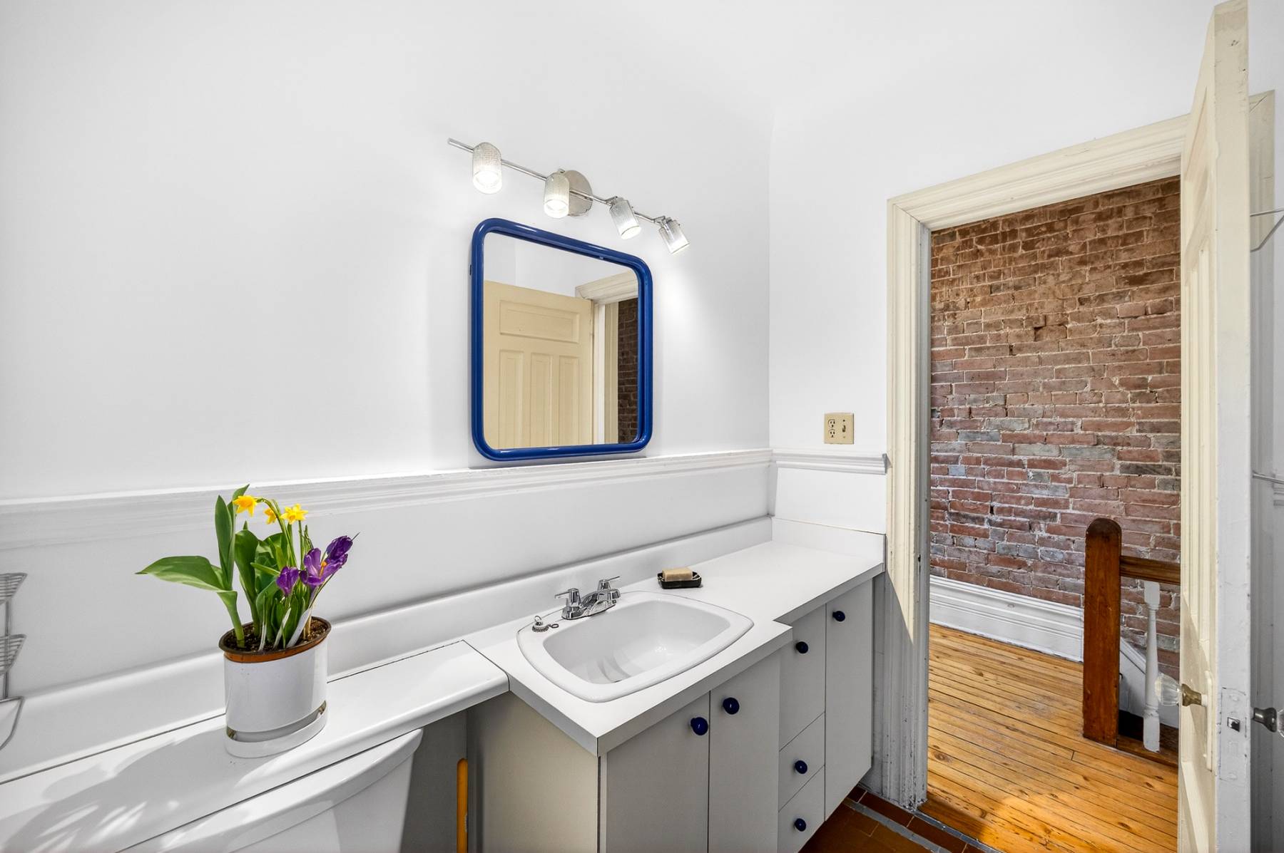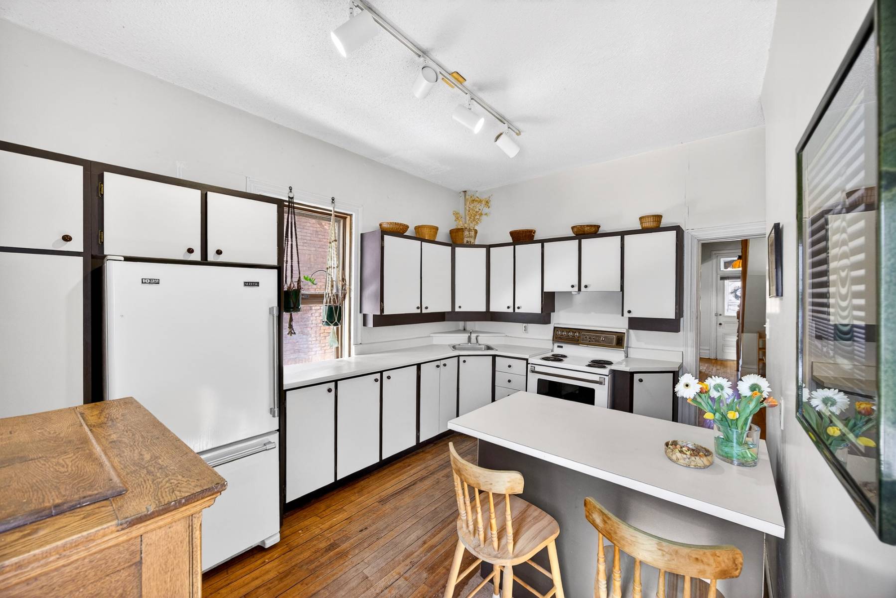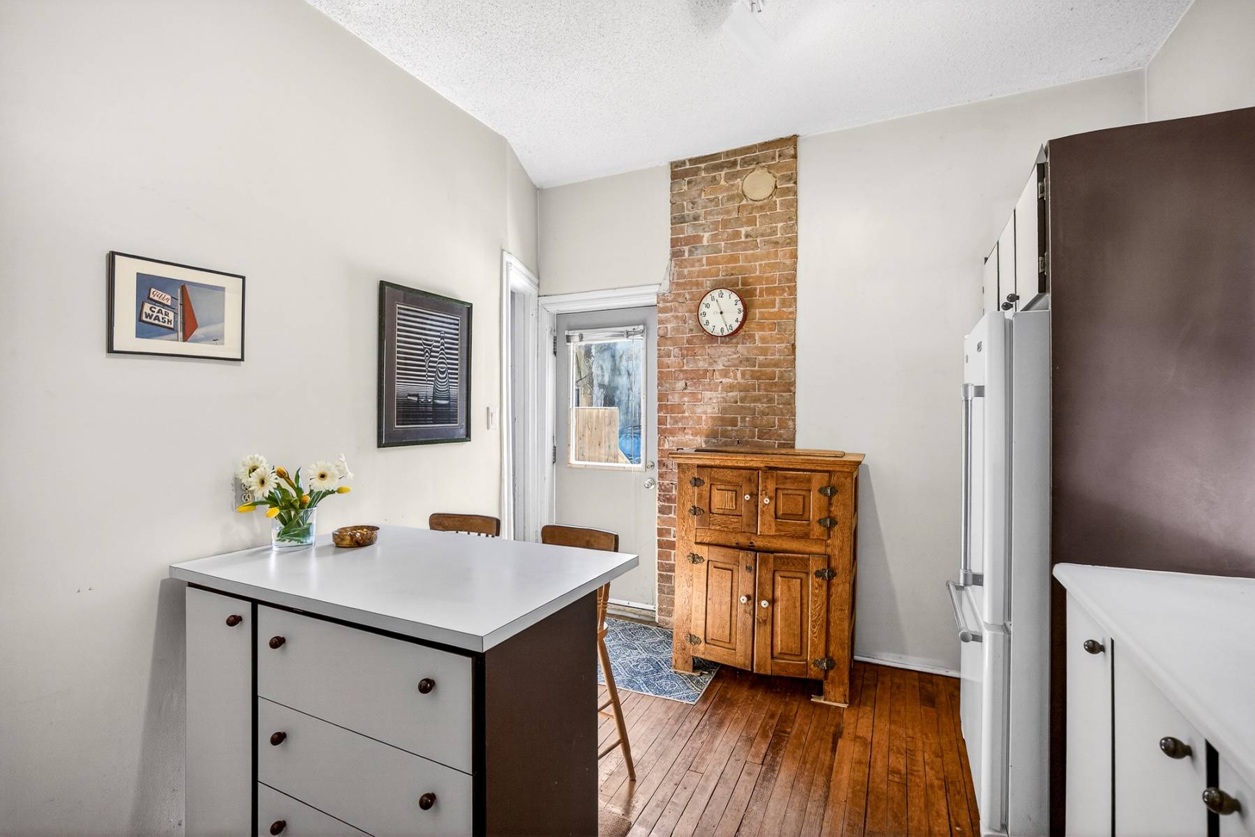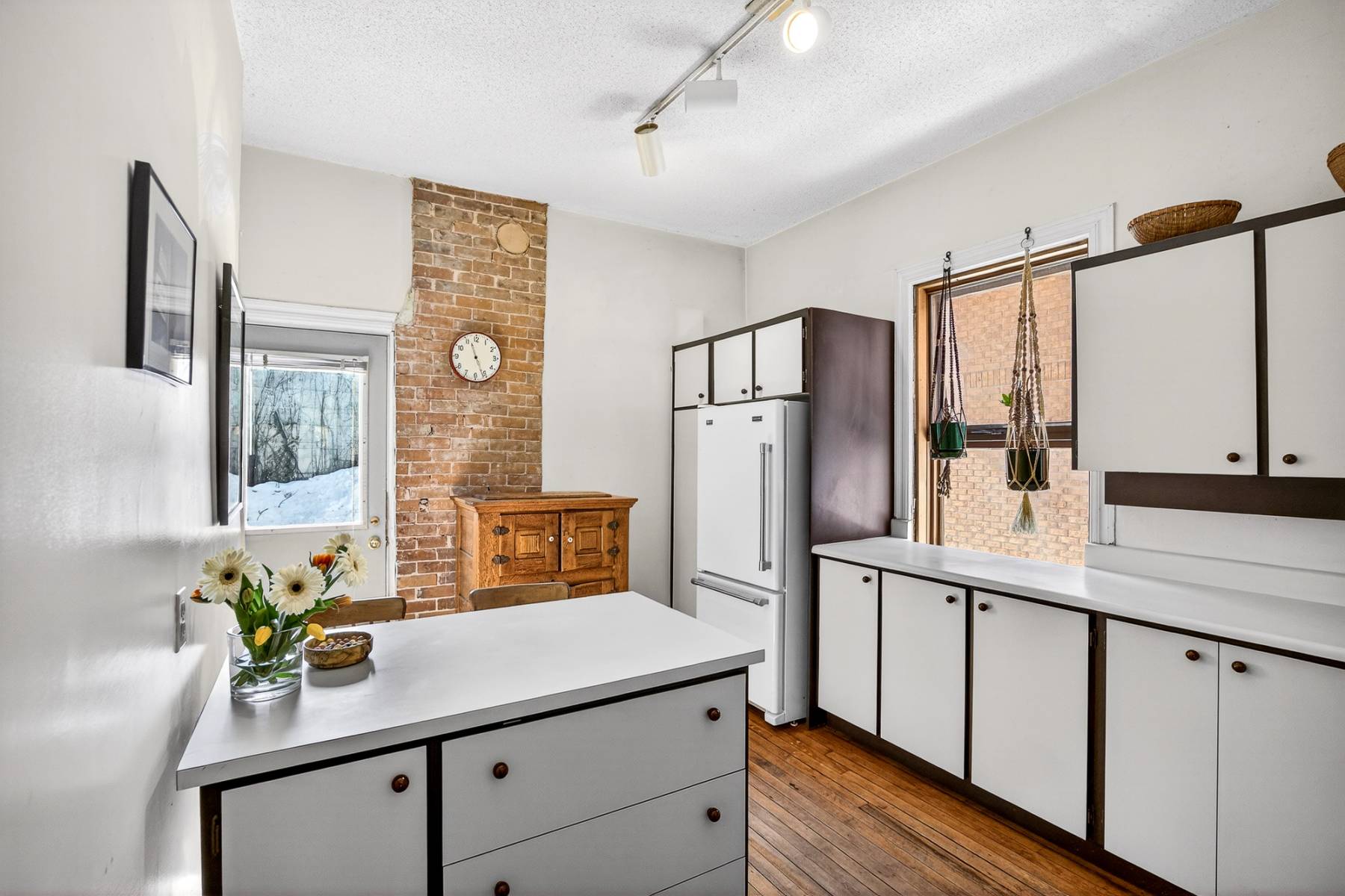 Inside, timeless details reflect the home’s original charm. An exposed brick wall anchors the main living space, while a classic spindle railing staircase, high baseboards, crown mouldings, and hardwood flooring add warmth and character throughout. A skylight (2022) fills the stairwell and upper landing with natural light, enhancing the home’s inviting atmosphere.