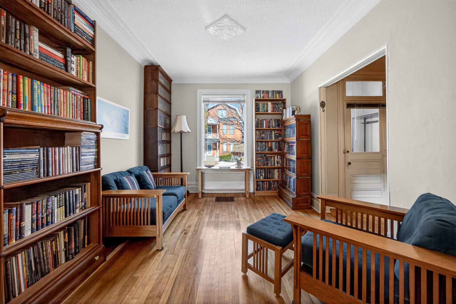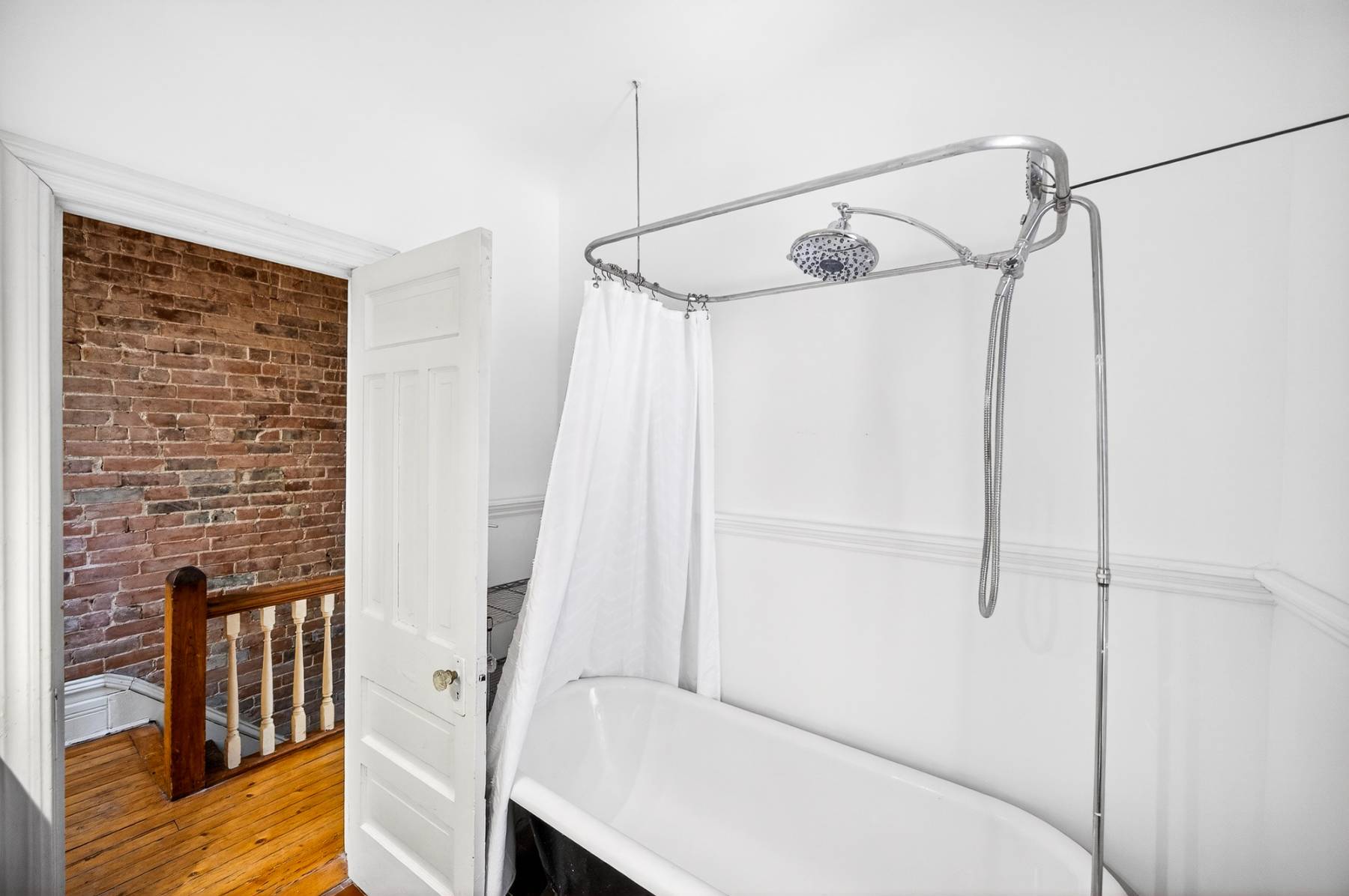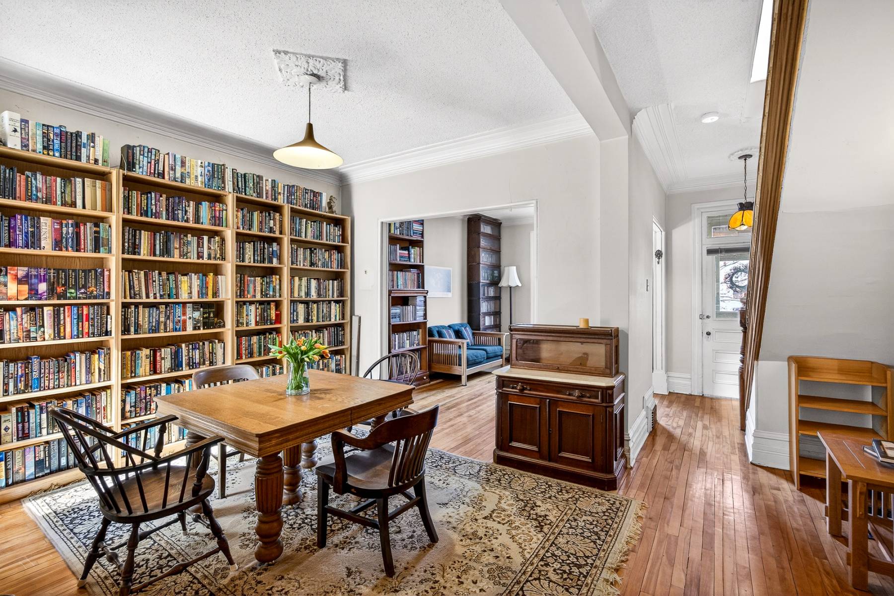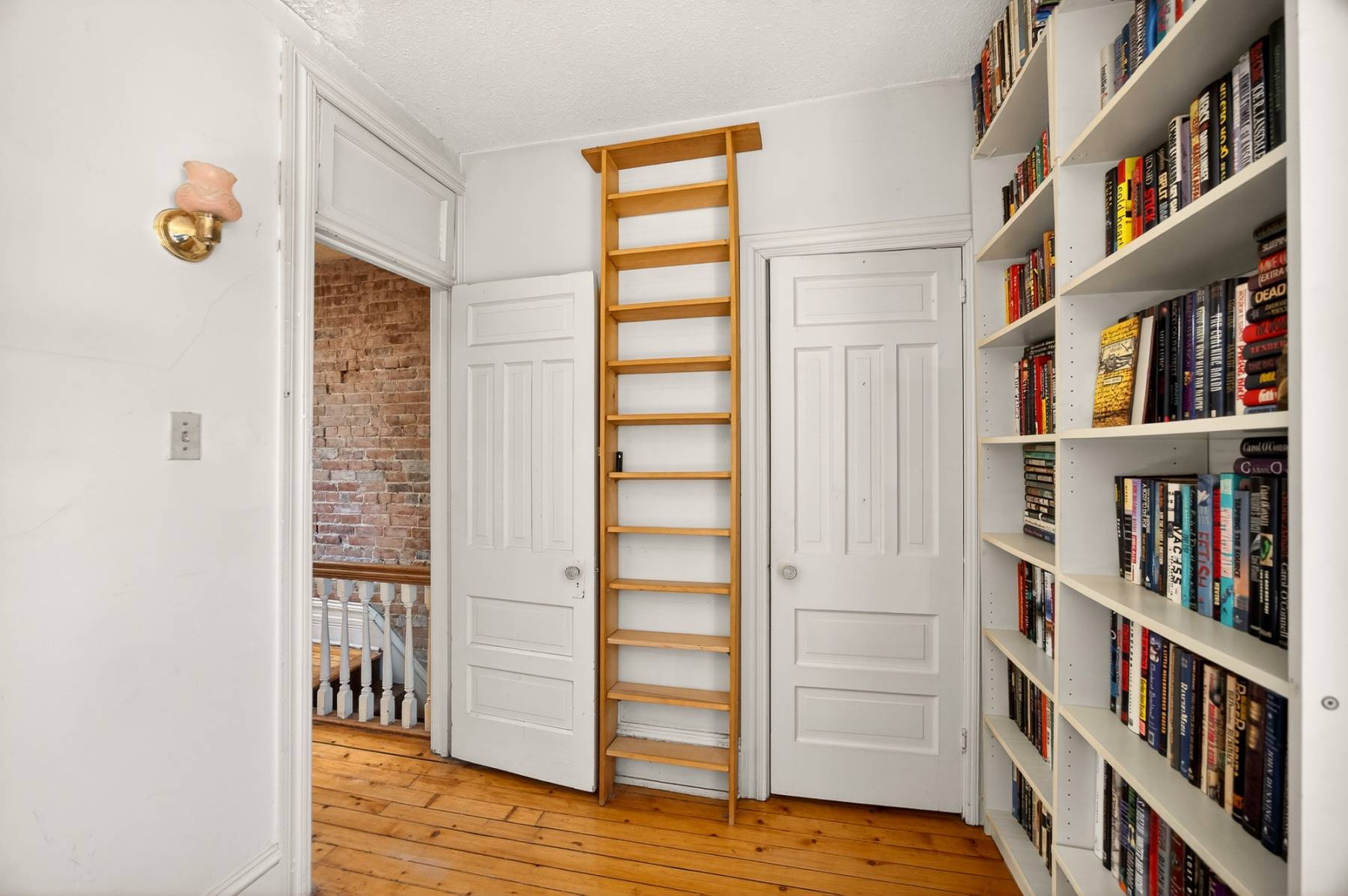 Inside, timeless details reflect the home’s original charm. An exposed brick wall anchors the main living space, while a classic spindle railing staircase, high baseboards, crown mouldings, and hardwood flooring add warmth and character throughout. A skylight (2022) fills the stairwell and upper landing with natural light, enhancing the home’s inviting atmosphere.