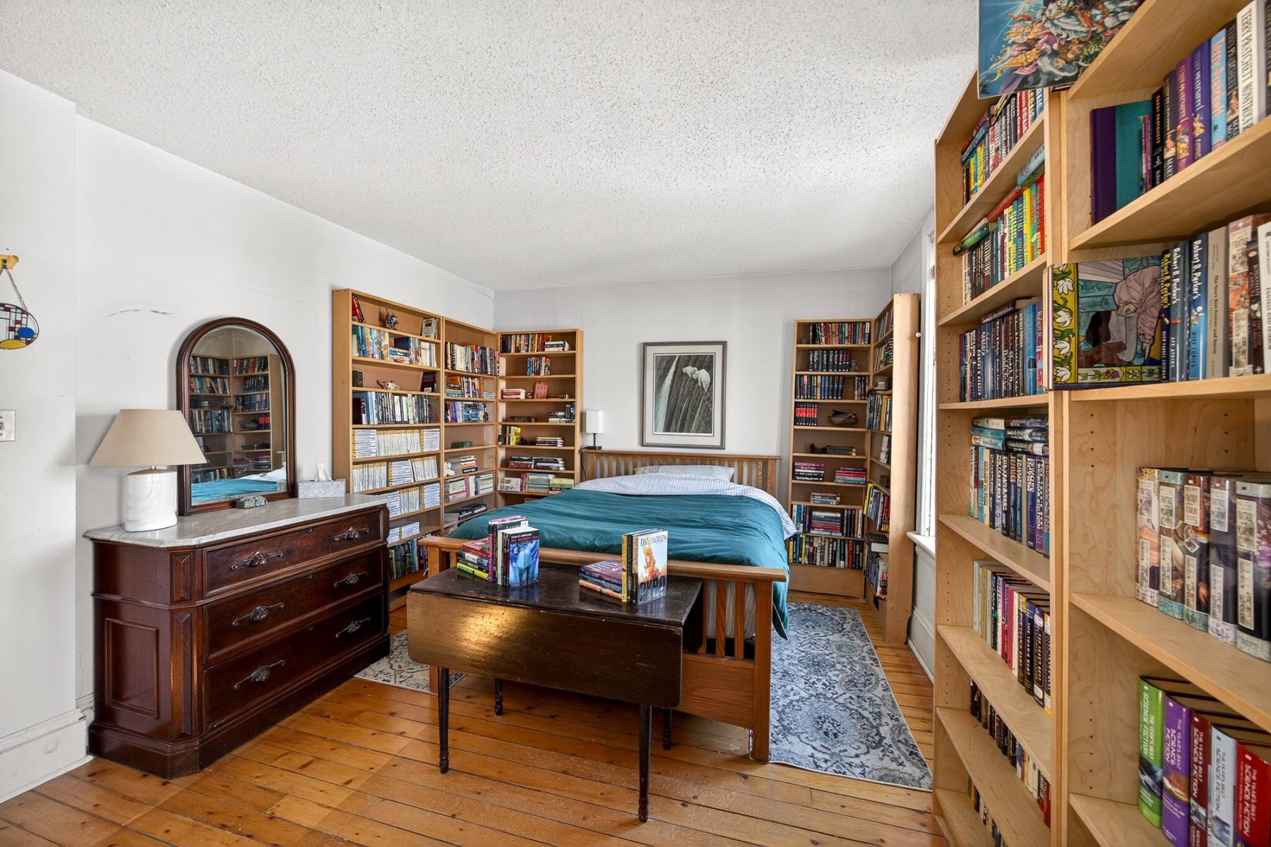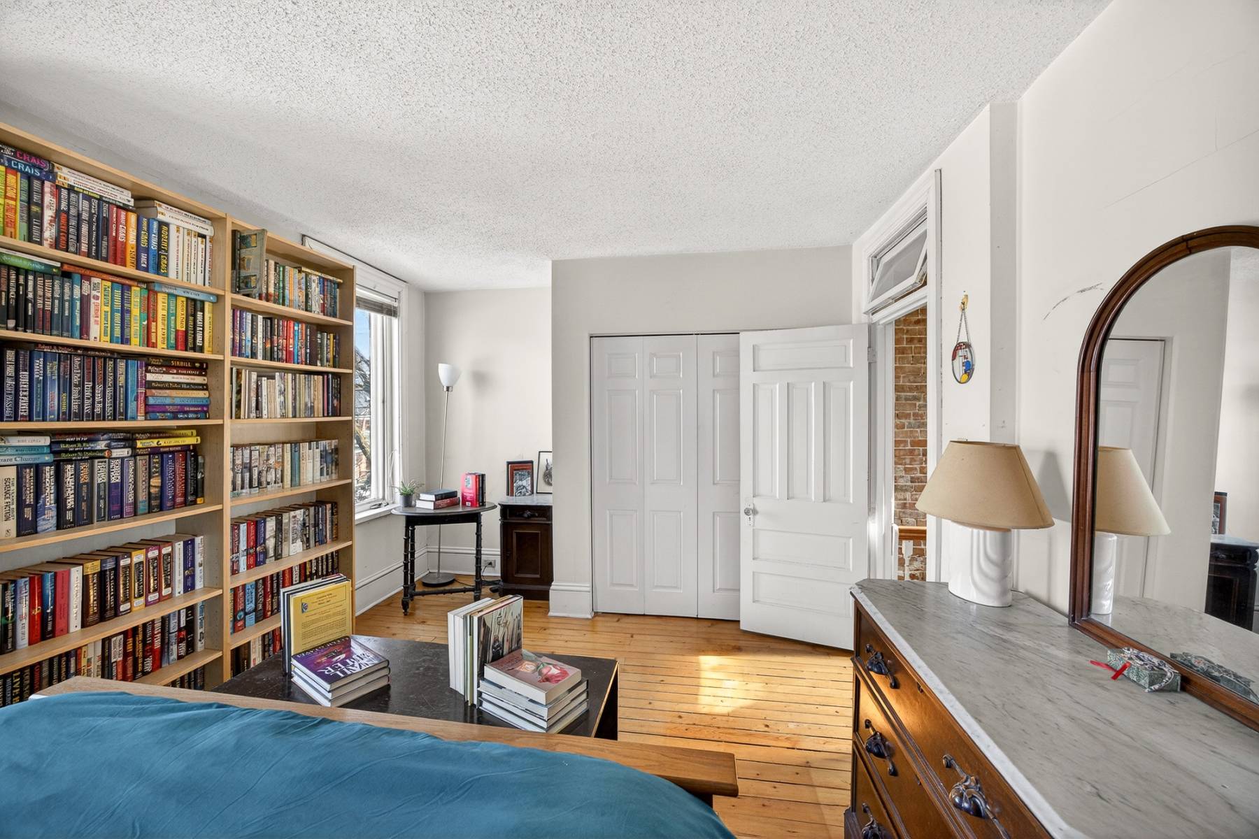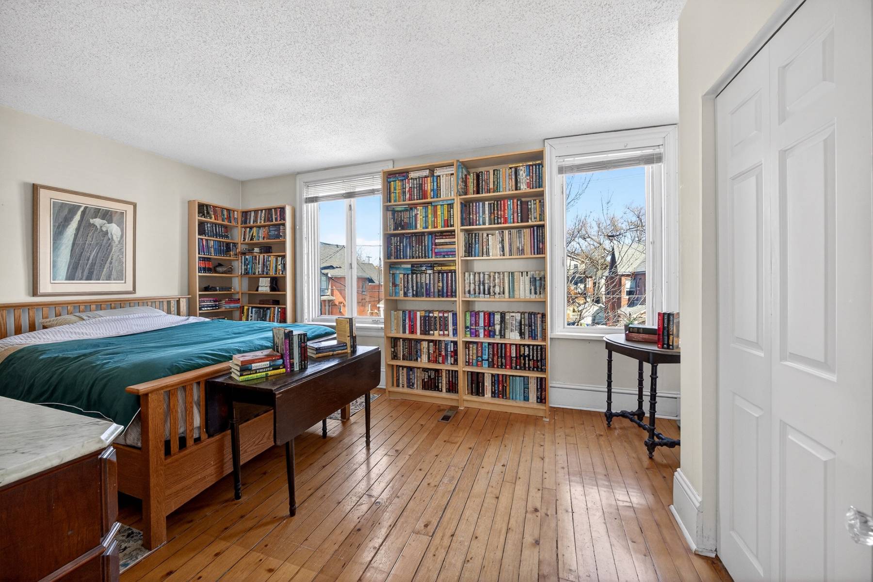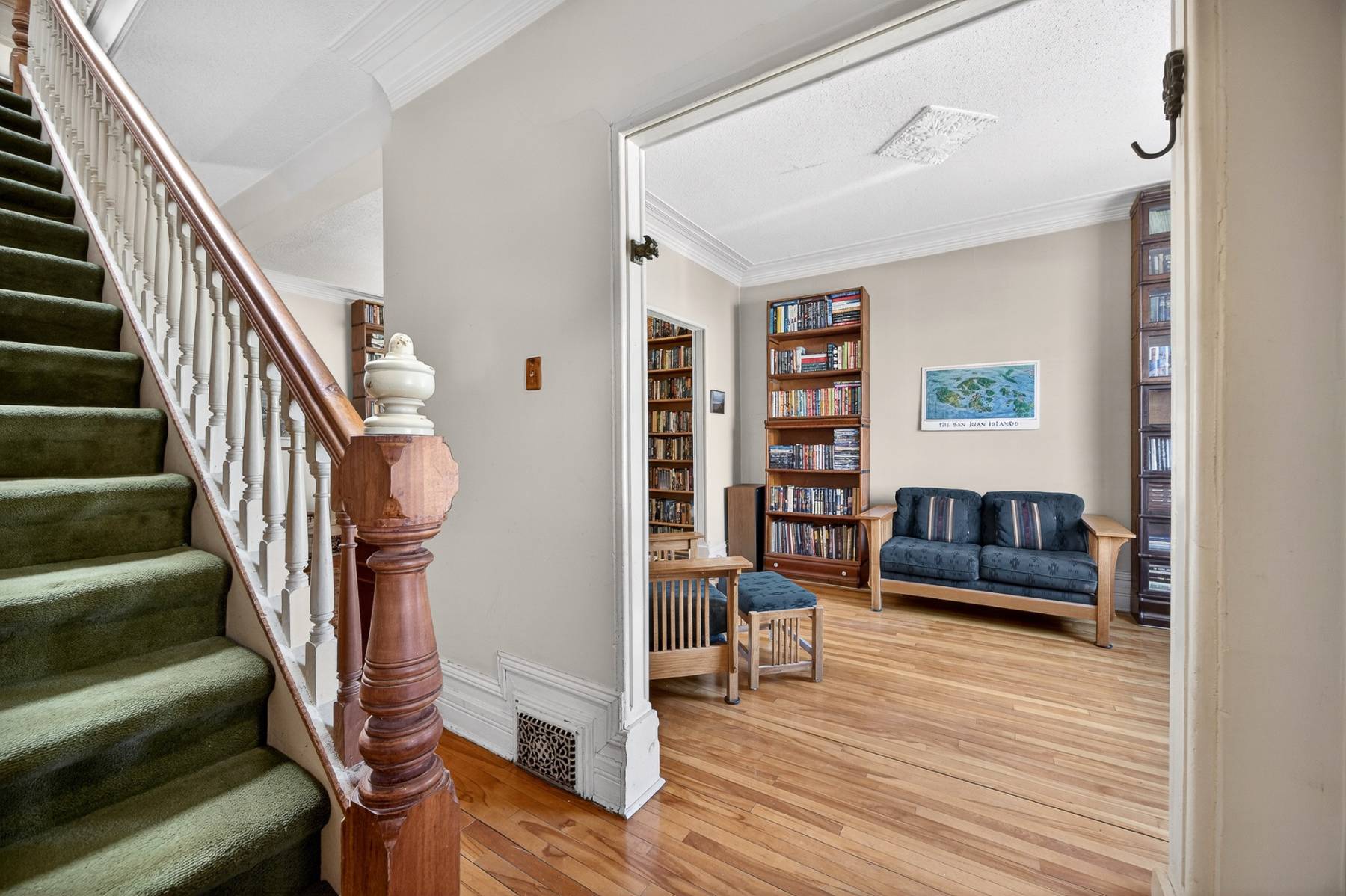 Upstairs, the primary bedroom spans the full width of the home, accompanied by two additional bedrooms and a full bathroom. Original softwood floors add authenticity and charm to the upper level.