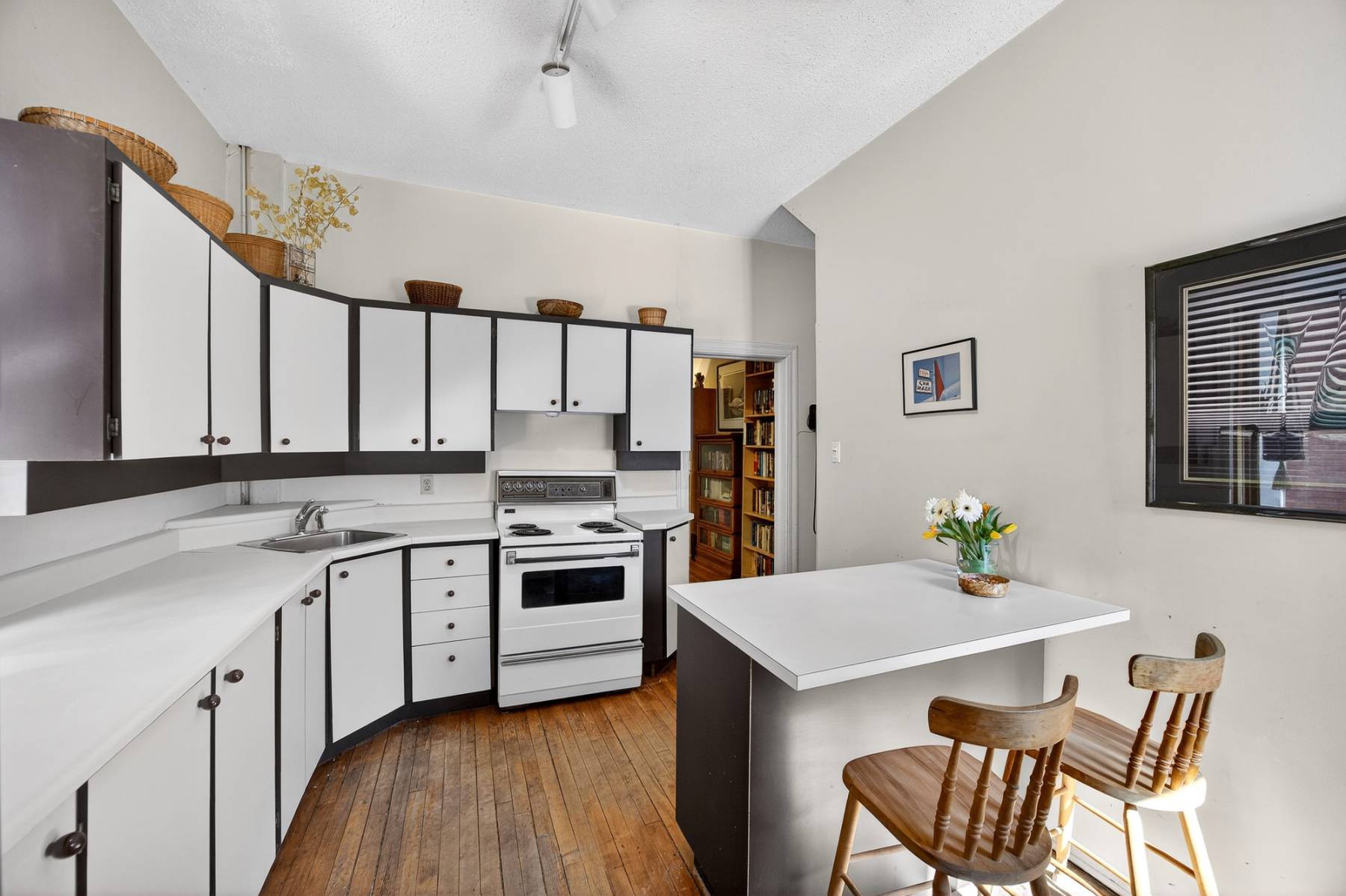 The principal rooms are generously sized, offering a comfortable and functional layout. The kitchen is well-proportioned and ready for a fresh vision, complete with a secondary staircase to the second level — a unique and flexible feature rarely found. Many are removed to provide a larger foot print to a kitchen.