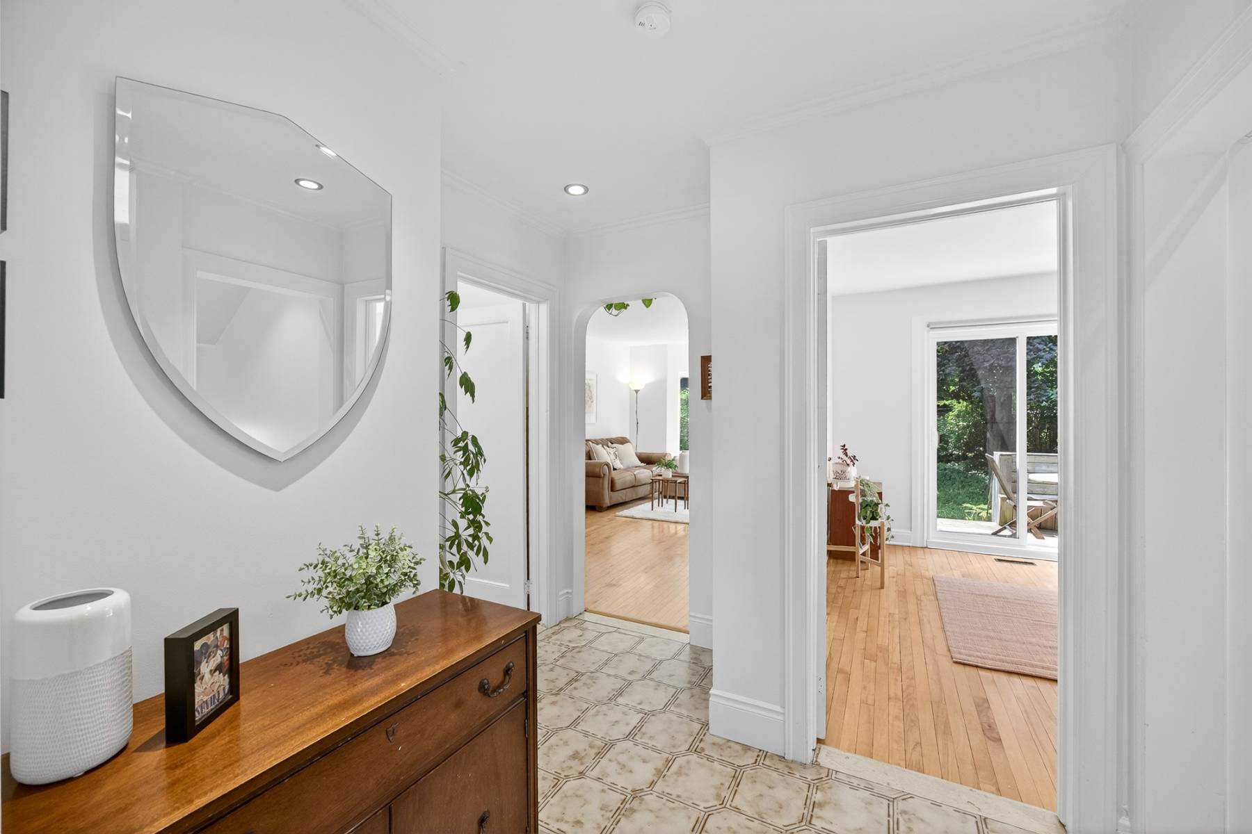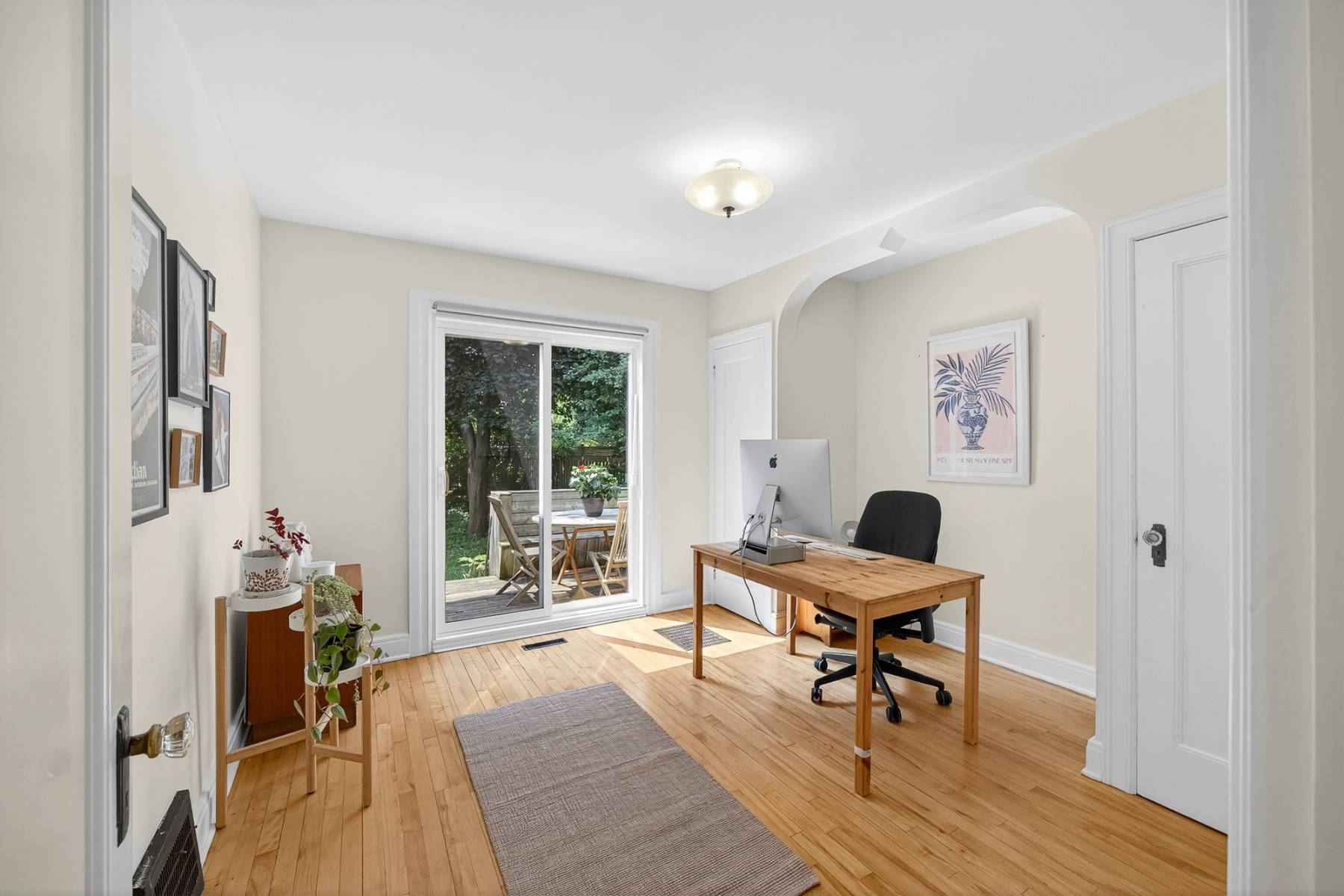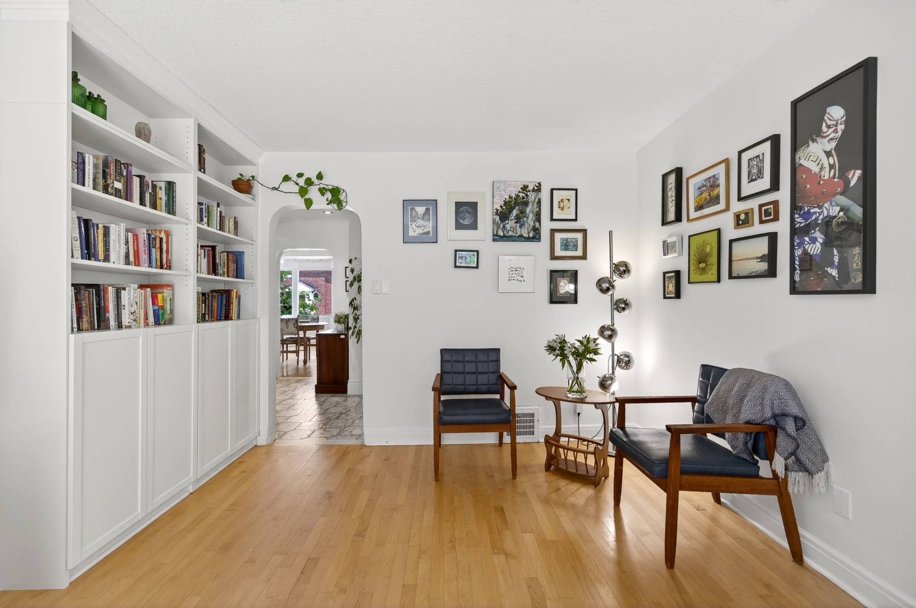 A main floor den with its own full bathroom offers flexibility as a home office, guest room, or additional bedroom, with views of the garden. Wood floors and oversized windows bring warmth and character to the principal rooms.