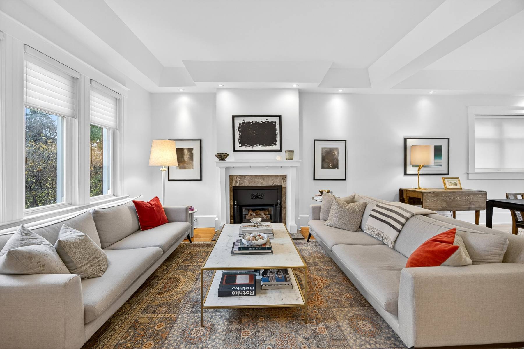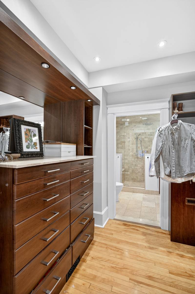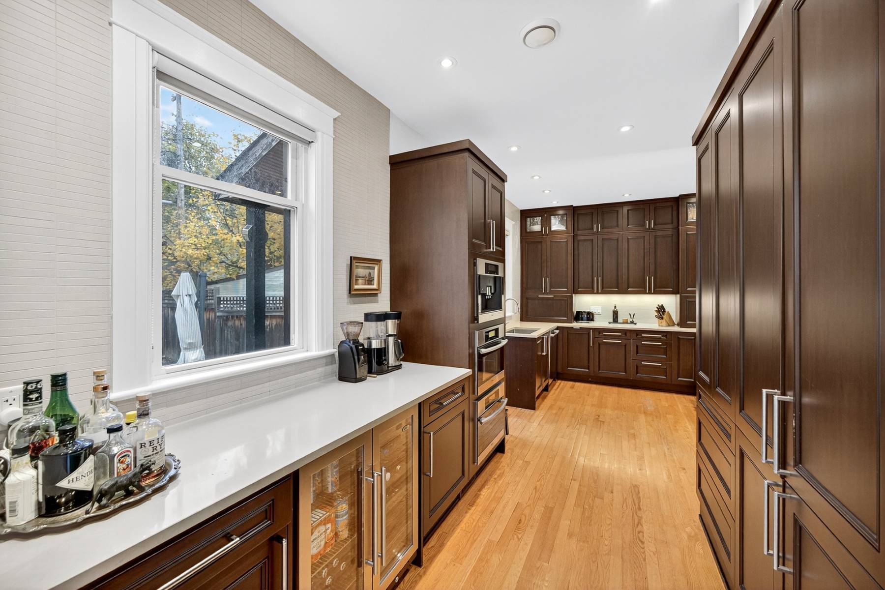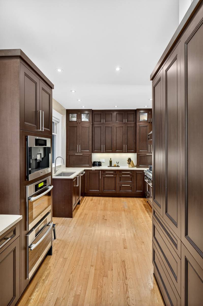 Main floor study/office. Oak floors throughout, coffered high ceilings. Sun flooded gourmet kitchen with top-of-the-line appliances, excellent cabinet and counter space, quartz counters, all viewing the large private backyard. The main floor powder room provides convenience. Second floor is comprised of the primary bedroom with dressing room/vanity area, fully organized walk-in closet and a spa-like ensuite, additional bedroom, laundry room, and a large full bathroom.