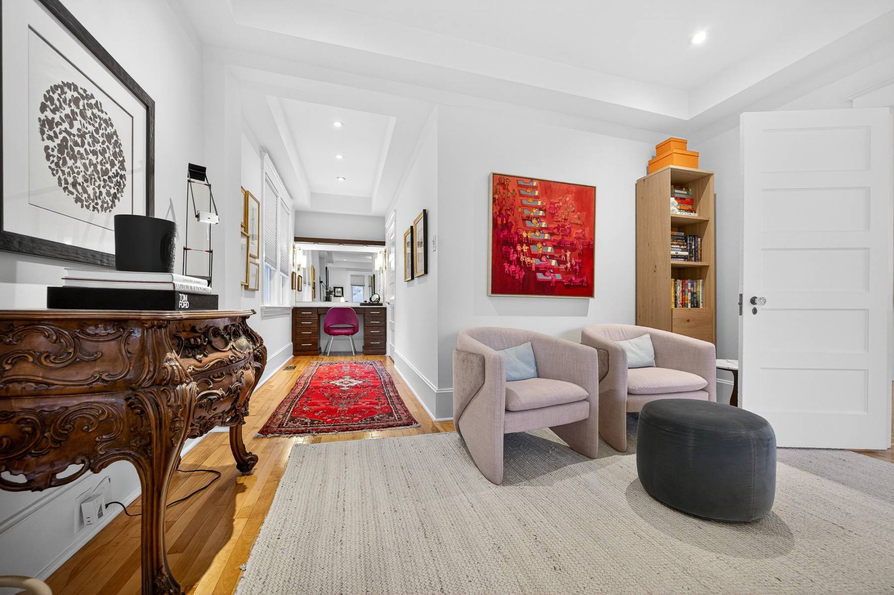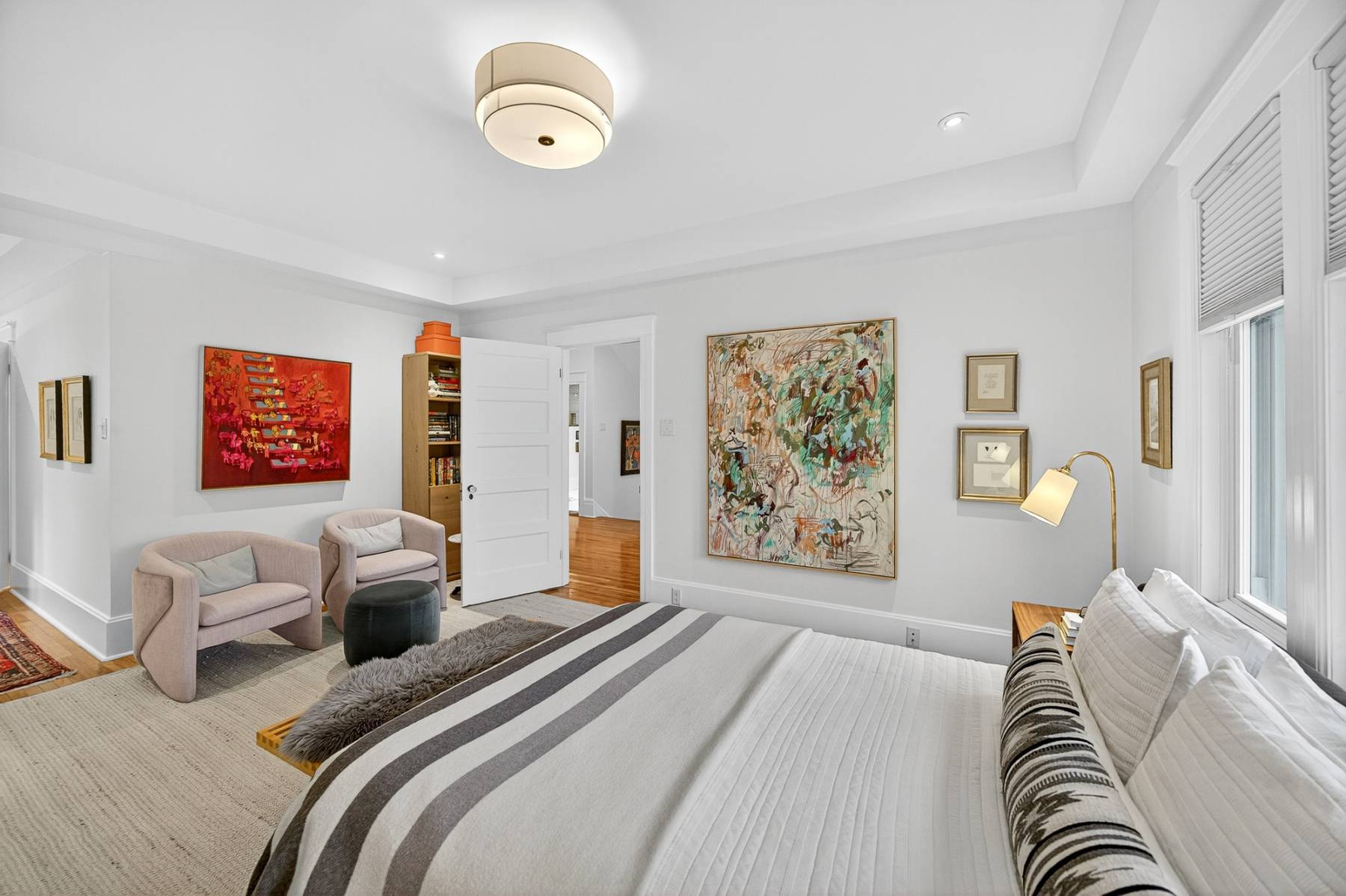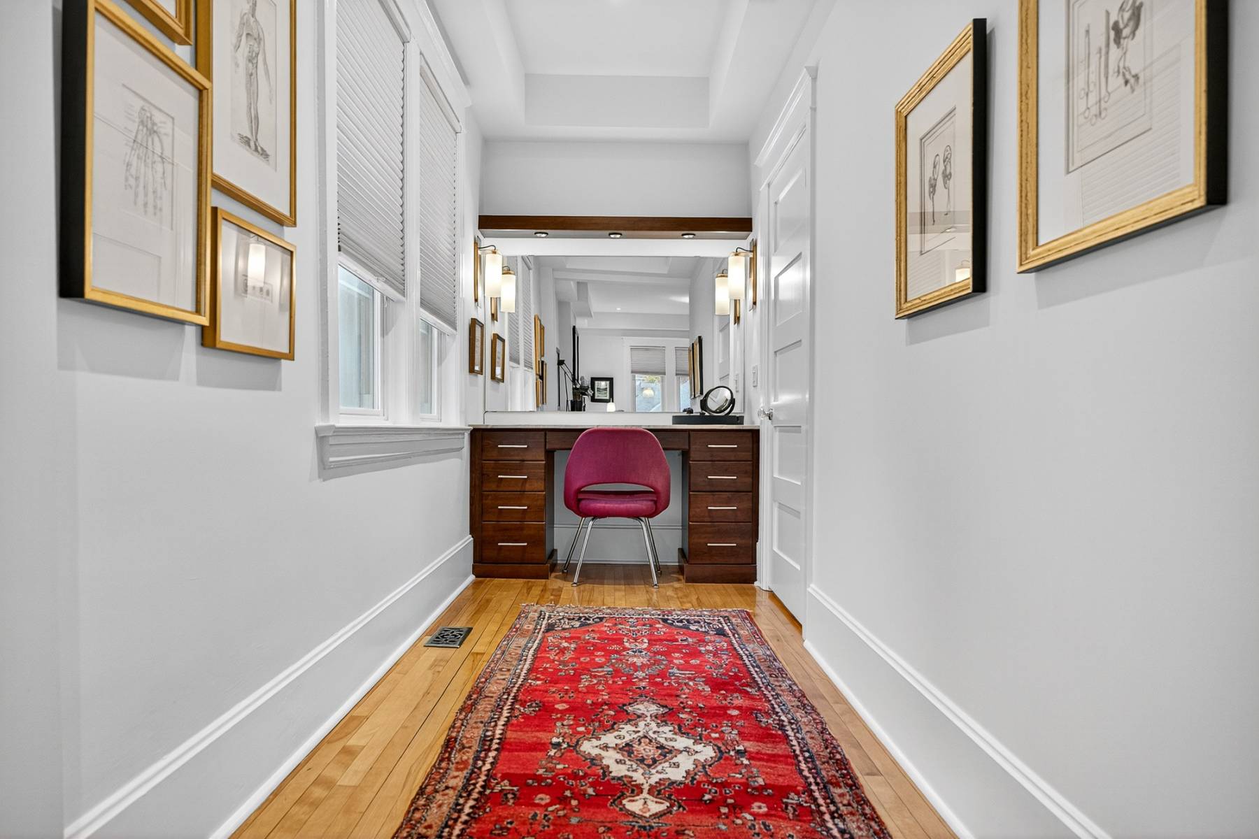 Main floor study/office. Oak floors throughout, coffered high ceilings. Sun flooded gourmet kitchen with top-of-the-line appliances, excellent cabinet and counter space, quartz counters, all viewing the large private backyard. The main floor powder room provides convenience. Second floor is comprised of the primary bedroom with dressing room/vanity area, fully organized walk-in closet and a spa-like ensuite, additional bedroom, laundry room, and a large full bathroom.