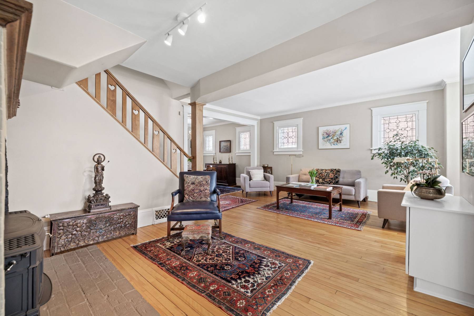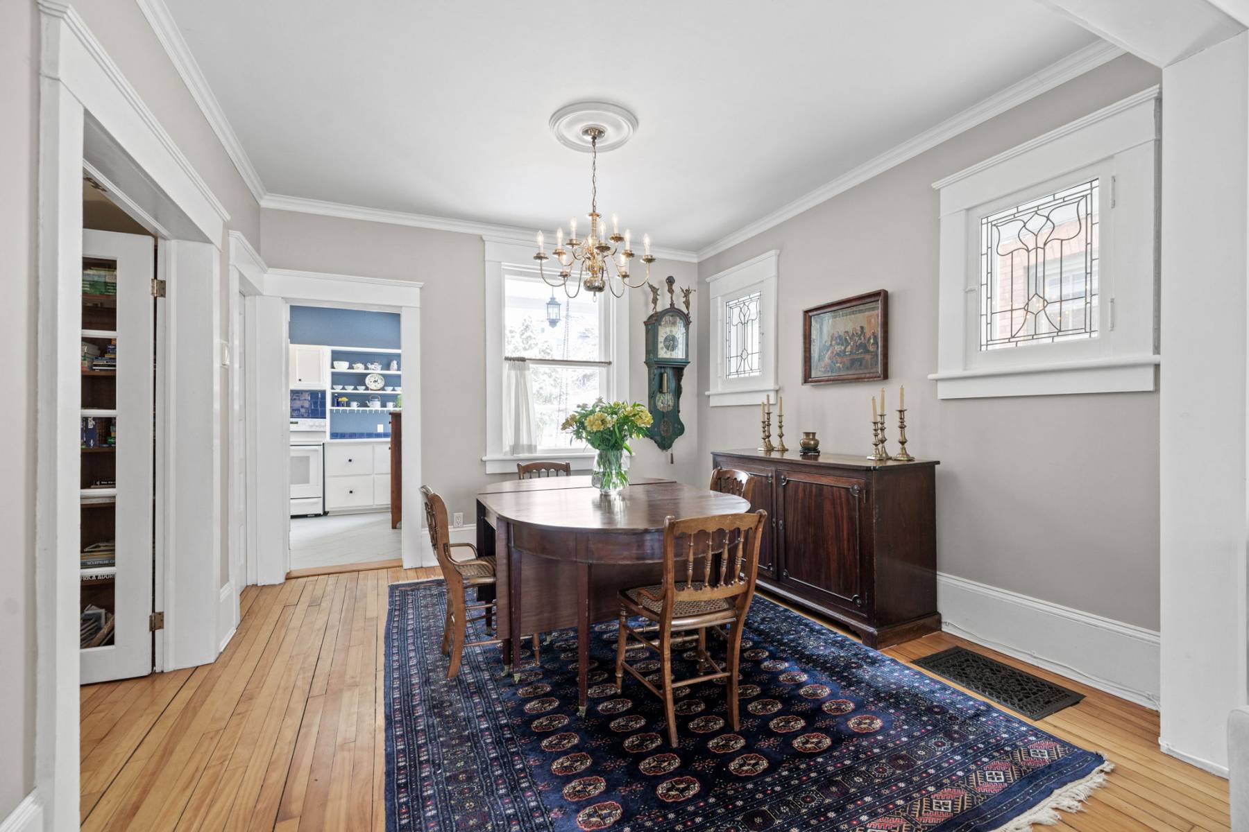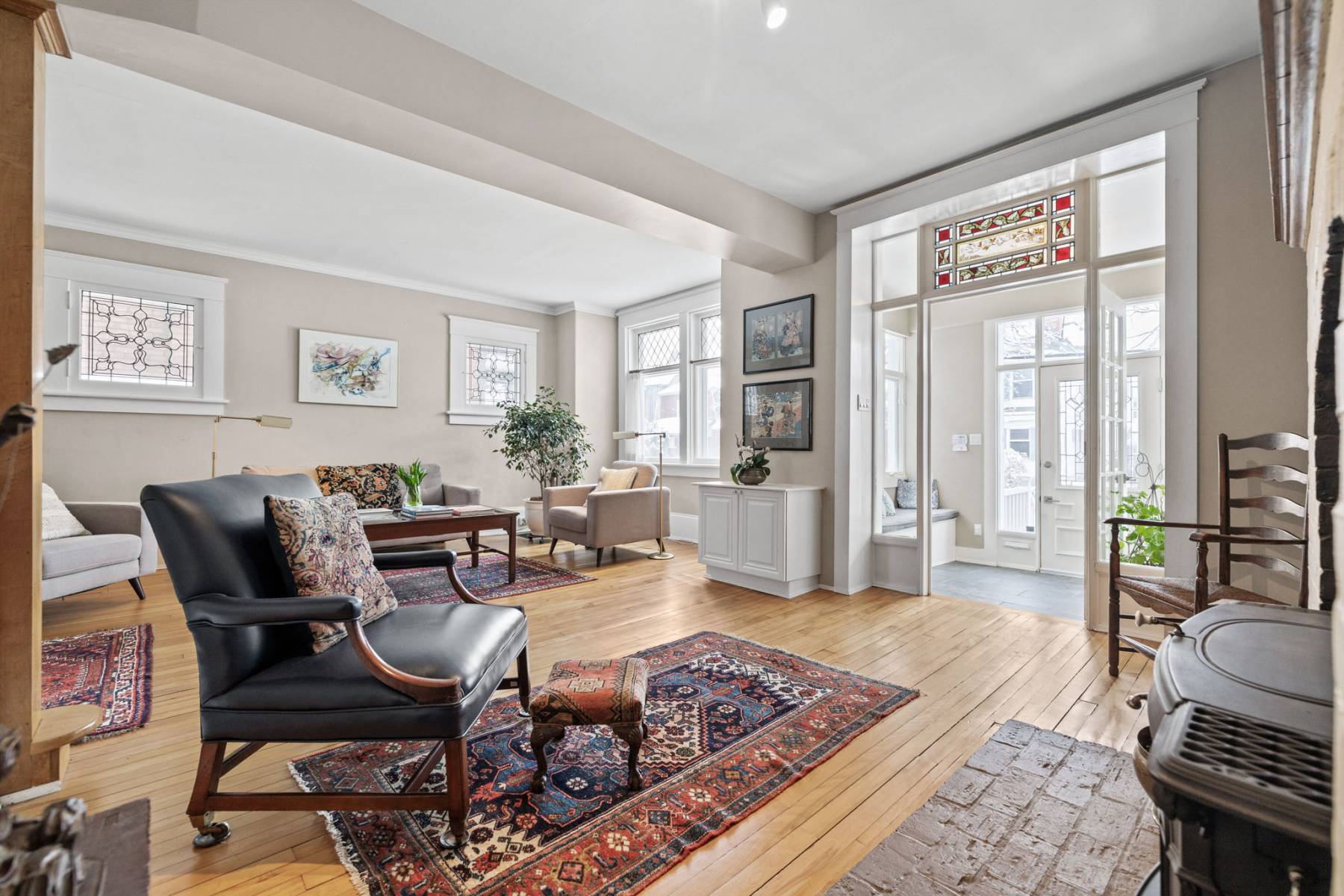 Step inside, and you’ll immediately feel the inviting ambiance. Sunlight streams through large beveled and leaded glass windows, highlighting the home’s high ceilings, rich wood floors, elegant trim, and high baseboards—hallmarks of its timeless appeal.
