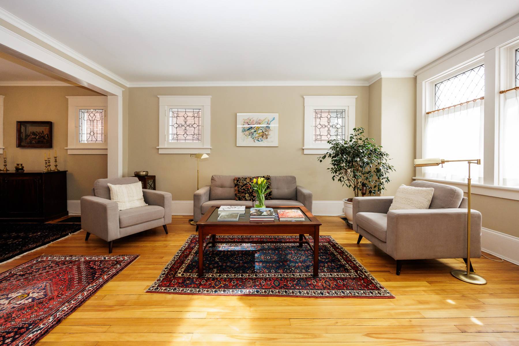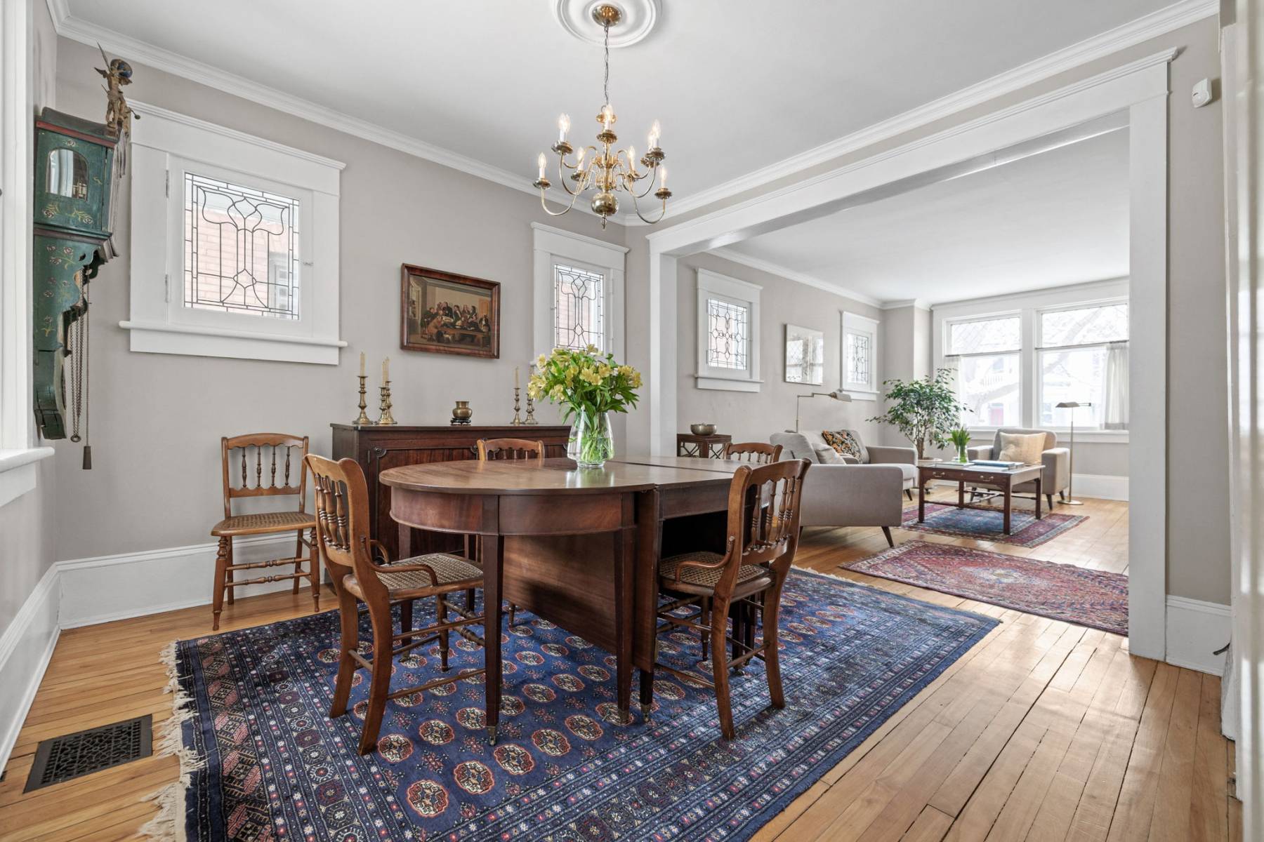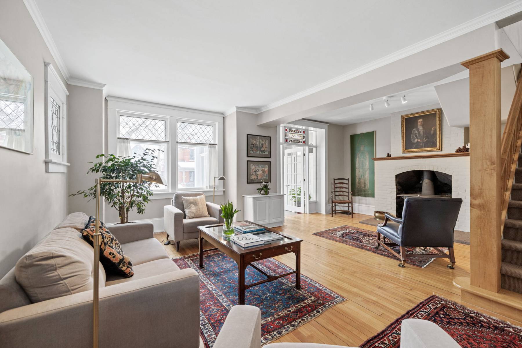 Step inside, and you’ll immediately feel the inviting ambiance. Sunlight streams through large beveled and leaded glass windows, highlighting the home’s high ceilings, rich wood floors, elegant trim, and high baseboards—hallmarks of its timeless appeal.