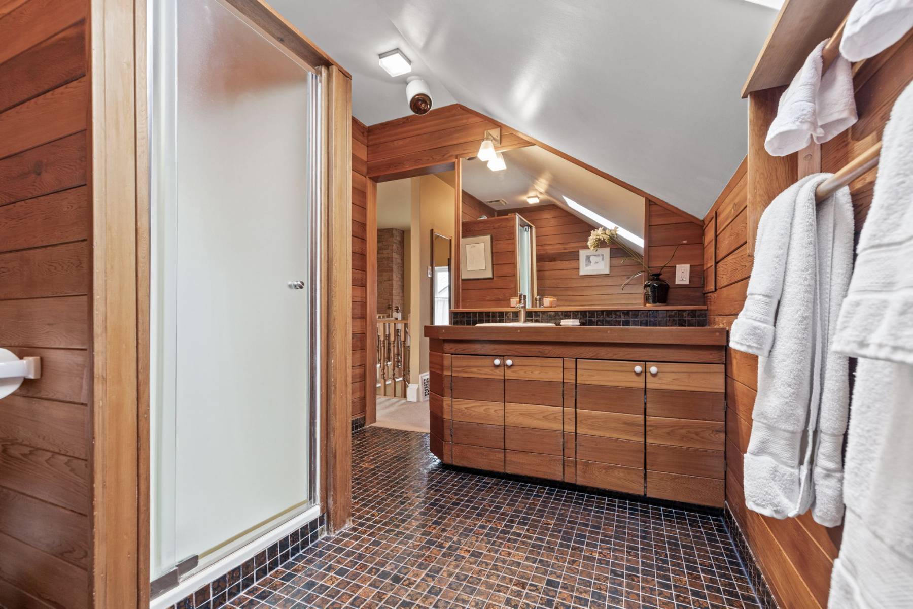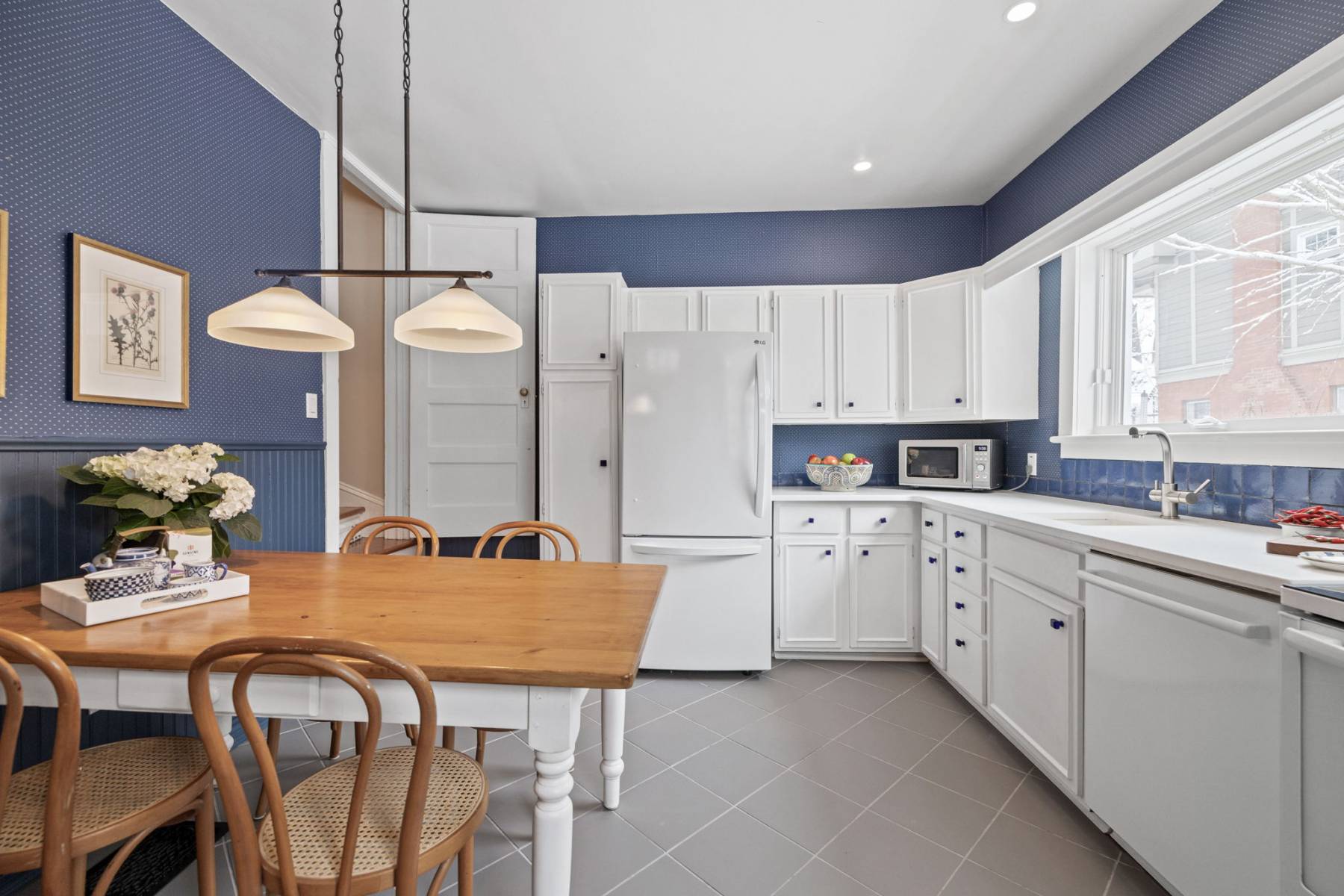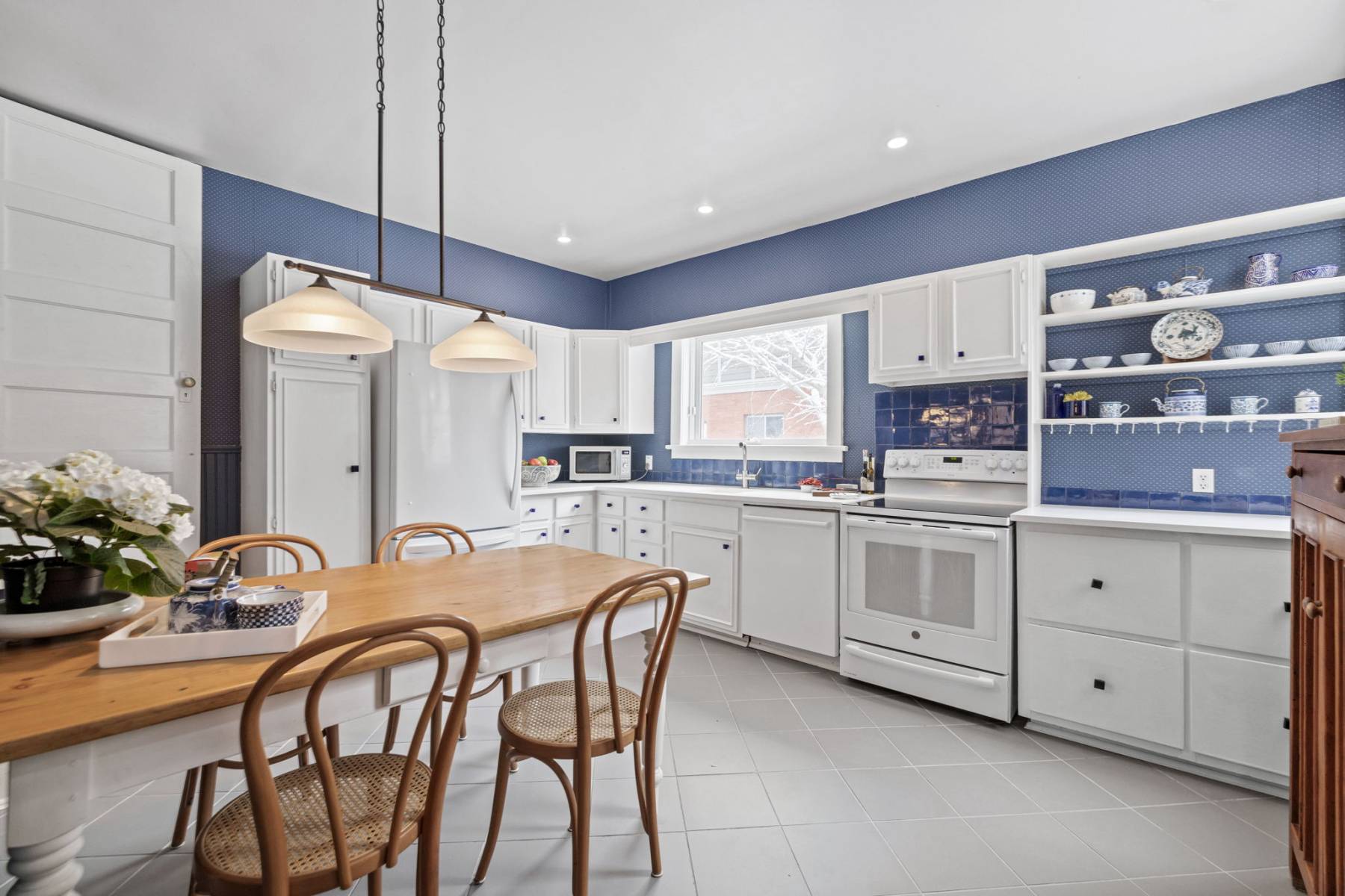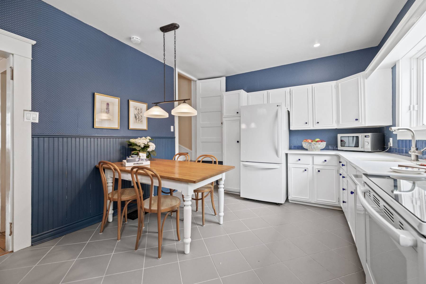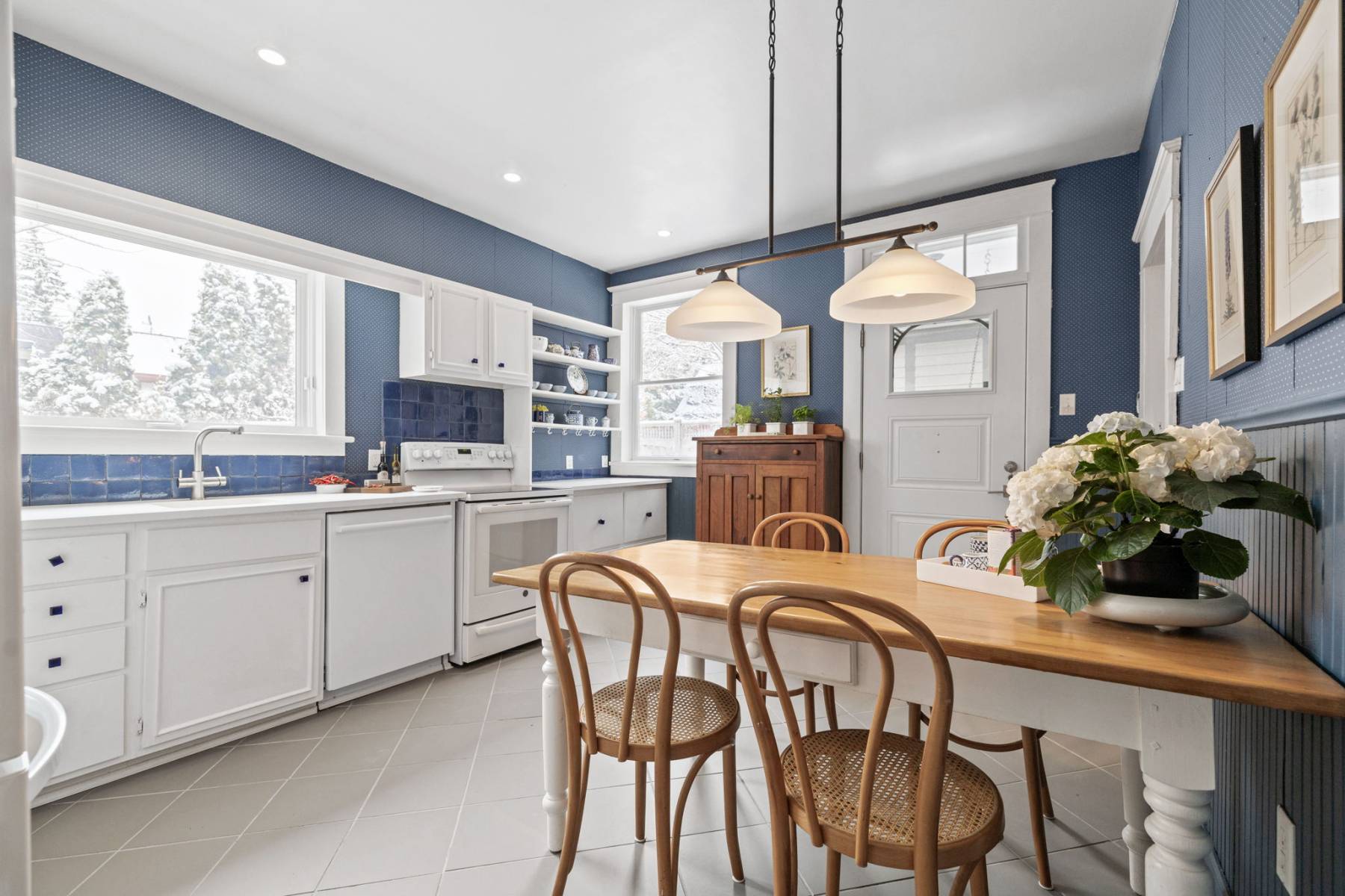 At the heart of the home is the kitchen—a welcoming space where family and friends gather. With plenty of room for conversation and meal preparation, it’s designed for both function and connection. A side entrance leads to the private garden, flagstone walkways, and parking area, with access via a wide rear lane.