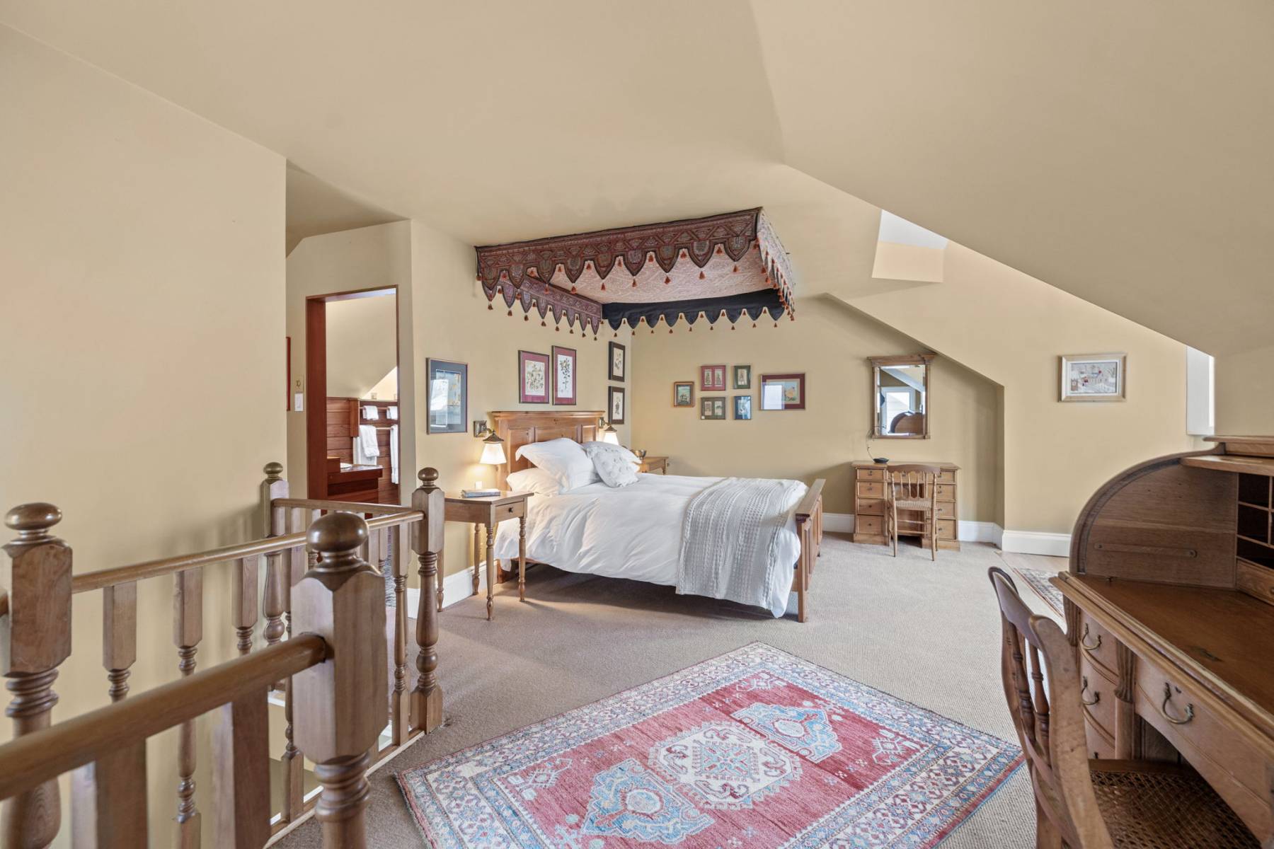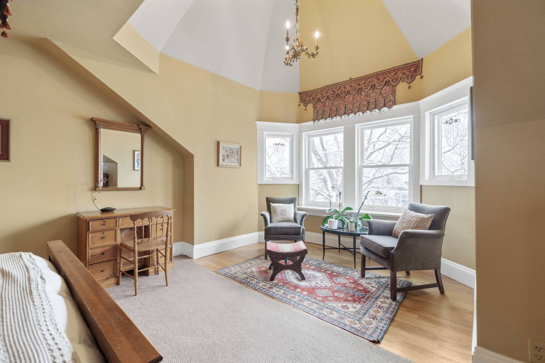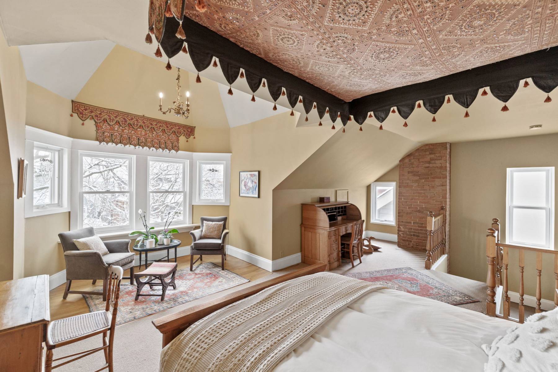 The third-floor primary suite is an impressive retreat, featuring a private ensuite, dressing area, and a sun-filled sitting space with  treetop views. A high, pavilion-style ceiling adds to the room’s unique charm.