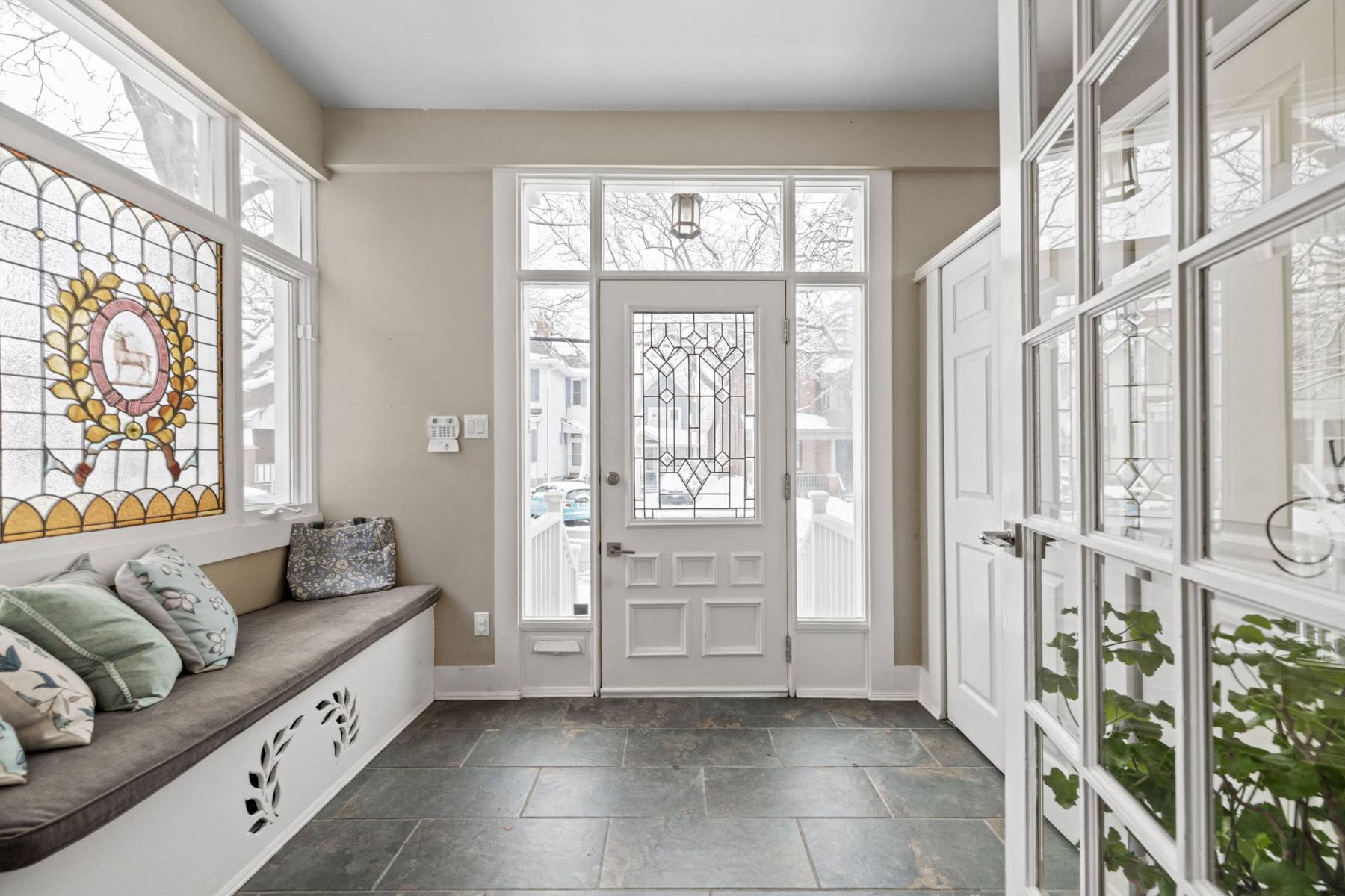 The main floor is designed for both comfort and entertaining. The foyer is a true showpiece, featuring walls of closets and windows, stained glass, and a built-in banquet—a gracious entrance that sets the tone for the rest of the home.