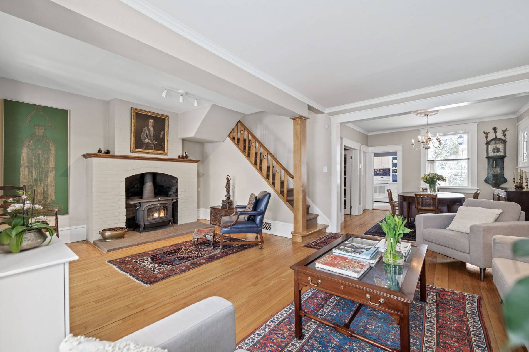 The expansive living room offers a cozy sitting area around a wood-burning fireplace. An original wood banister acts as a back drop to the space.  While the main living room area provides a handsome space accented by beveled glass windows.  The formal dining room, open to the main living area, flows effortlessly into the den/office, accessible via French doors, as well as a convenient main-floor powder room.