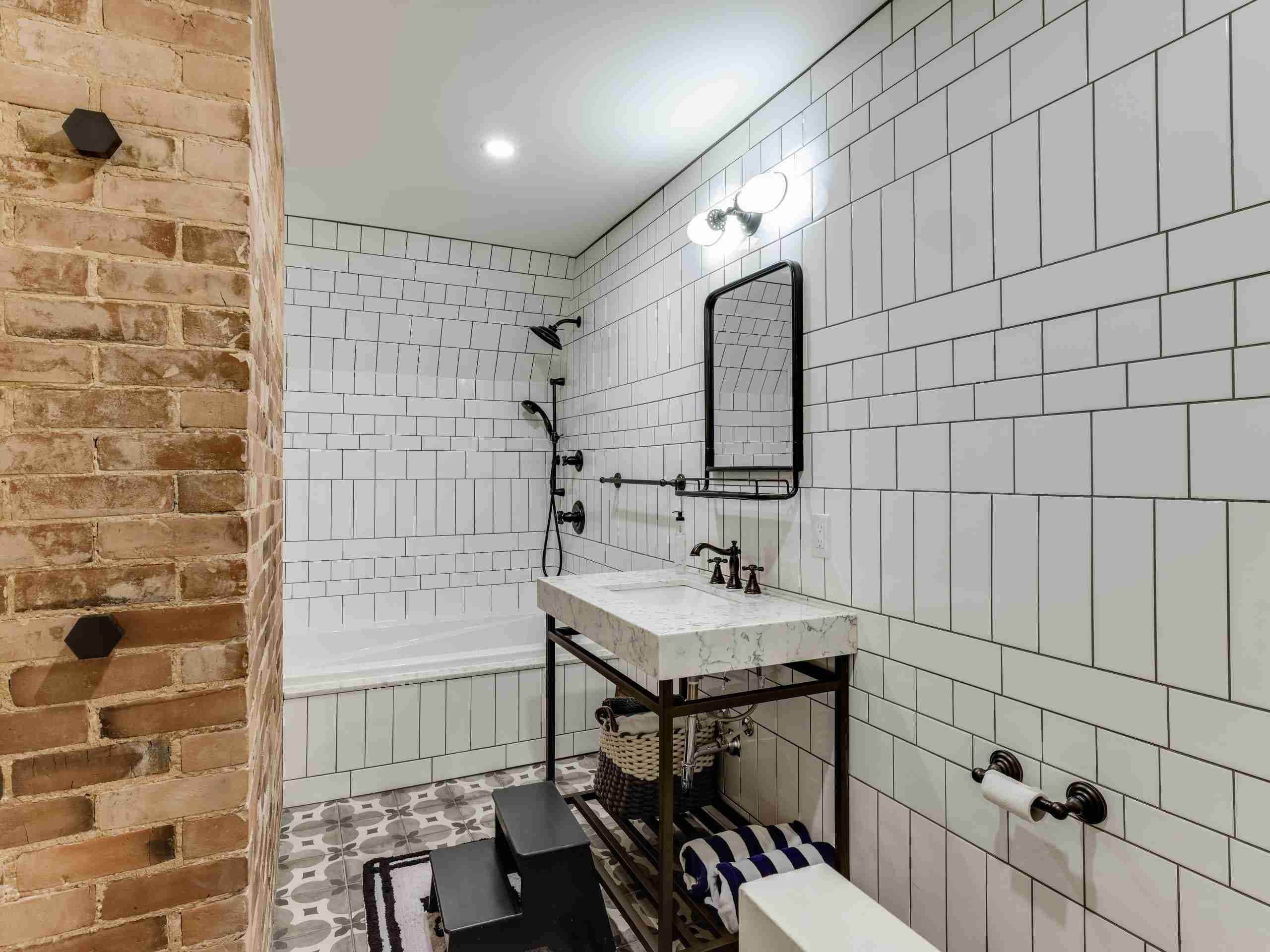 Two large bedrooms. Also perfect for home offices or yoga studio. Lovely natural light with pretty window seating in the alcoves. Between the two bedrooms is a secret passageway. The bathroom is right out of a Paris designer magazine. Tasteful use of the floor to ceiling tile and the metal / marble vanity speak to a luxurious but stylish lifestyle. Whenever possible exposed brick walls where left to accent the spaces.