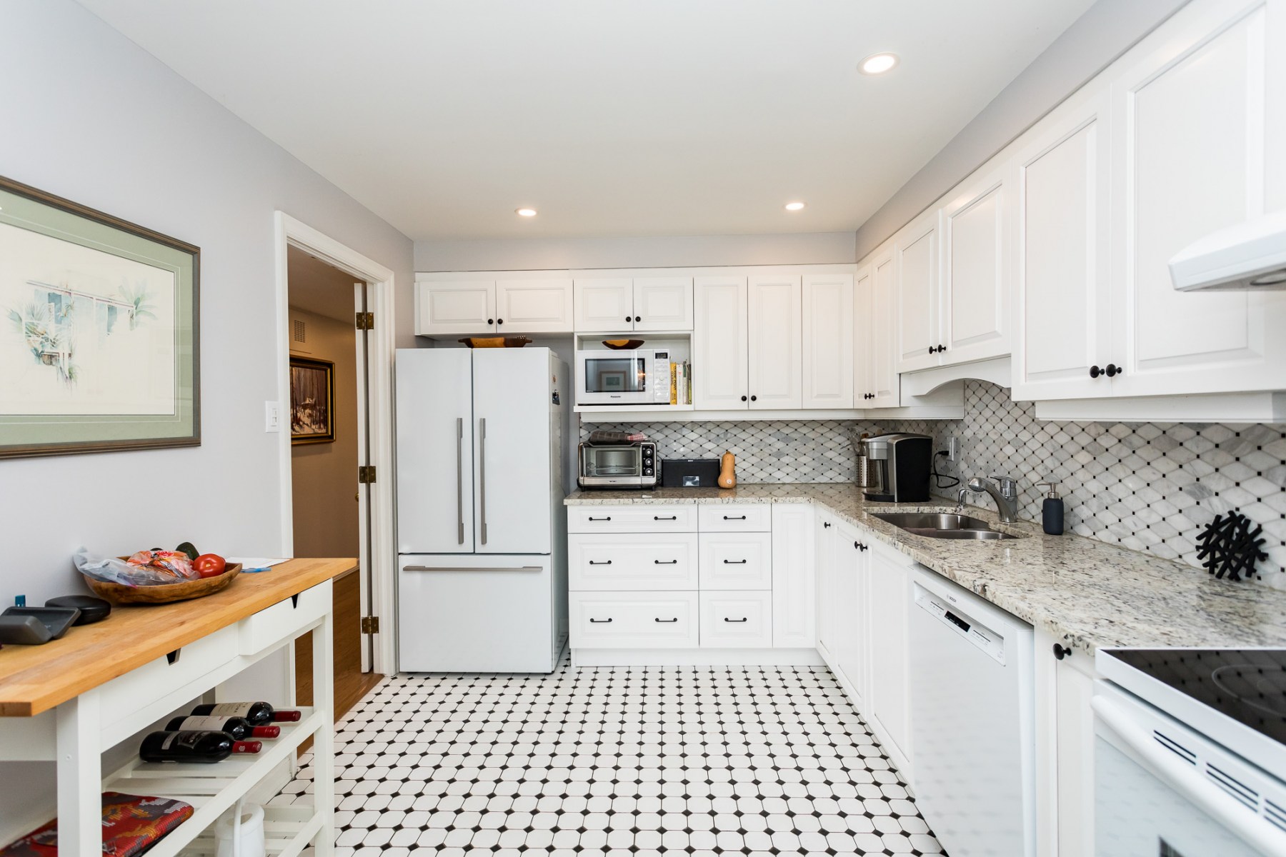 An inviting den, accessible from the foyer, can easily be used as a media room/den or guest bedroom when needed. The large kitchen is perfect for the cook in you, featuring a table area for your morning coffee and boasting recently renovated cabinets in a soothing neutral palette, complemented by quality countertops and a stylish backsplash.