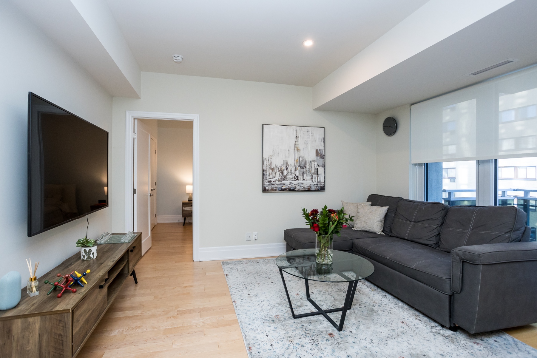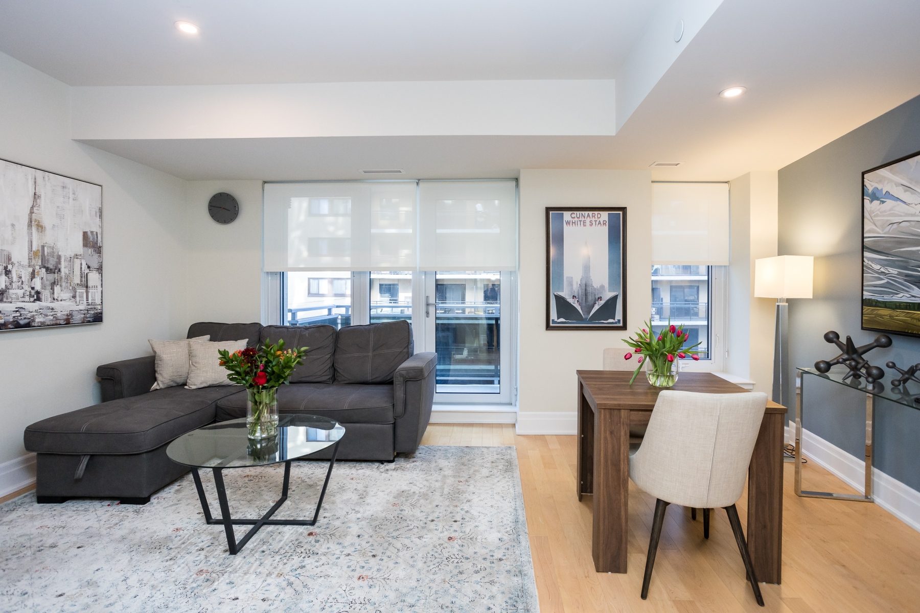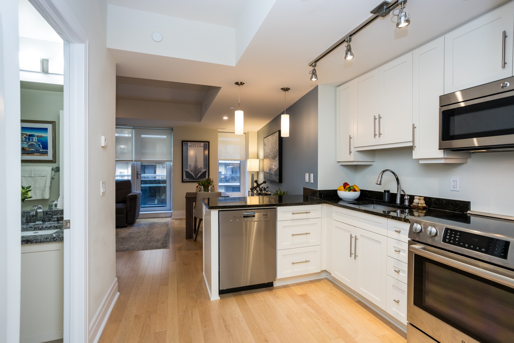 Step into this immaculate one-bedroom loft-style suite providing approximately 710 sq. ft. Ideal for the on-the-go executive, it offers a seamless blend of urban sophistication and functionality. The southern exposure floods the space with natural light, while hardwood floors, brushed steel appliances, and custom window coverings accent the rooms.